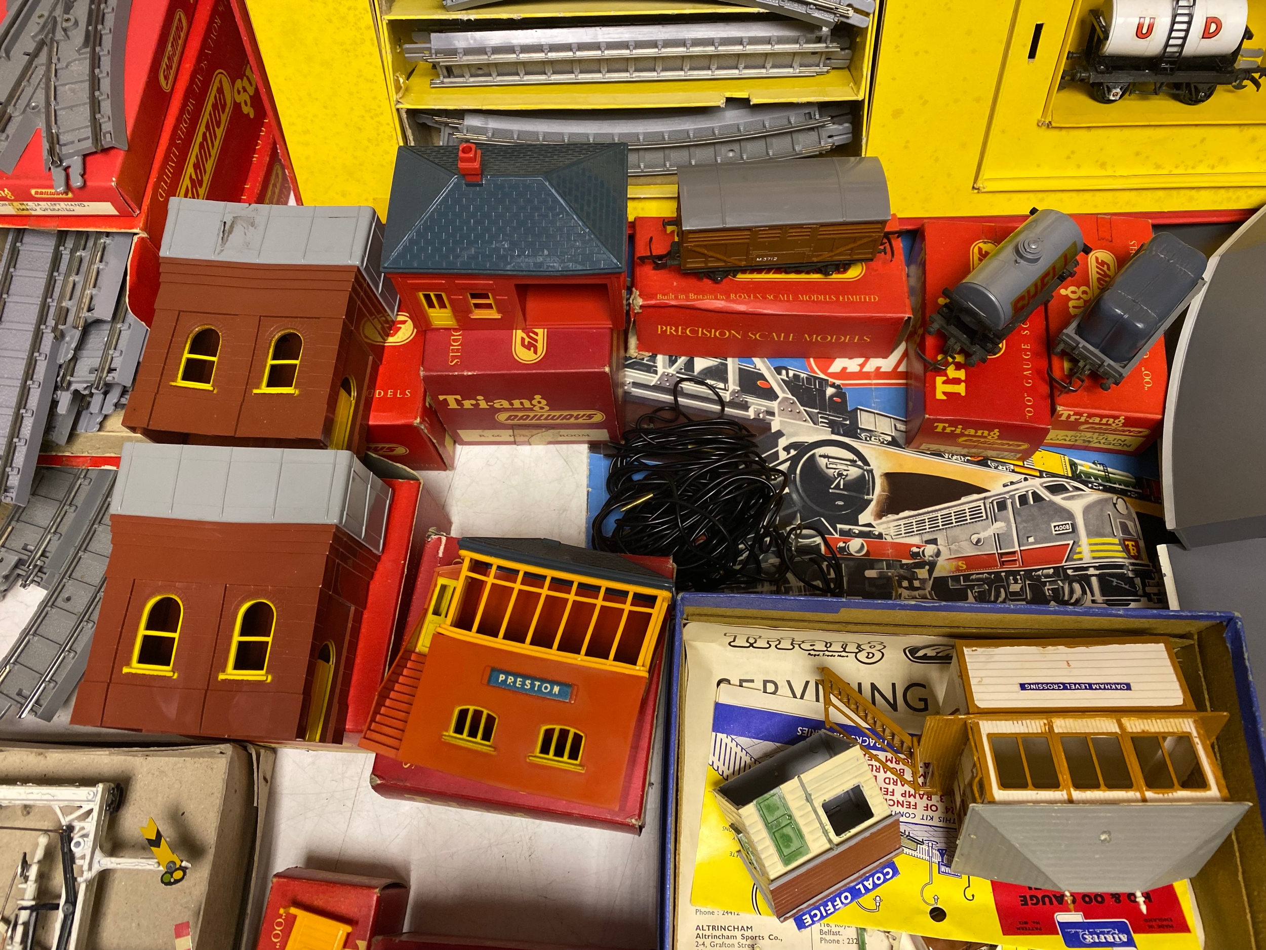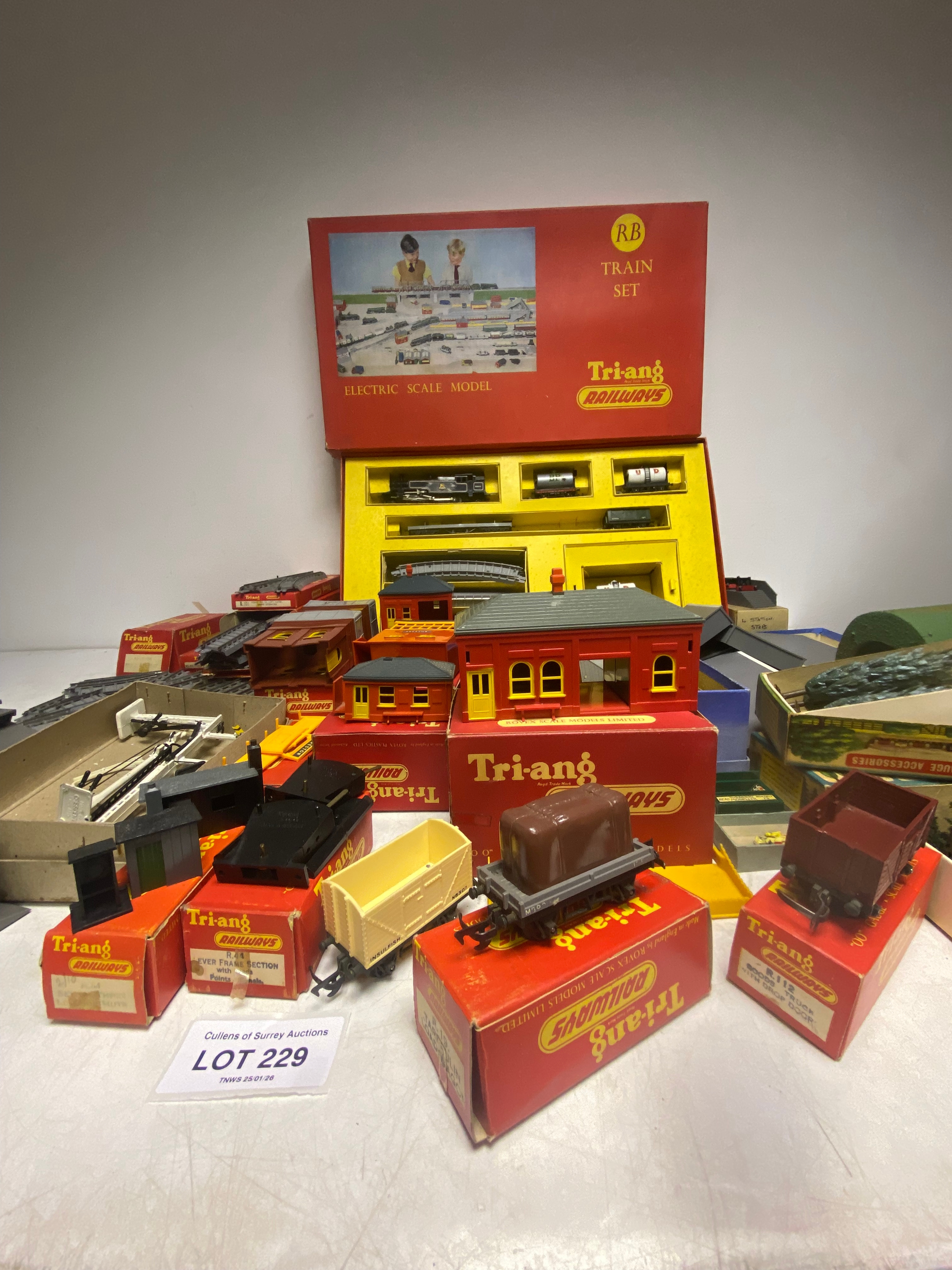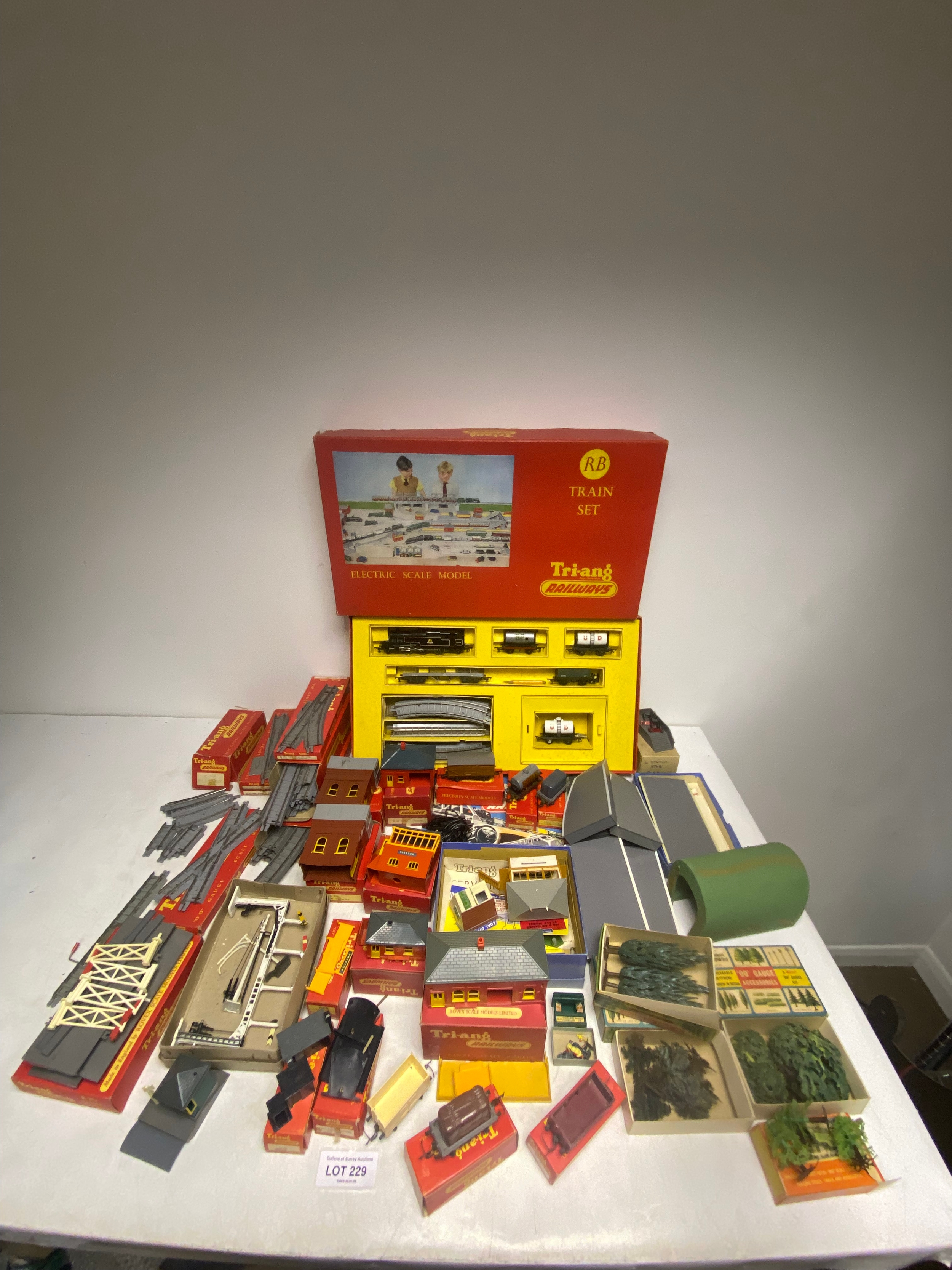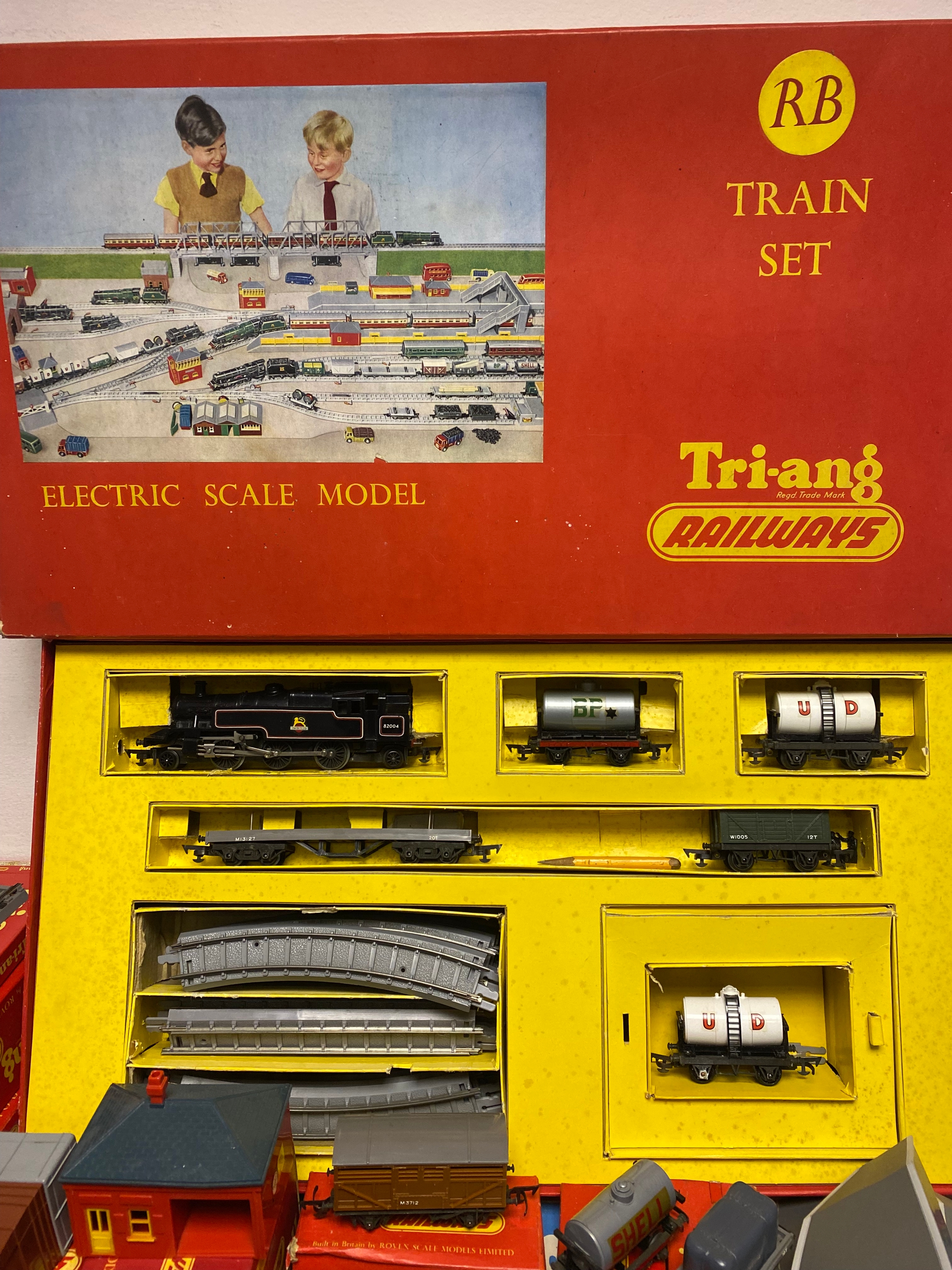 Large collection of boxed Tri-ang Railways including RB Train Set, tracks, terrain, building and carriages.