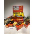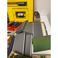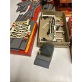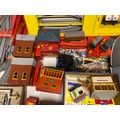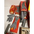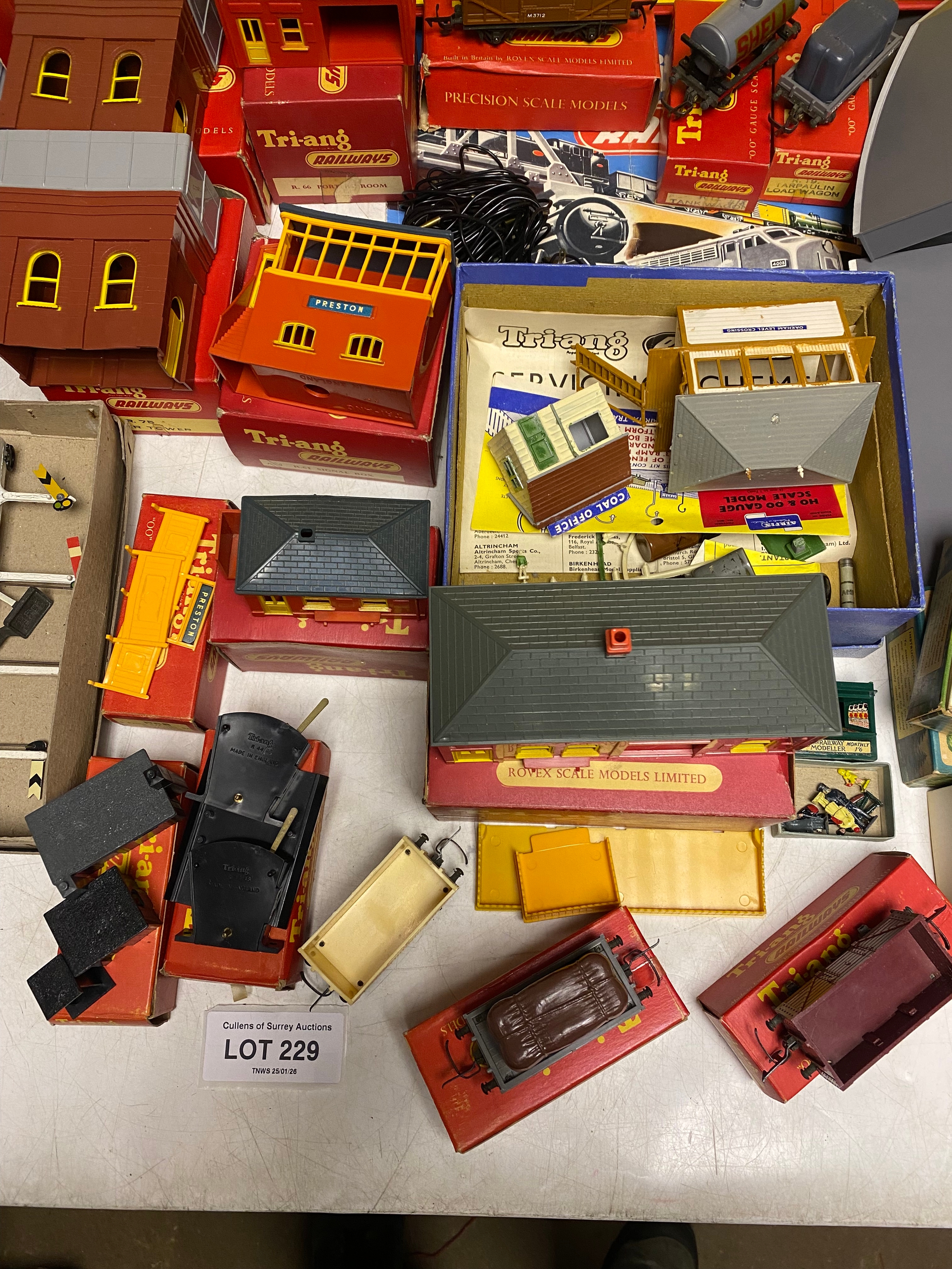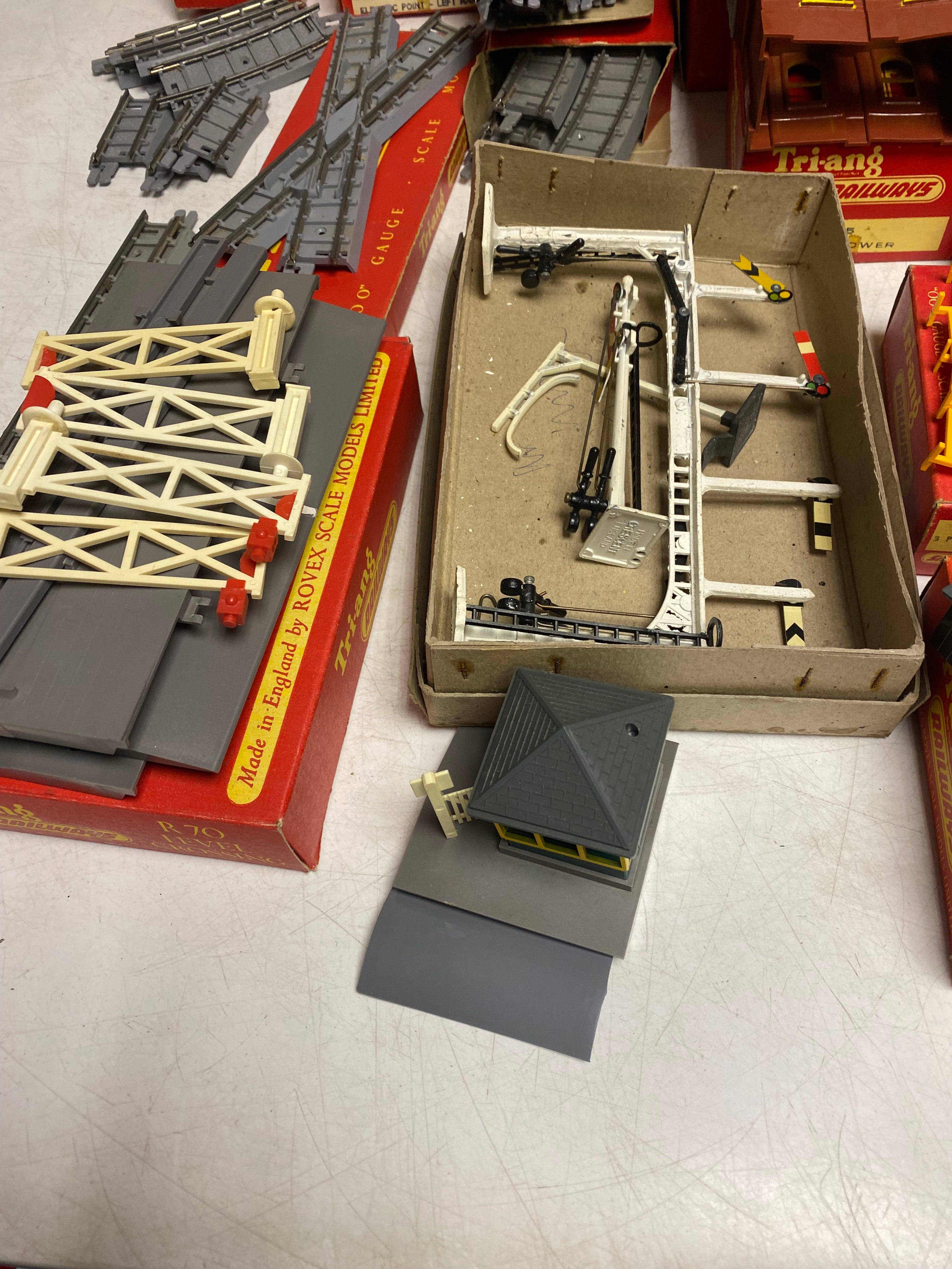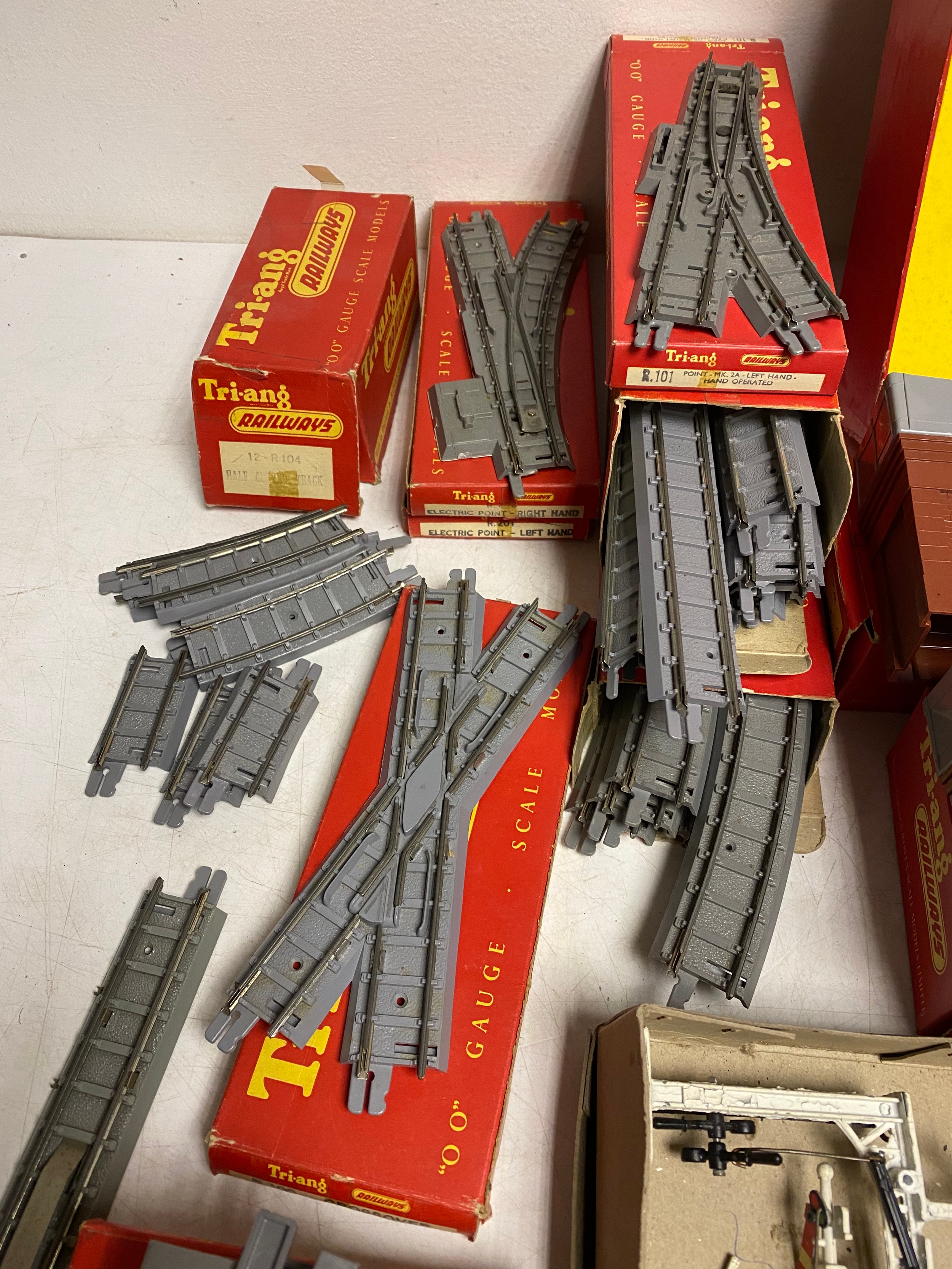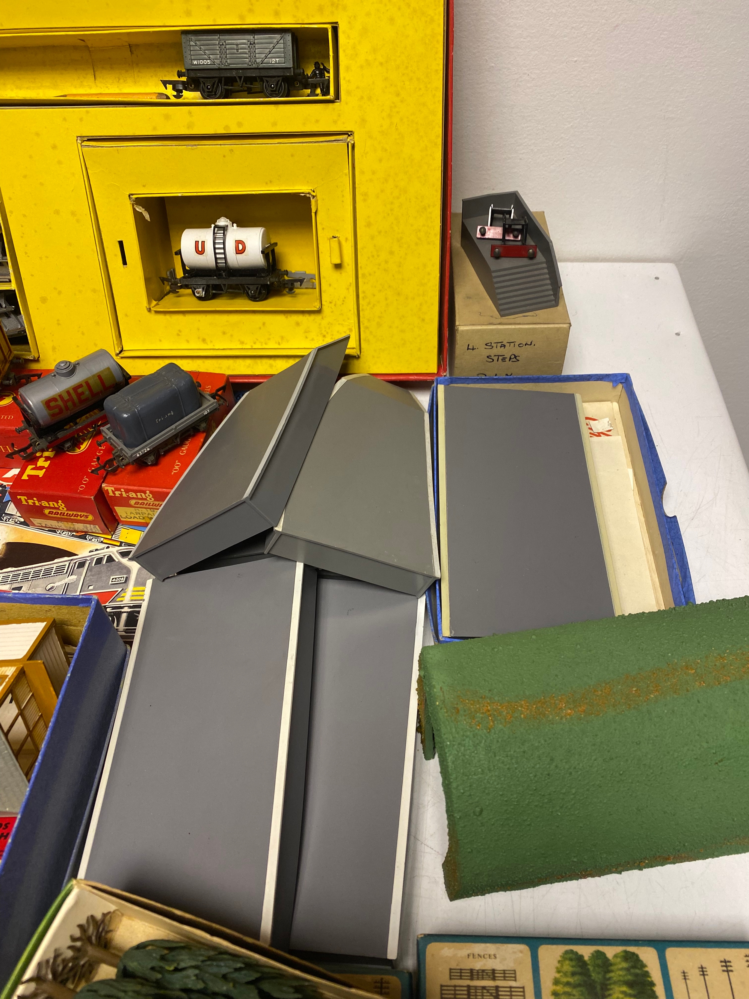 Large collection of boxed Tri-ang Railways including RB Train Set, tracks, terrain, building and carriages.