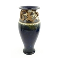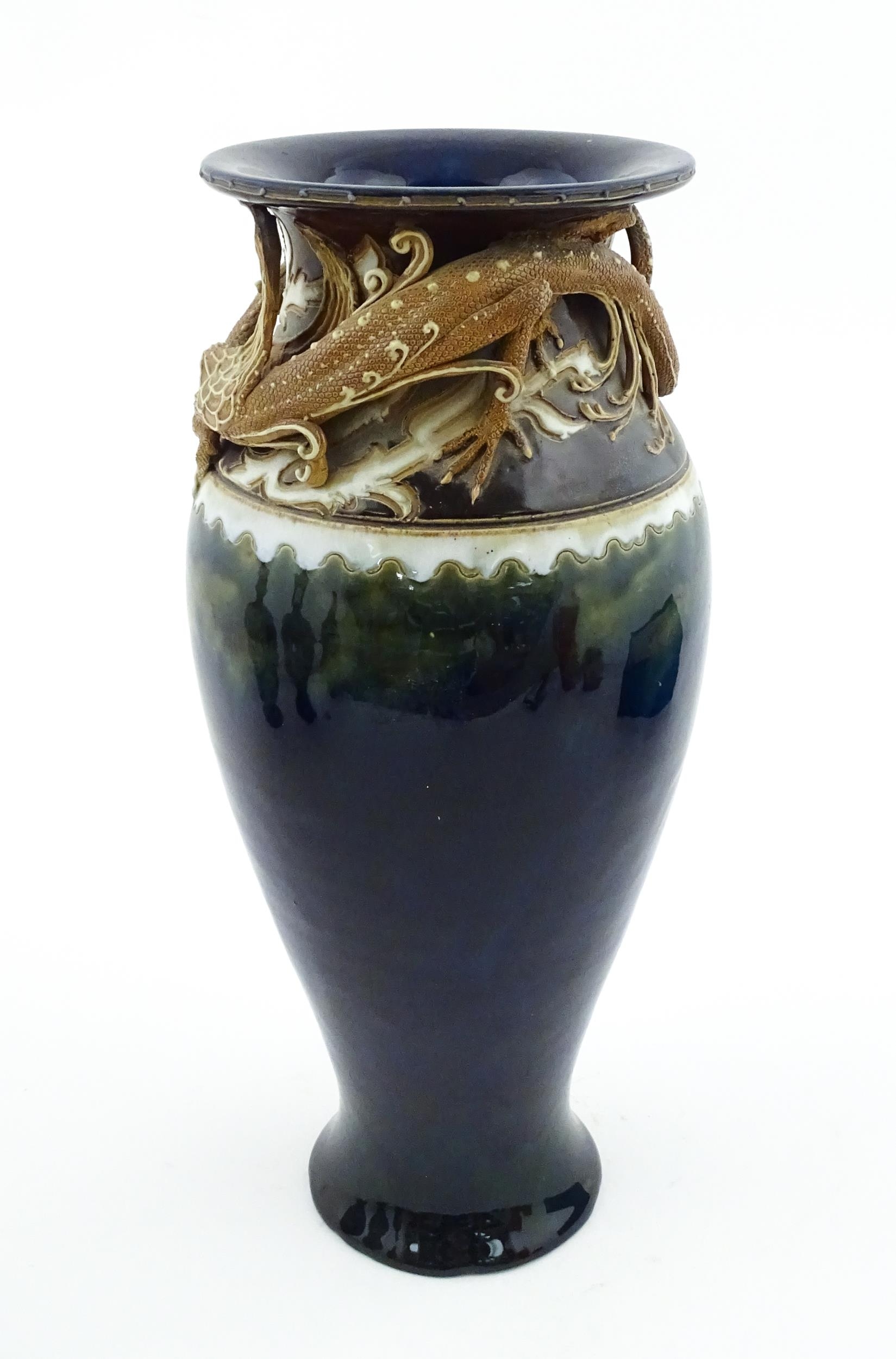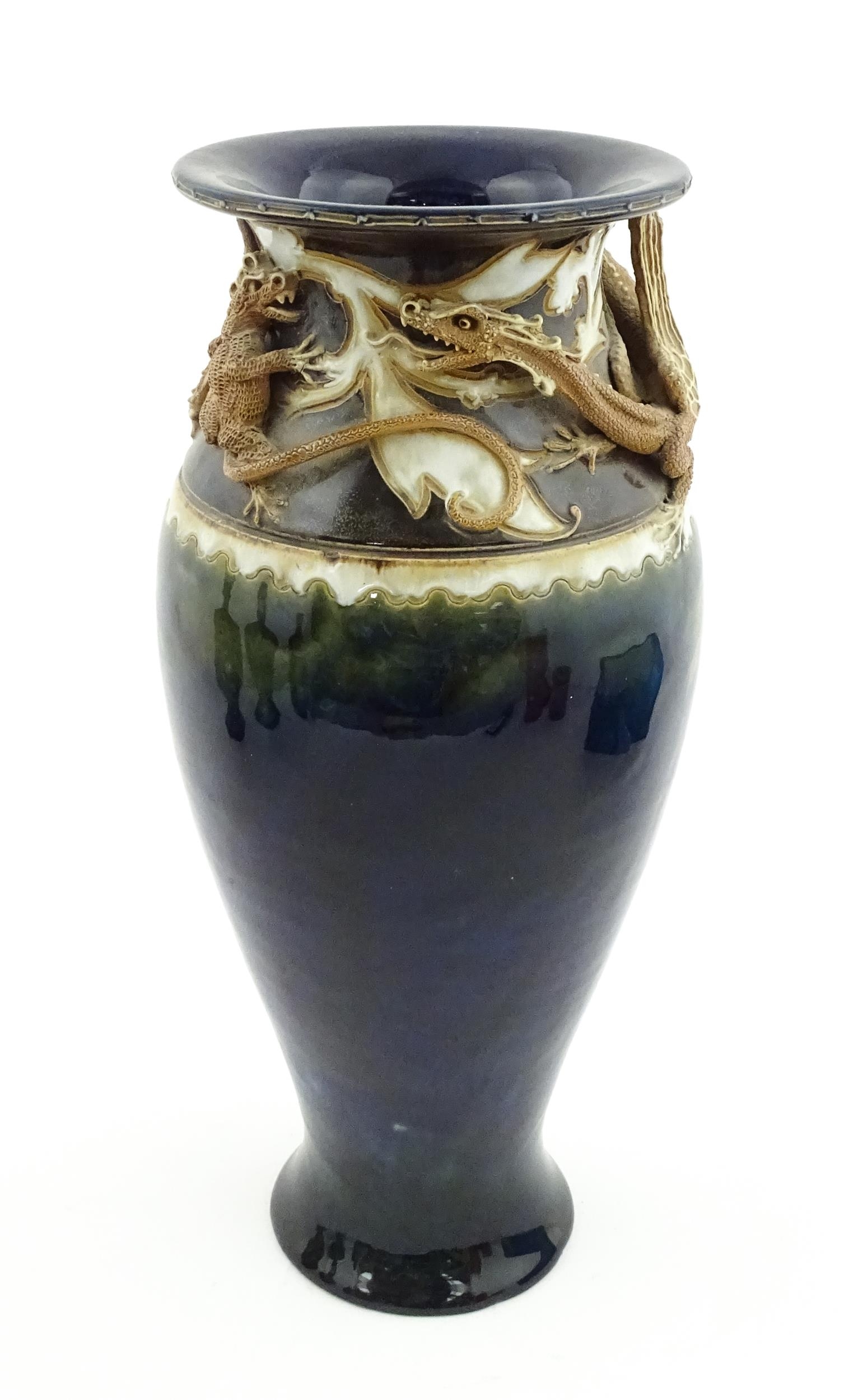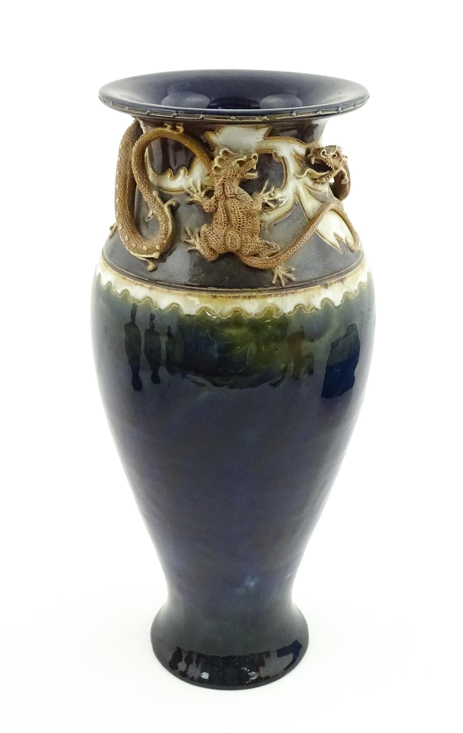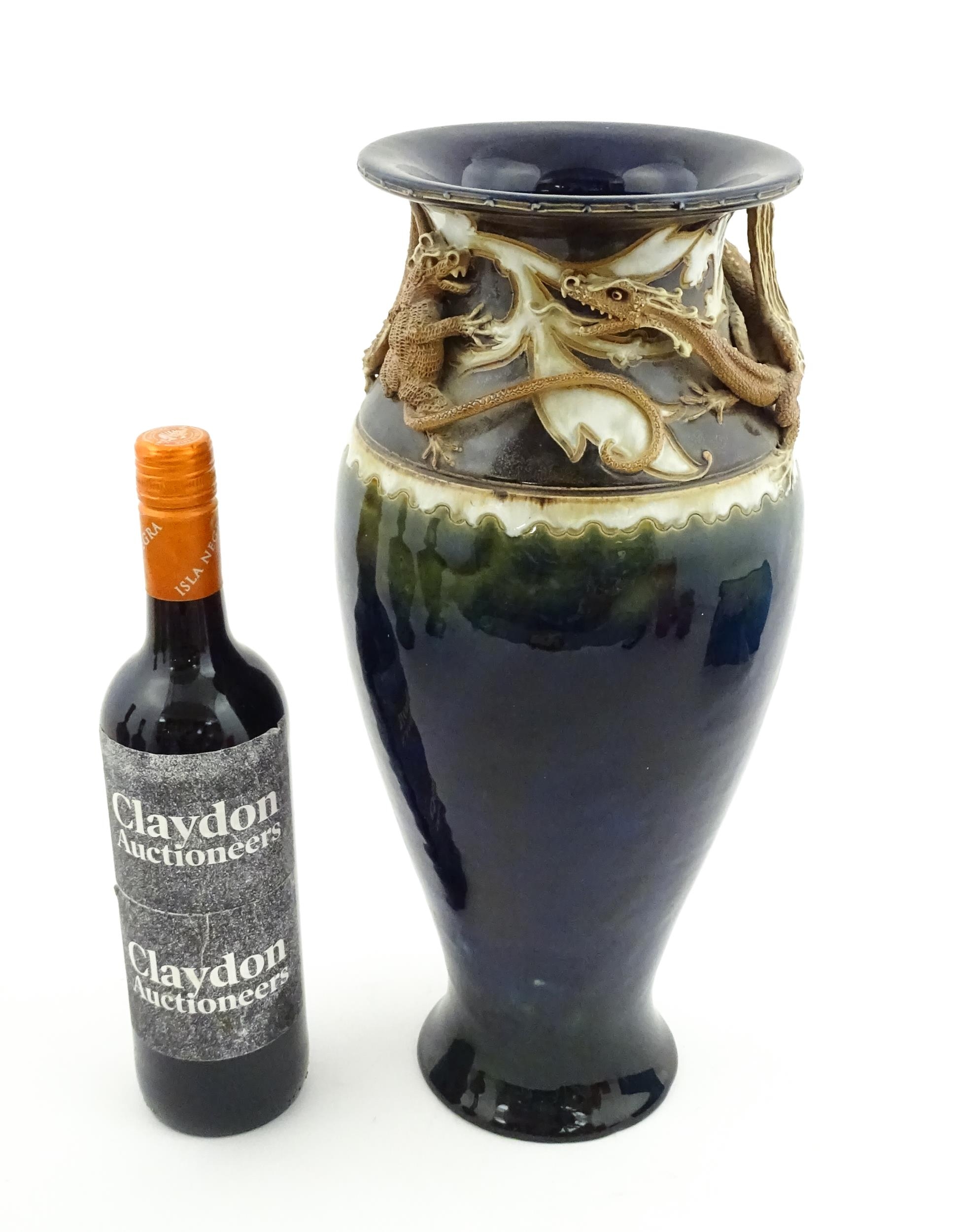 A Royal Doulton vase with blue glaze and high relief dragon decoration to rim by Mark V Marshall. Marked under, impressed Art Union of London, and incised MVM. Approx. 15 3/4" high
