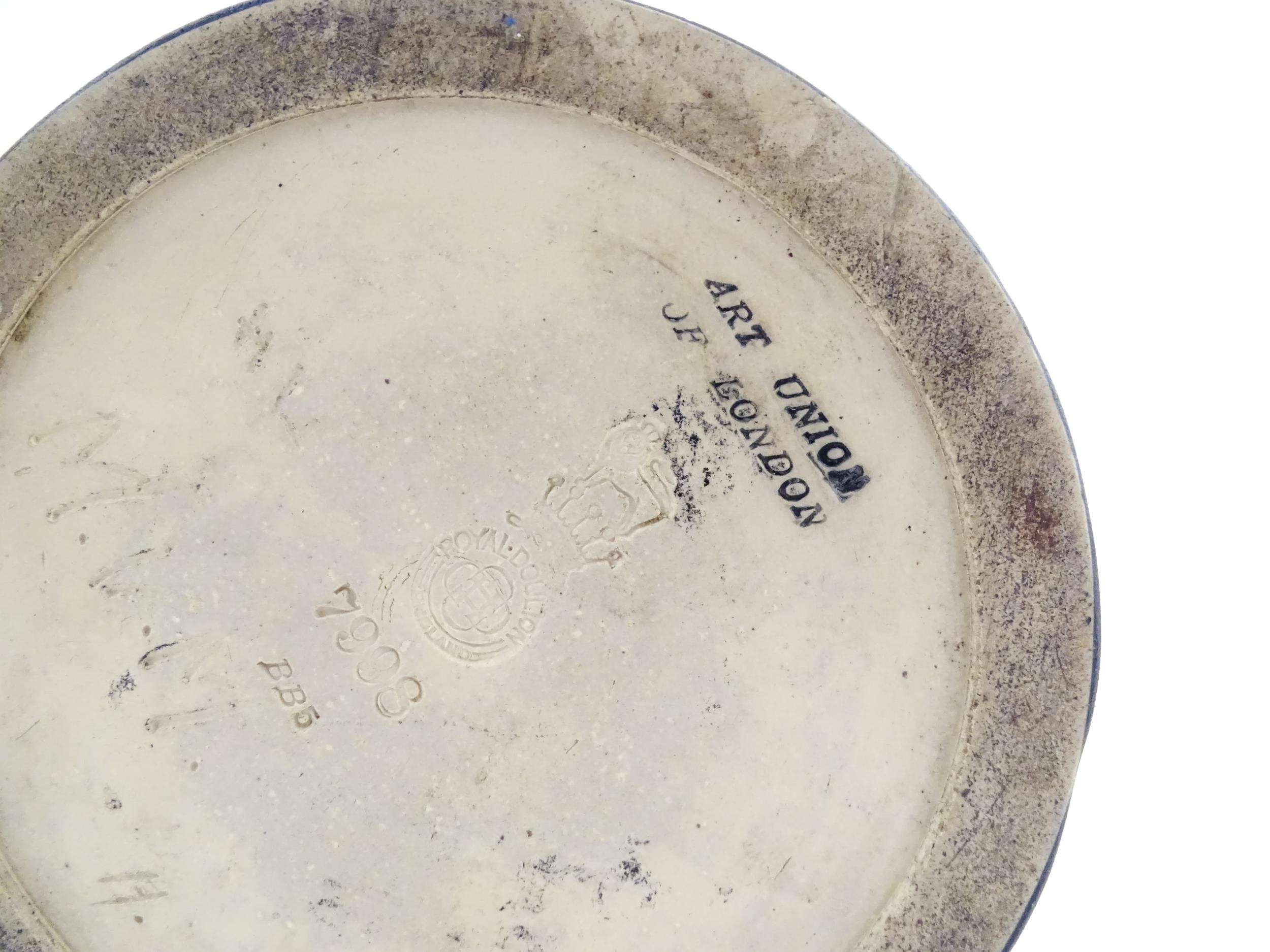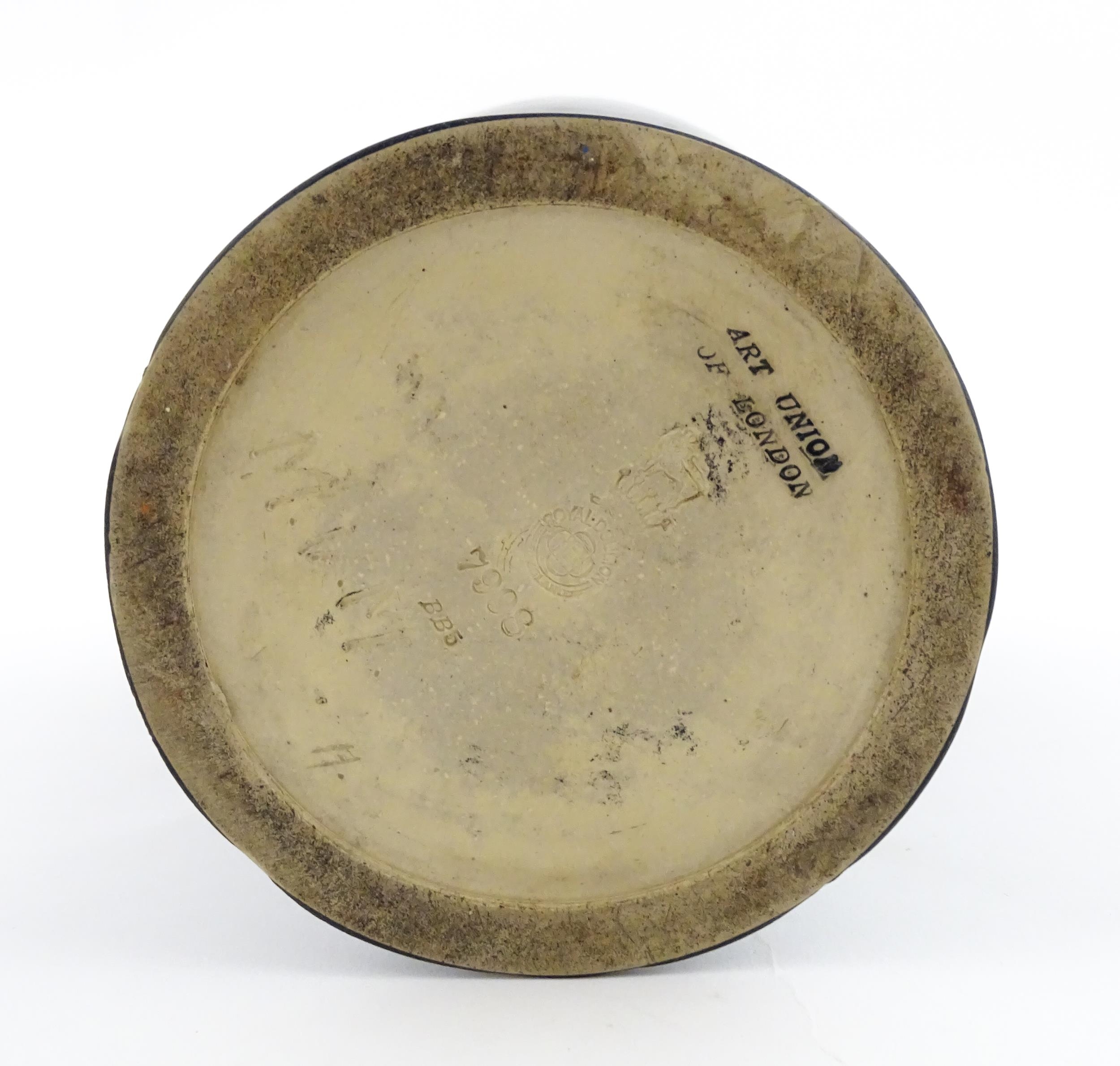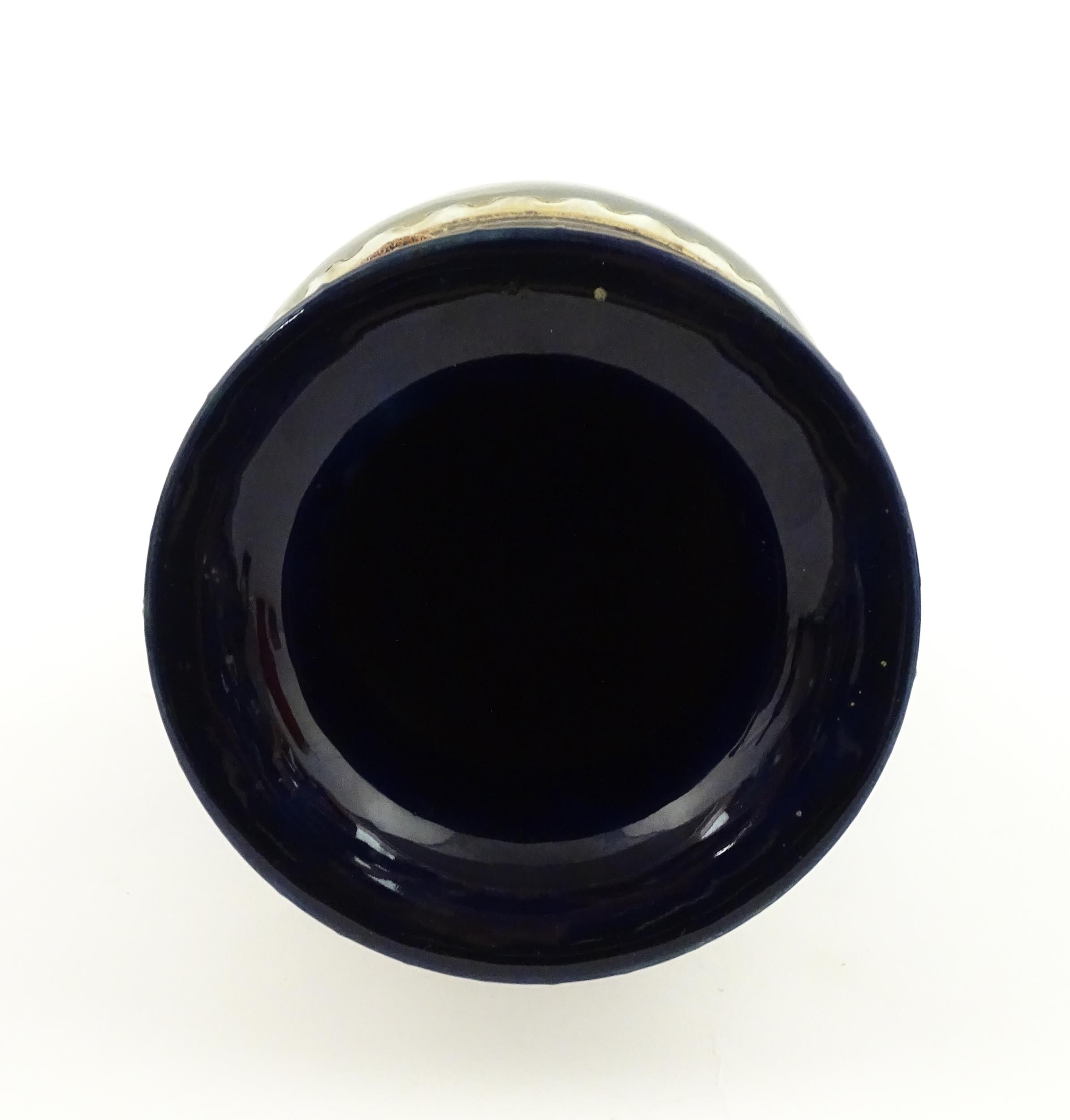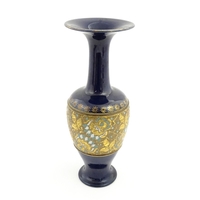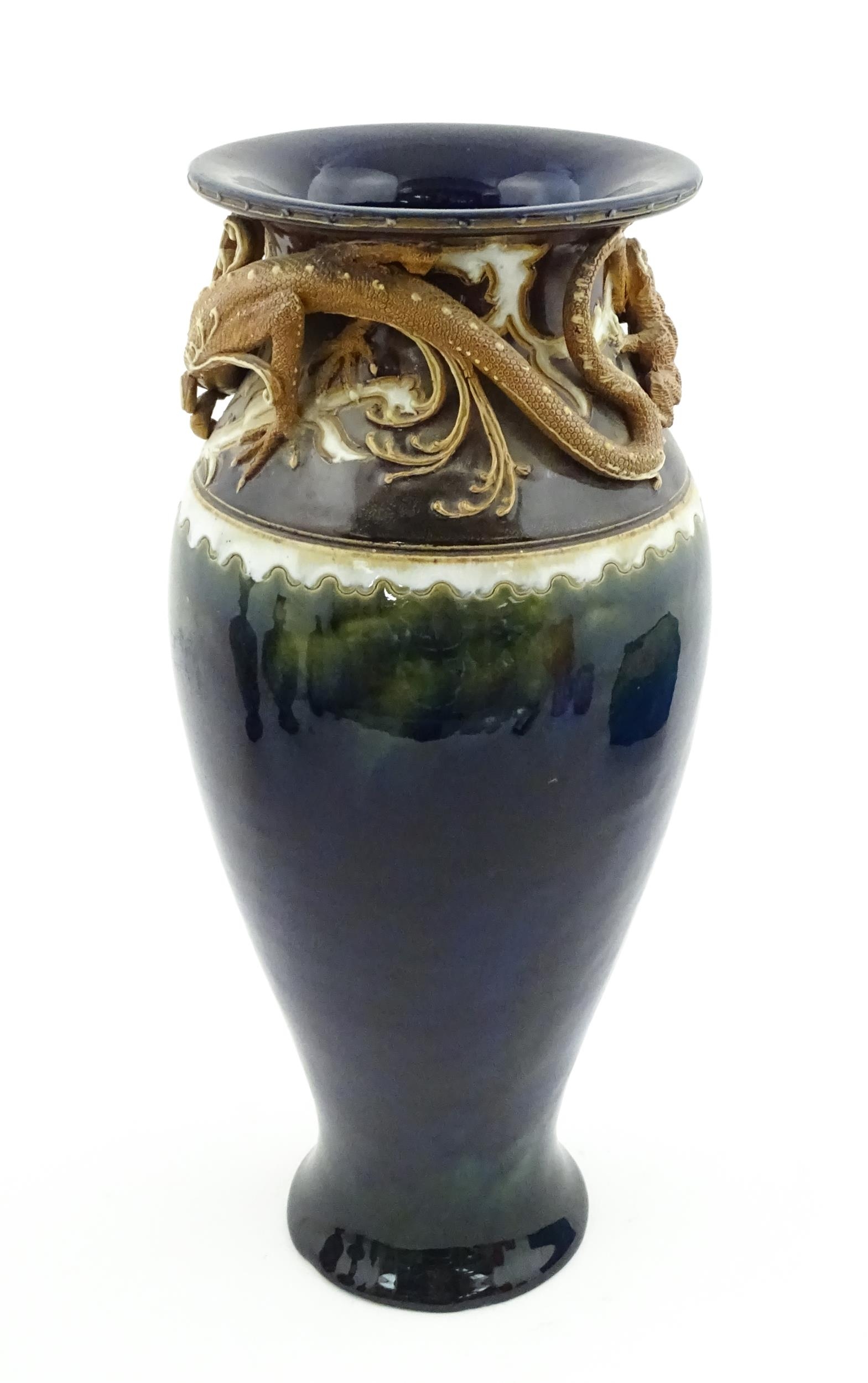 A Royal Doulton vase with blue glaze and high relief dragon decoration to rim by Mark V Marshall. Marked under, impressed Art Union of London, and incised MVM. Approx. 15 3/4" high