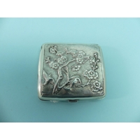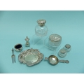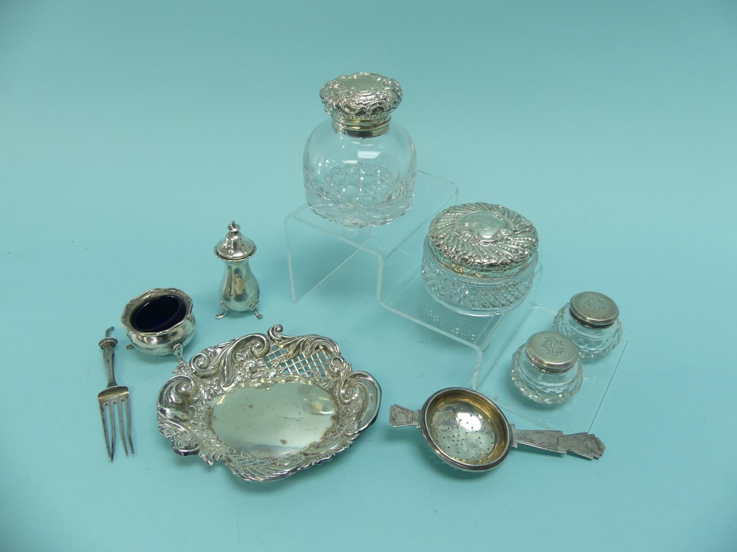 A late Victorian silver mounted glass Scent Bottle, hallmarked London, 1896, of circular form with hobnail cut base, lacks stopper, together with an Edwardian silver pin tray, hallmarked Birmingham, 1902, three other silver mounted glass dressing table jars, a silver strainer in the Art Deco style, hallmarked Birmingham, 1936, two silver cruets etc., weighable silver 5.4ozt (a lot)