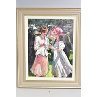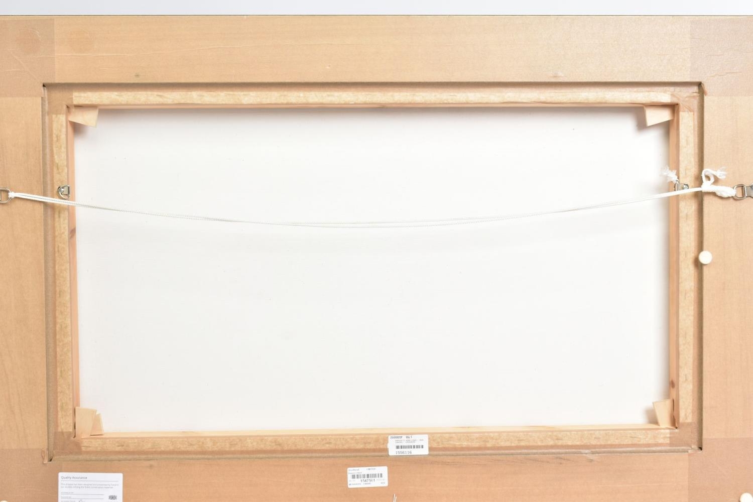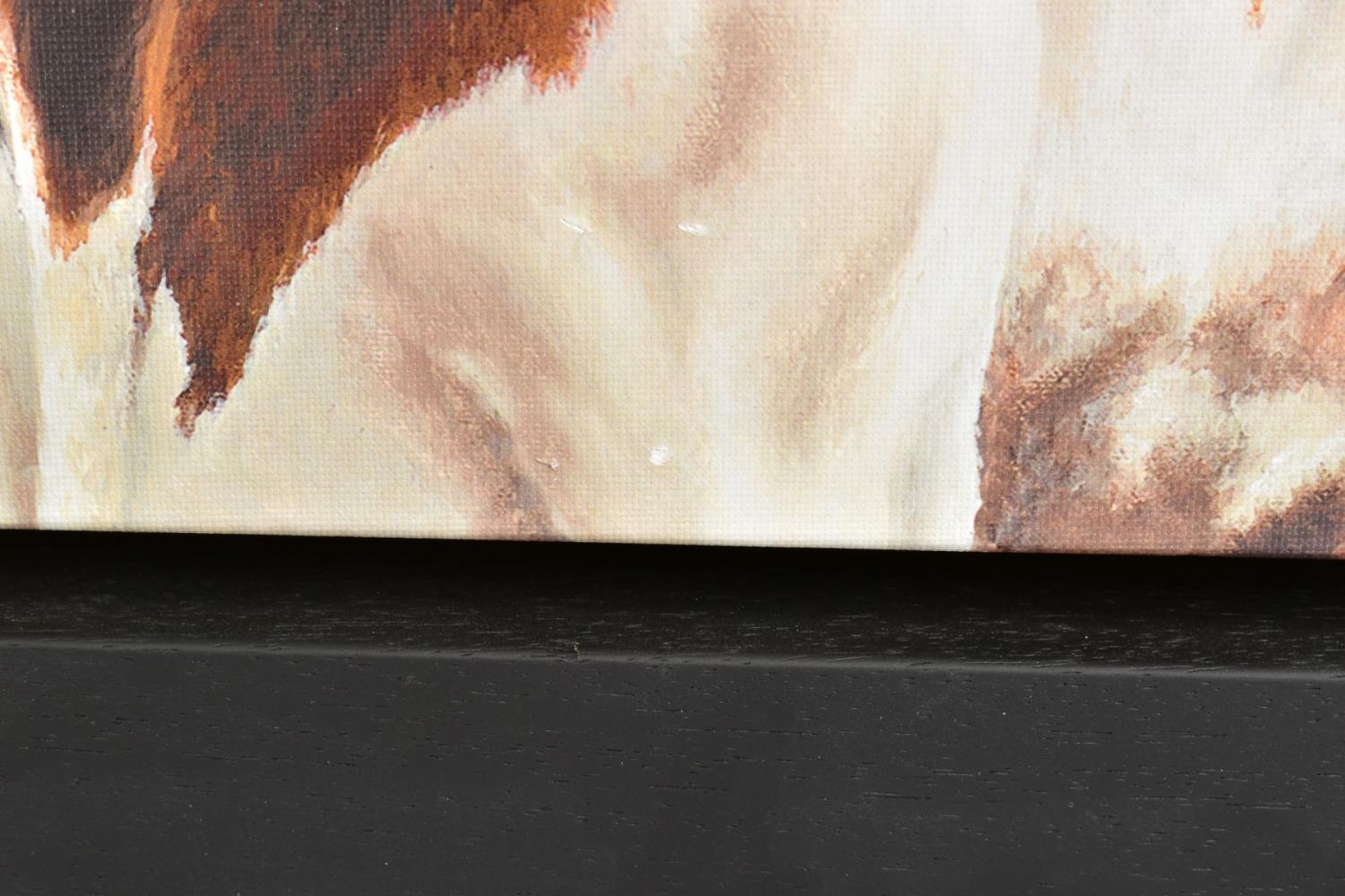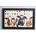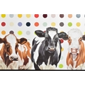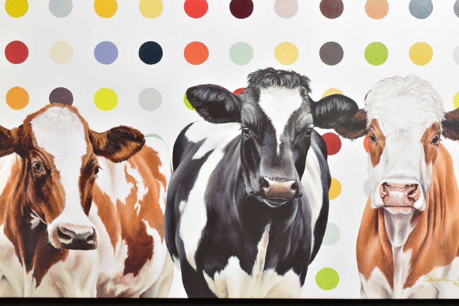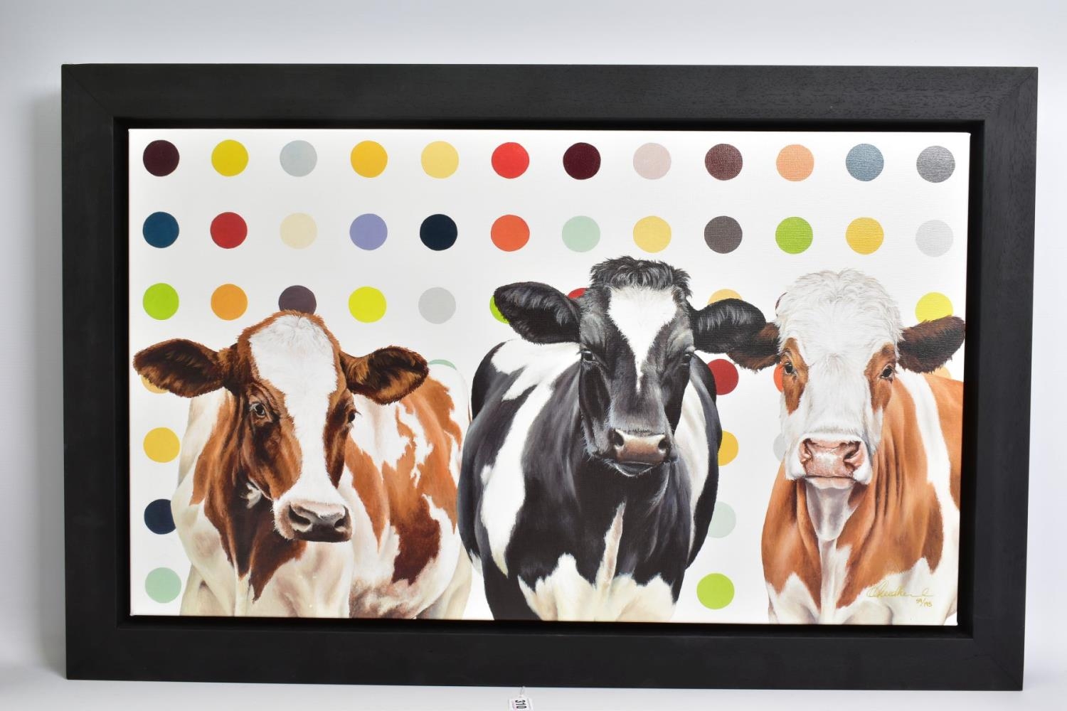HAYLEY GOODHEAD (BRITISH CONTEMPORARY) 'DAMIENS HERD', a limited edition print on canvas 59/195, cows against a spotted backdrop, no certificate, framed, approximate sizes: image 51cm x 86cm, frame 64cm x 100cm (condition: print image scratched, frame damaged) (A)