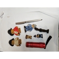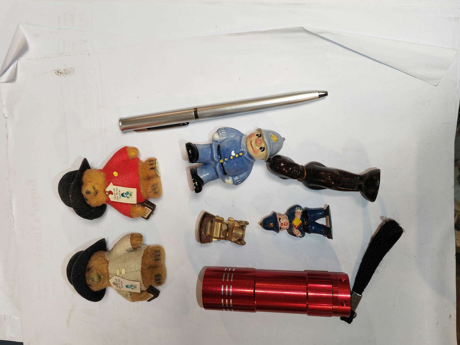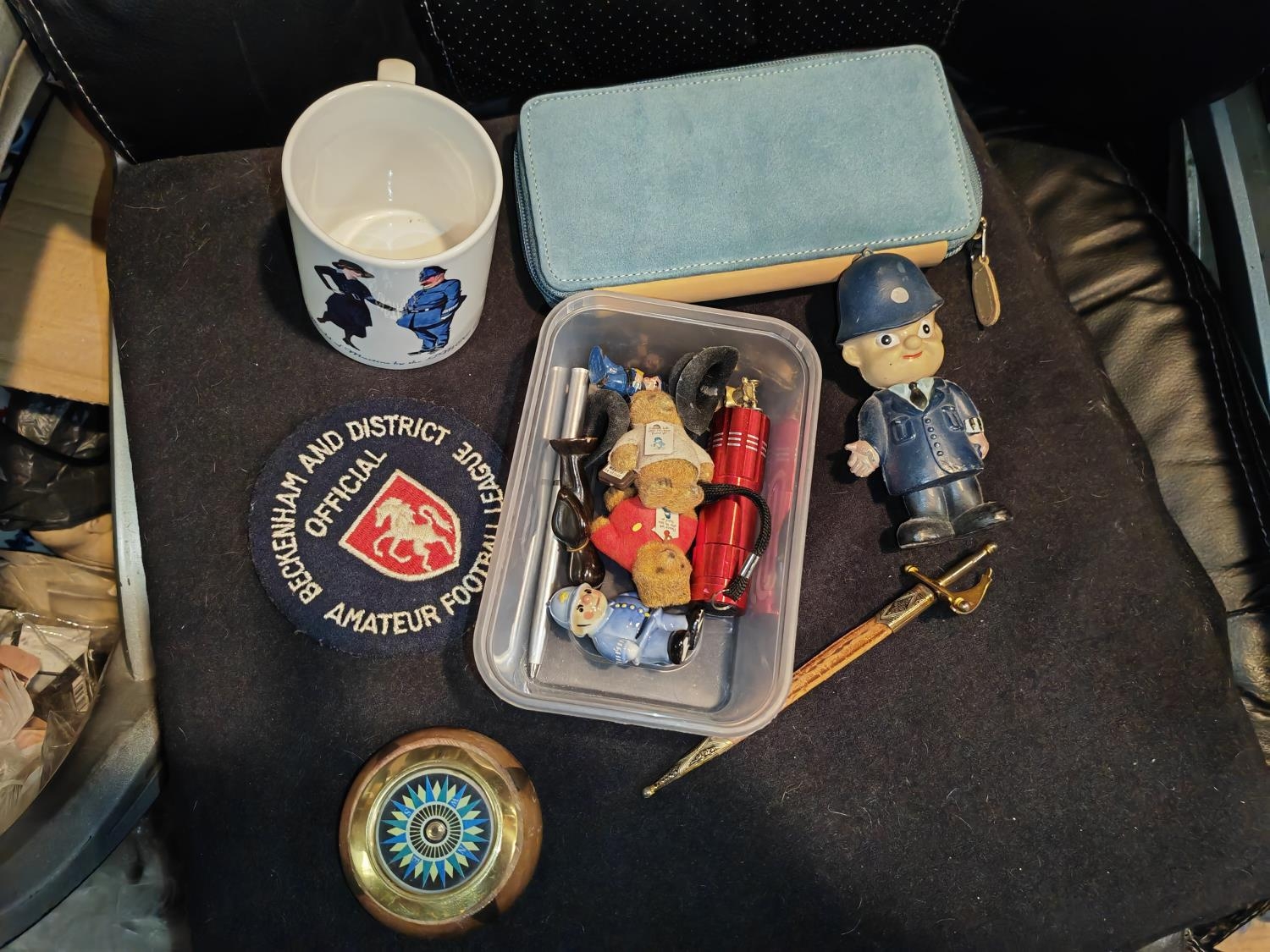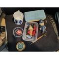 Small Tub Of Treasures Including Compass, Miniature Paddington Bear Figures, Policeman'S Mug, Wade Pc Plod Etc