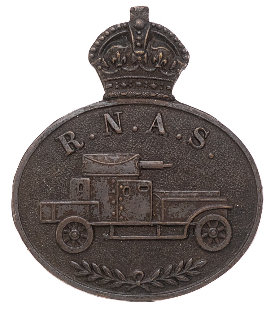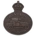 Royal Naval Air Service RNAS WW1 Armoured Car Squadron badge. Fine scarce die-stamped bronze crowned oval bearing Talbot armoured car with the letters R.N.A.S. above and laurel spray below. Loops. VGC