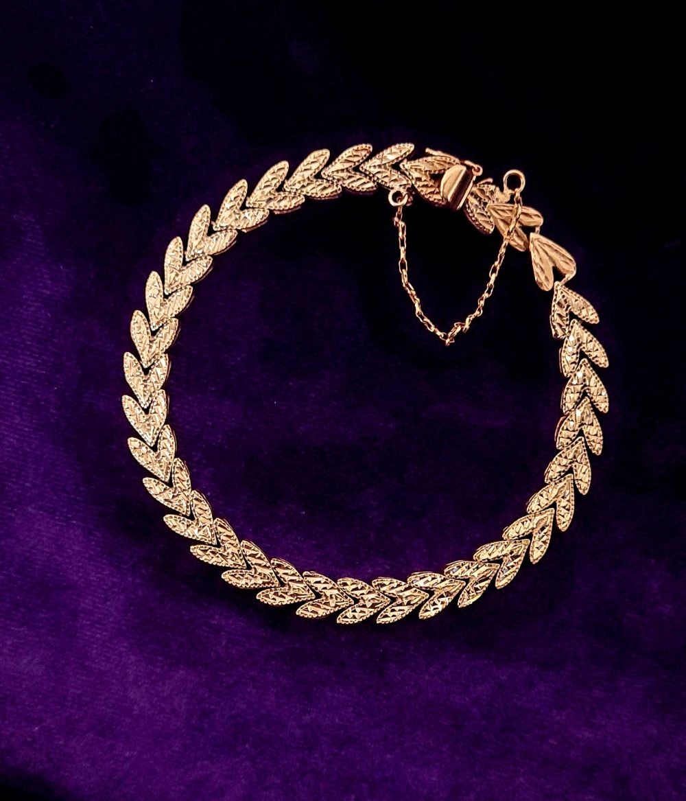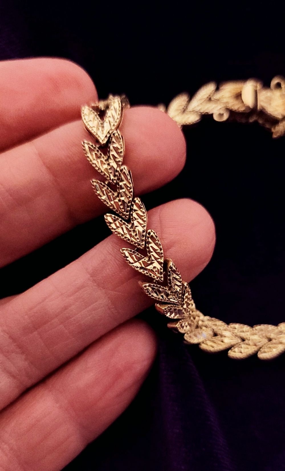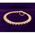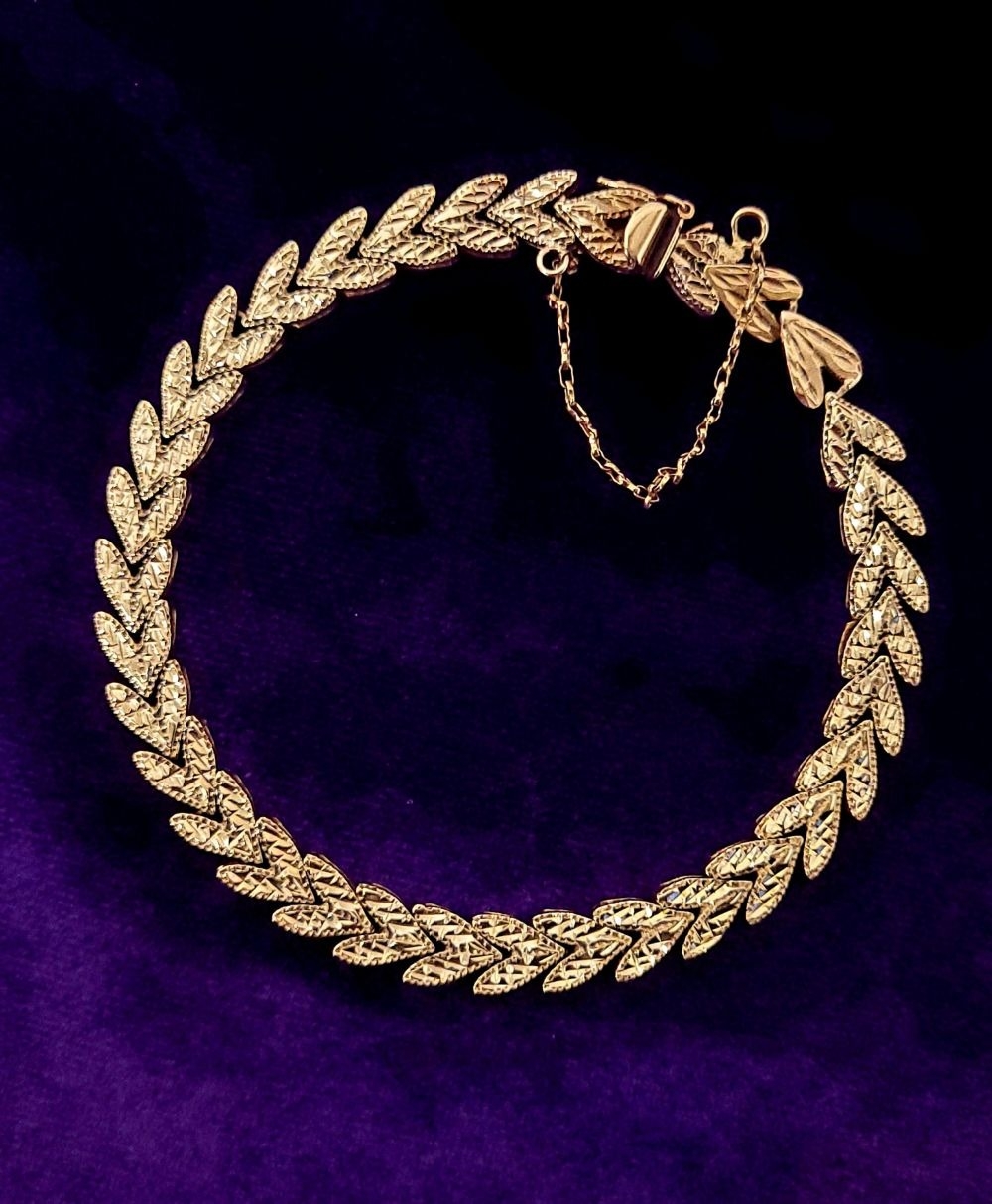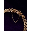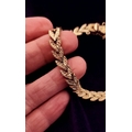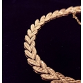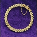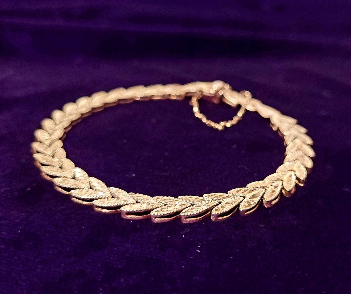 A BEAUTIFUL LEAF DESIGN 14CT YELLOW GOLD LINK BRACELET, lovely movement to the piece, marked 14K. Measures 19cm long when open. Complete with a security link chain at clasps. 14grams in weight.