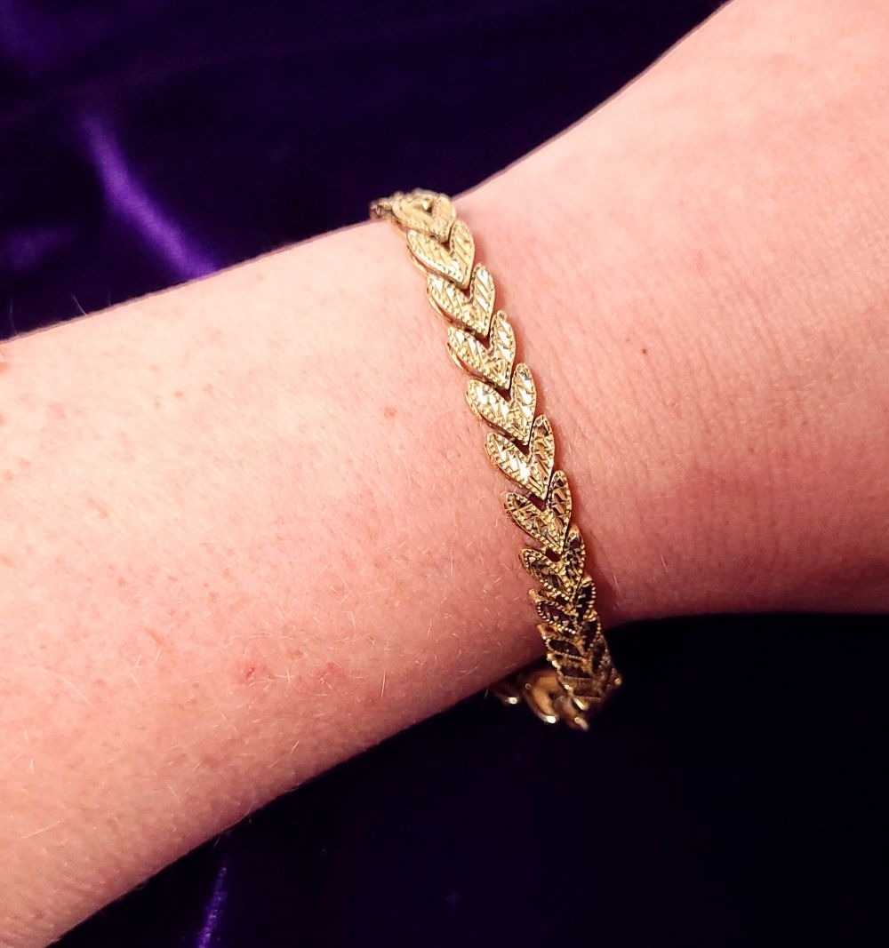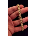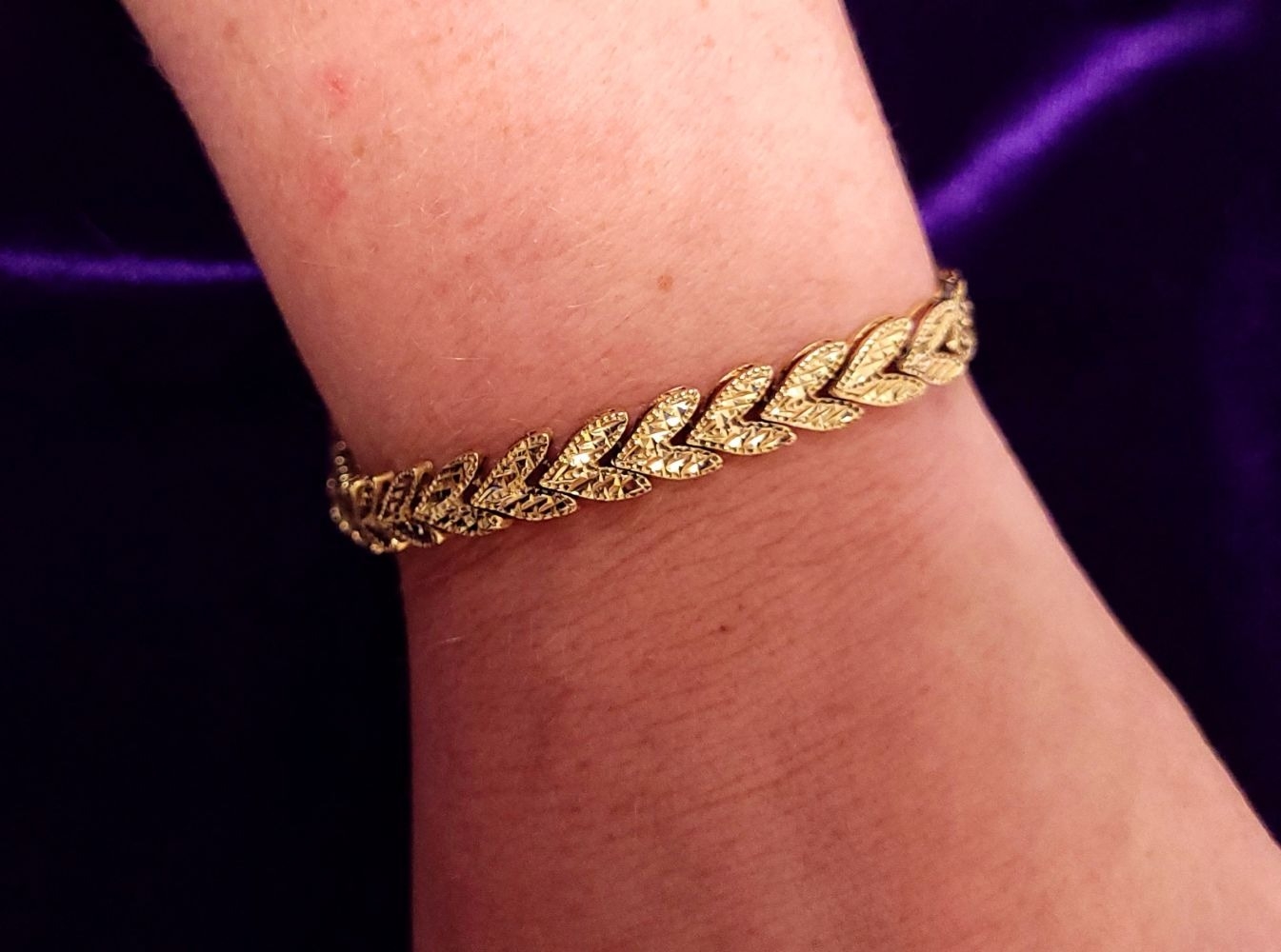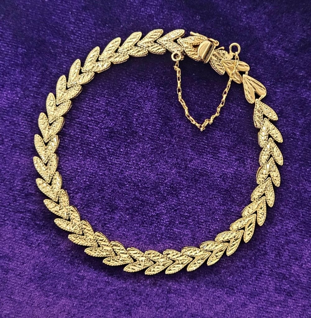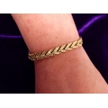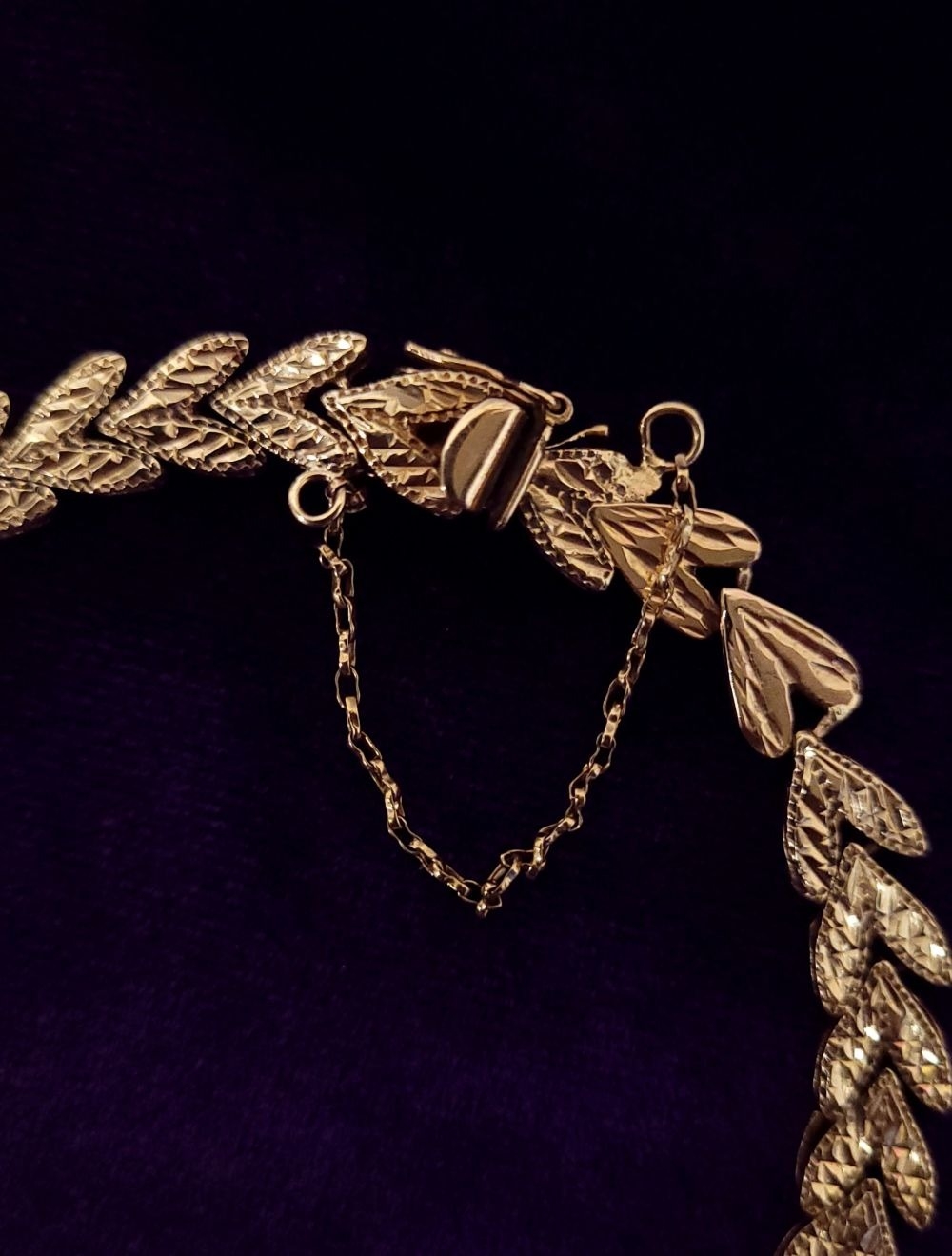 A BEAUTIFUL LEAF DESIGN 14CT YELLOW GOLD LINK BRACELET, lovely movement to the piece, marked 14K. Measures 19cm long when open. Complete with a security link chain at clasps. 14grams in weight.