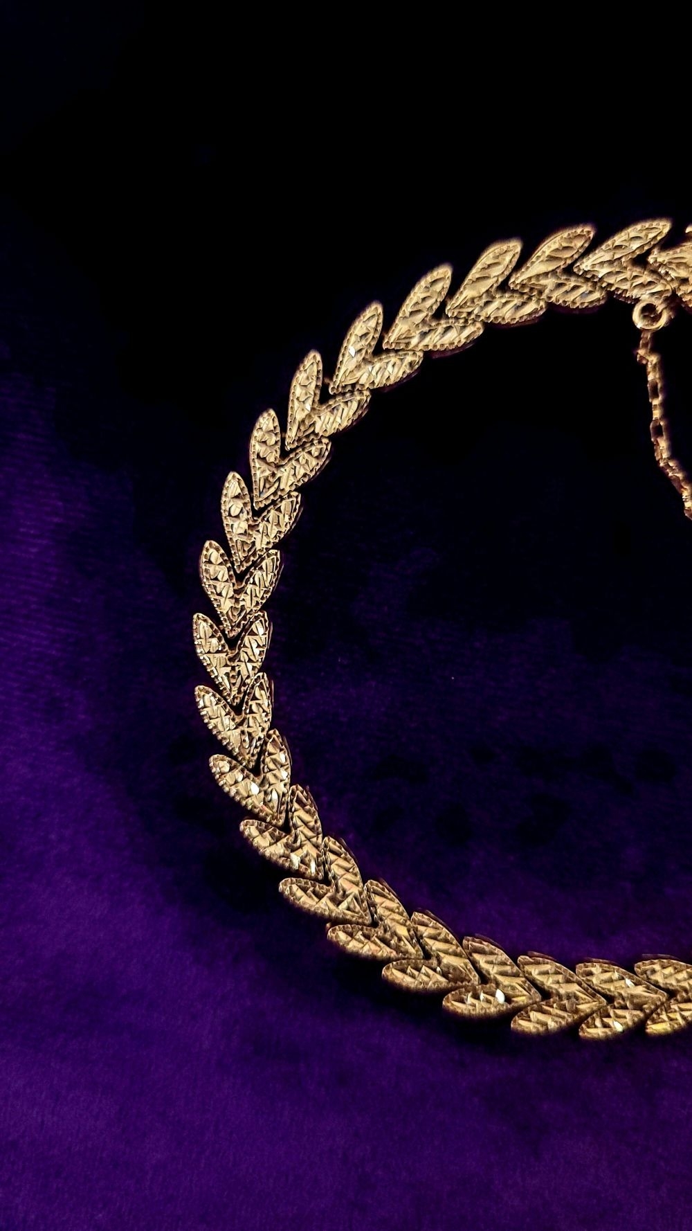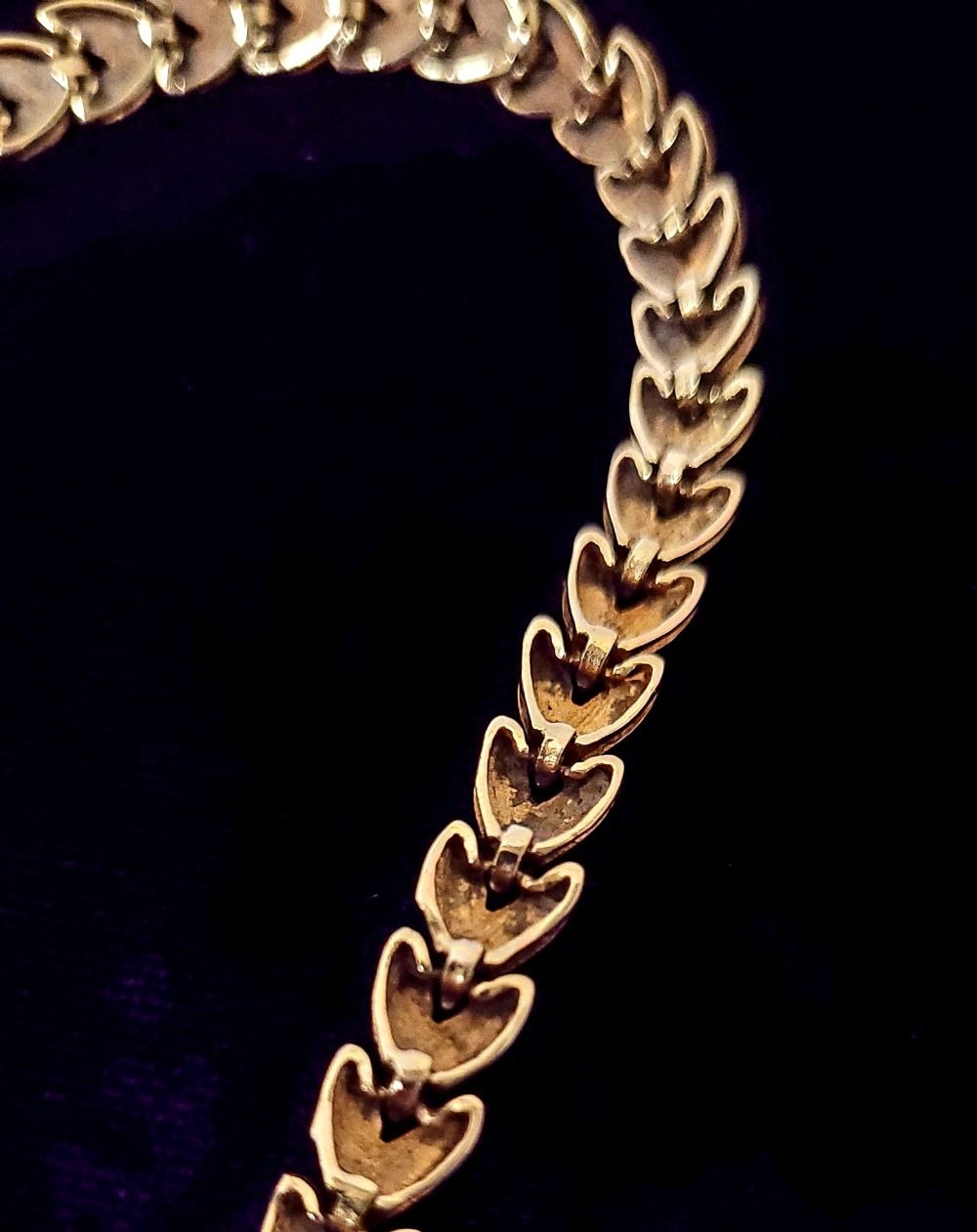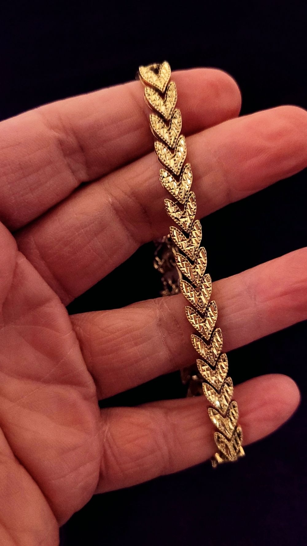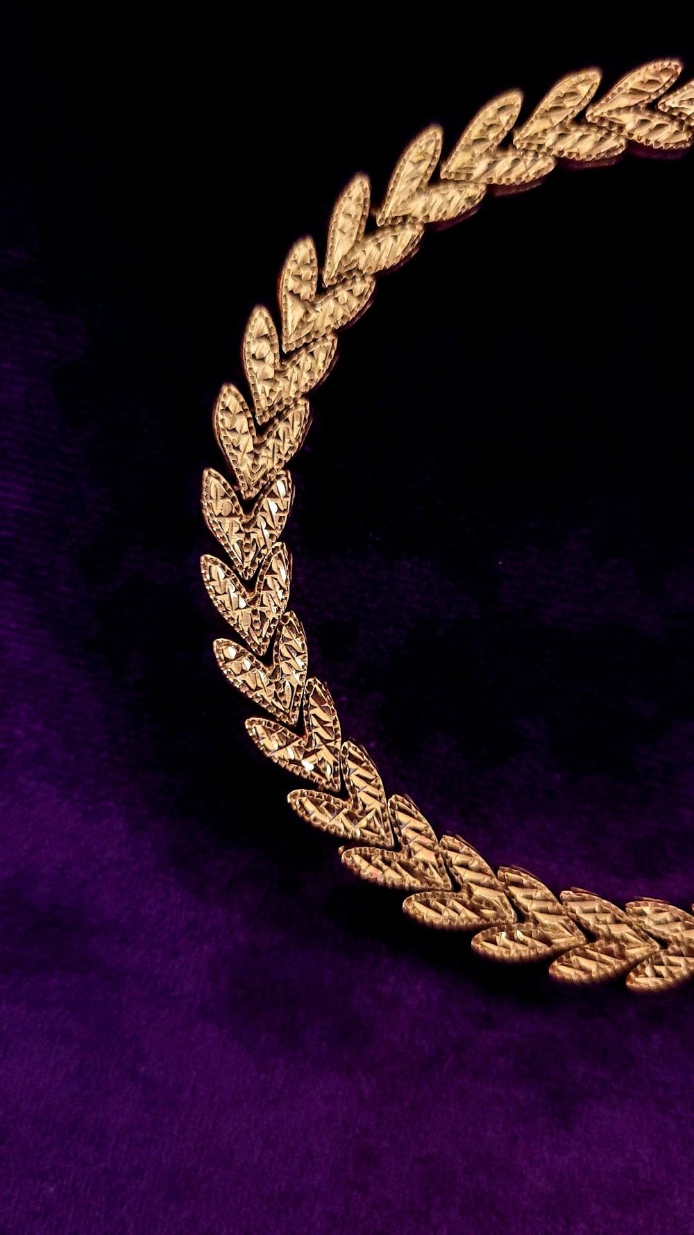 A BEAUTIFUL LEAF DESIGN 14CT YELLOW GOLD LINK BRACELET, lovely movement to the piece, marked 14K. Measures 19cm long when open. Complete with a security link chain at clasps. 14grams in weight.