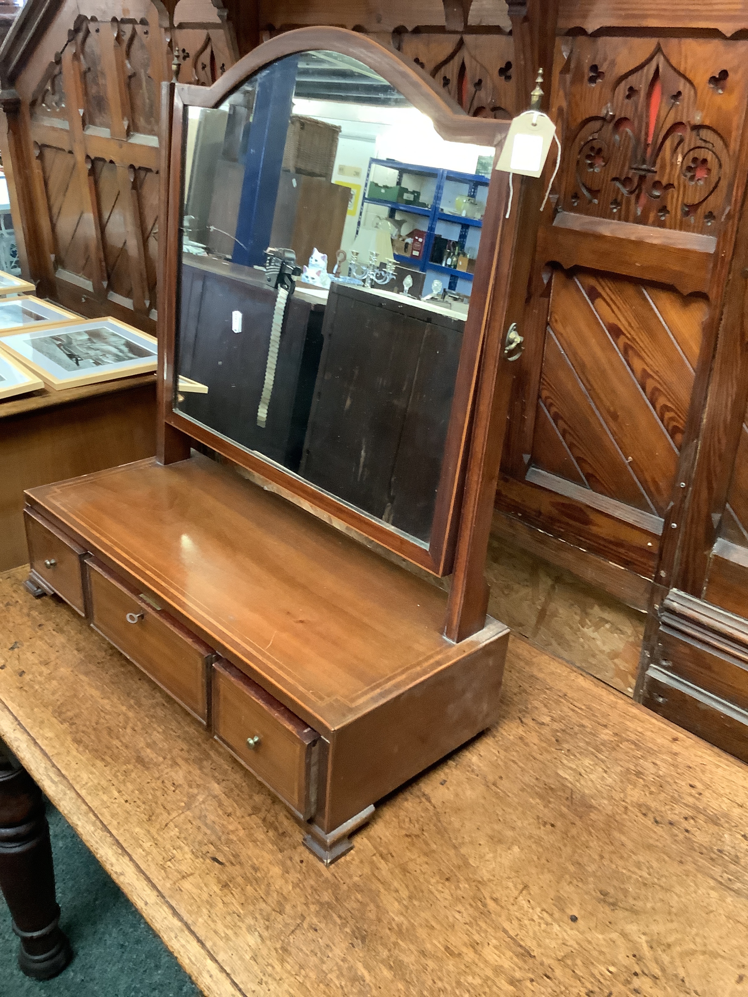A mahogany cross banded swing dressing mirror with three short drawers A/F