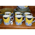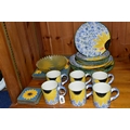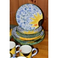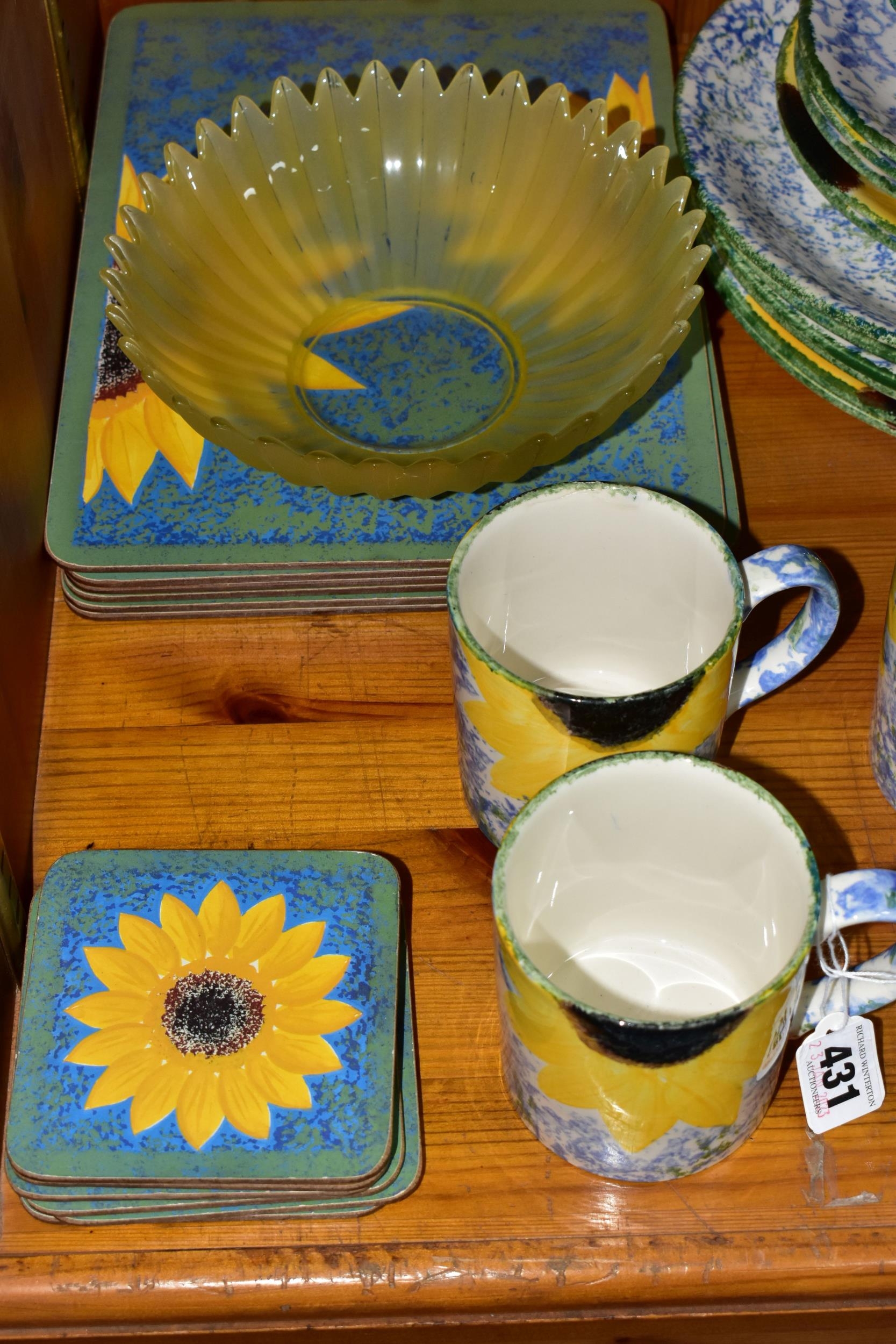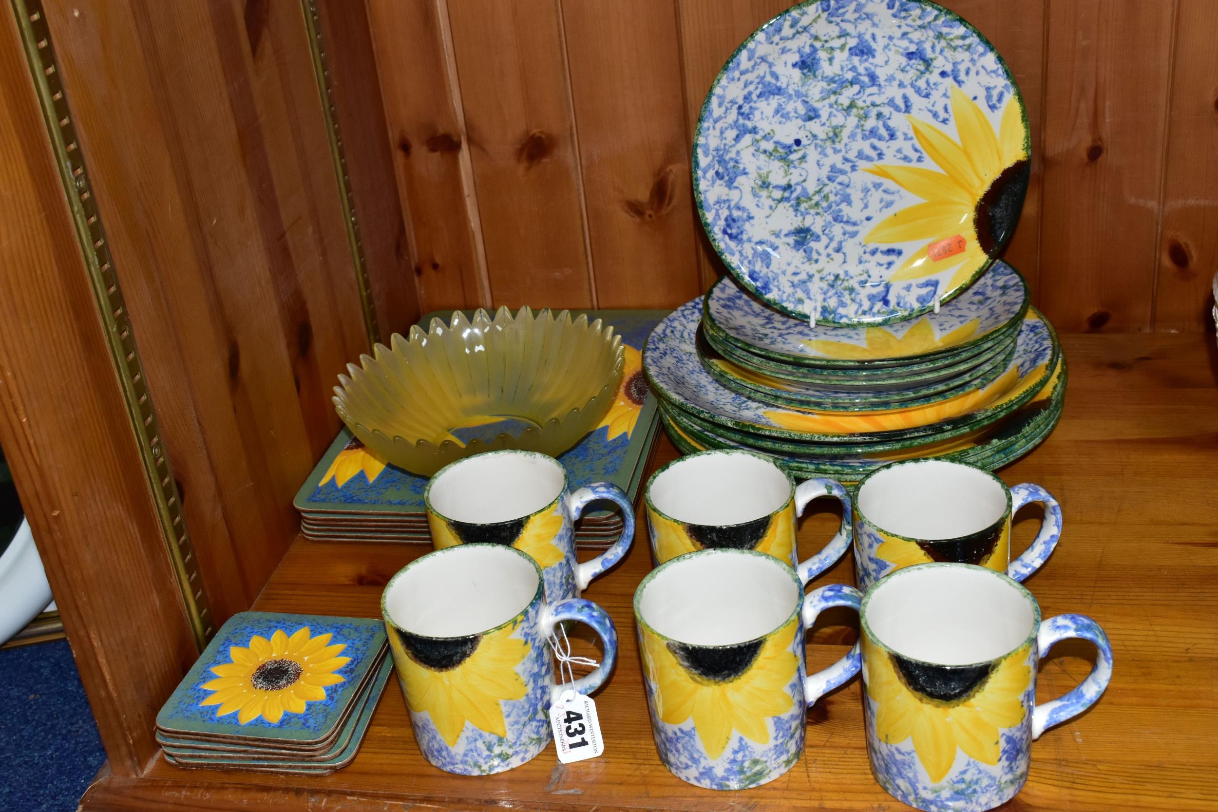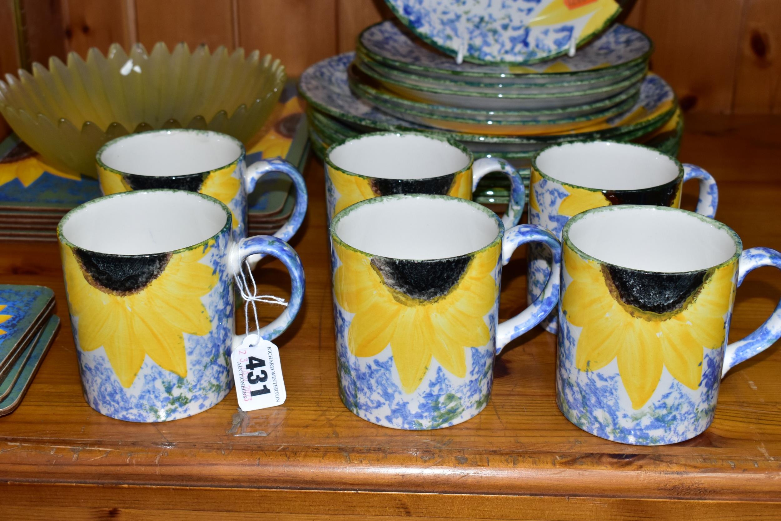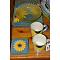 A SET OF HAND PAINTED POOLE POTTERY SUNFLOWERS PATTERN DINNER WARES, comprising six dinner plates, six side plates, six mugs, six placemats and six coasters (30) (Condition Report: no obvious damage, placemats and coasters showing signs of wear)