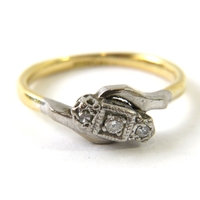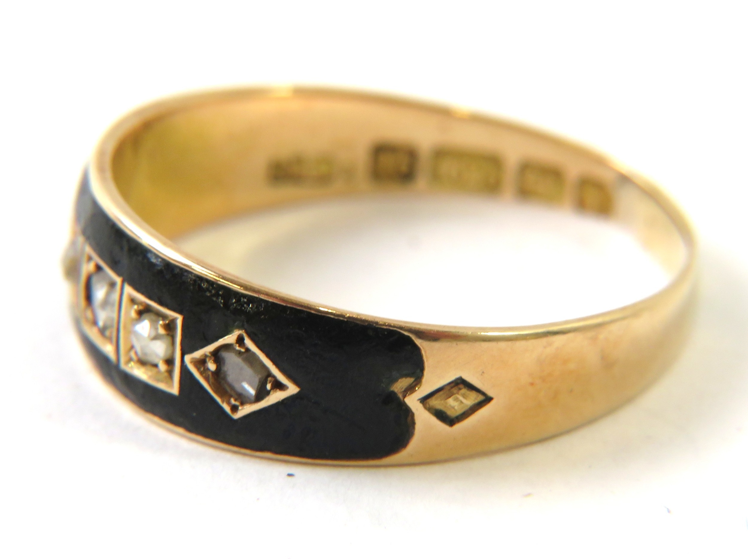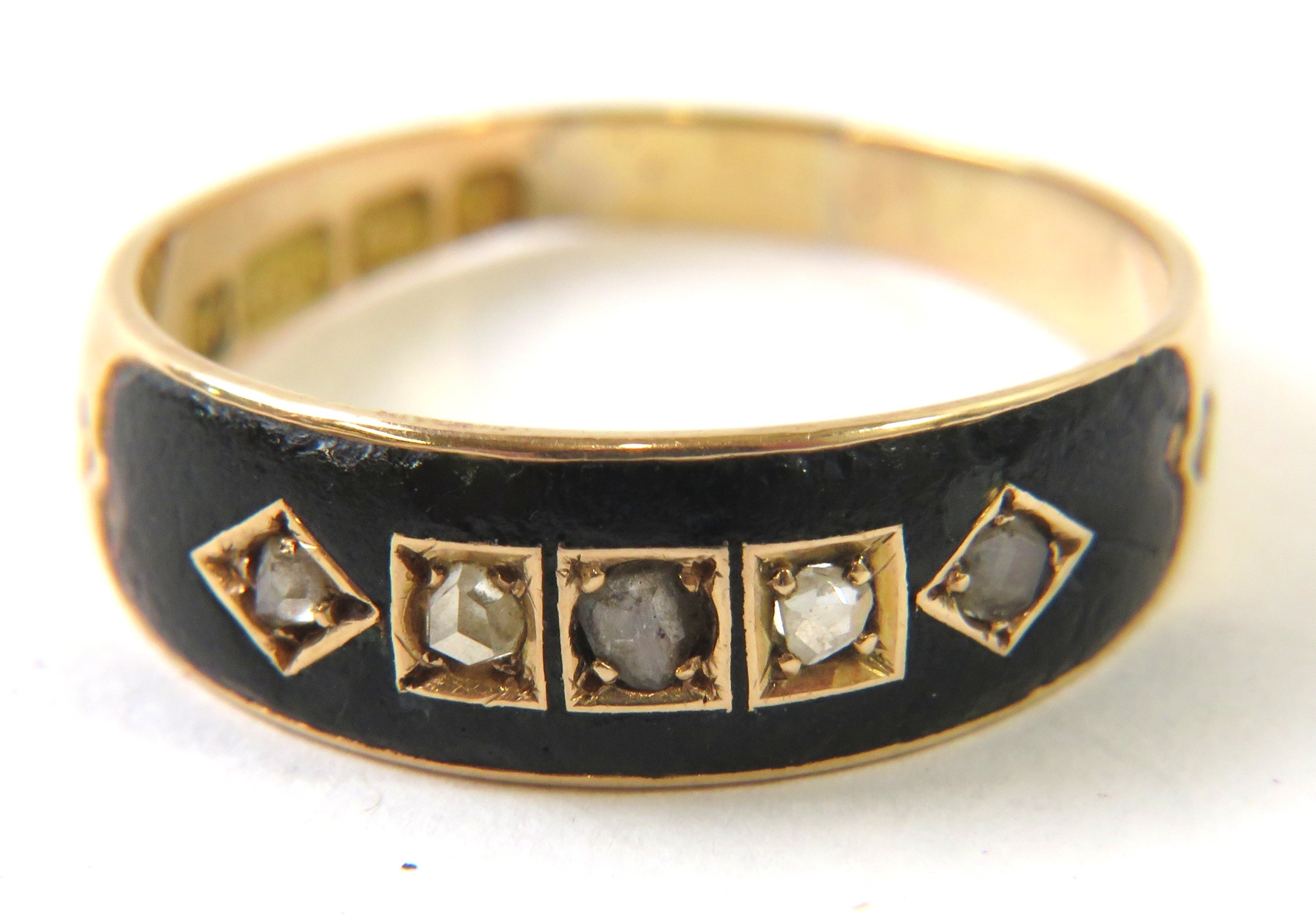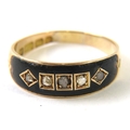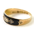 A Victorian 15ct yellow gold mourning ring set with rose cut/chip diamonds in black enamel, hallmarked Birmingham 1885, sponsors mark ‘DLD’, 3.2g approx