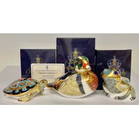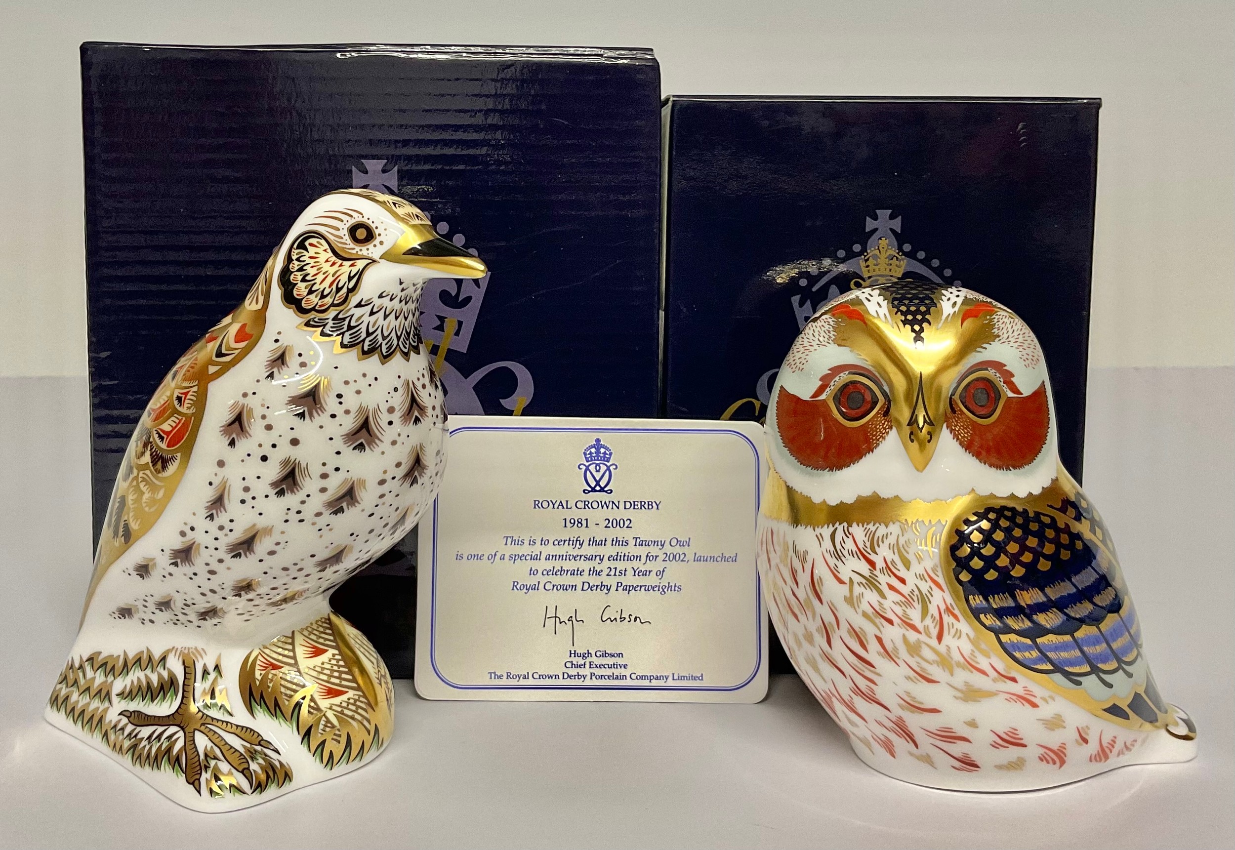 A Royal Crown Derby paperweight, Tawny Owl, special edition for 2002, 21st anniversary gold stopper, 8.5cm, printed mark in red, certificate, boxed; another, Song Thrush, gold stopper, 11cm, printed mark in red, boxed (2)