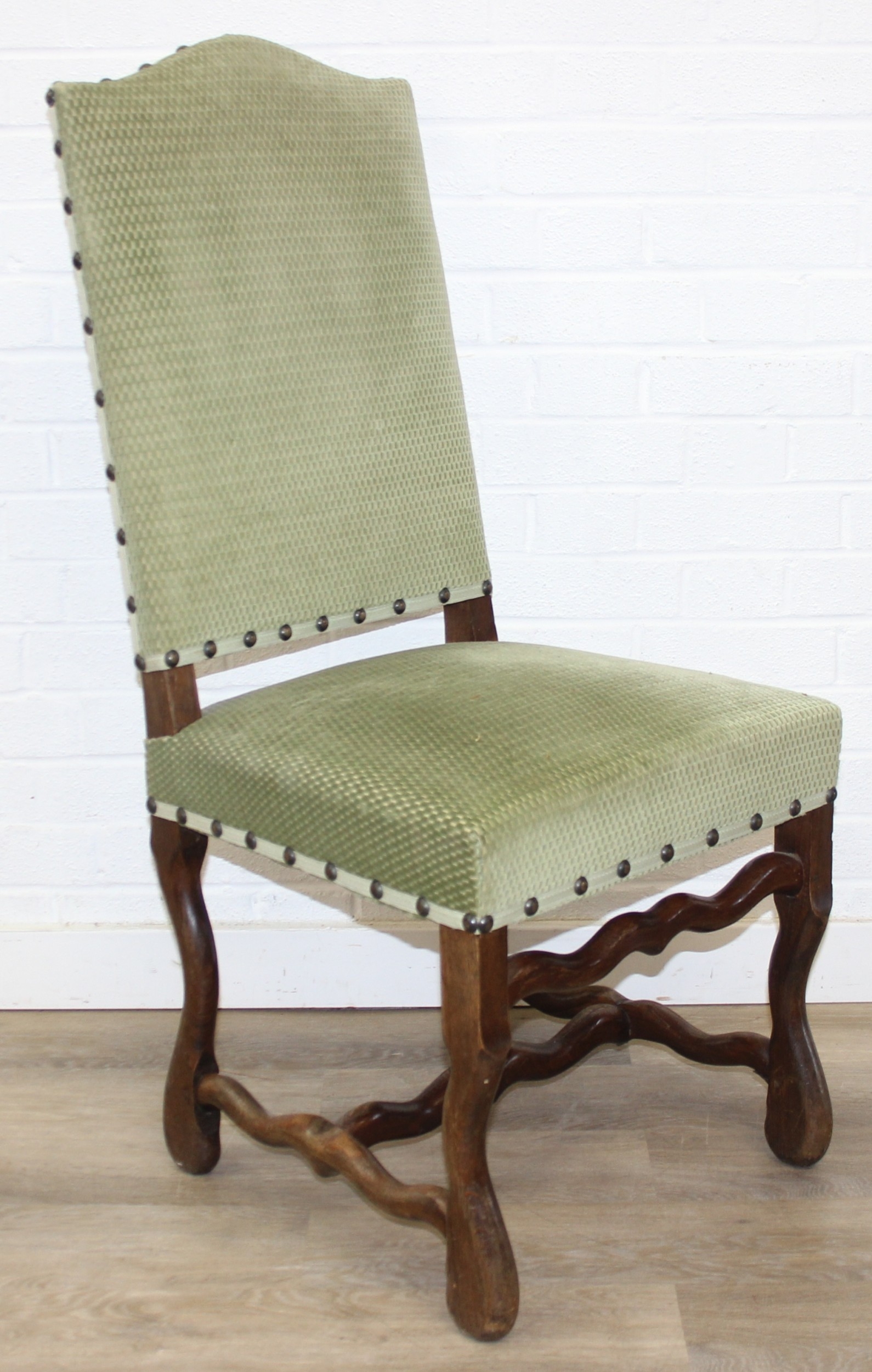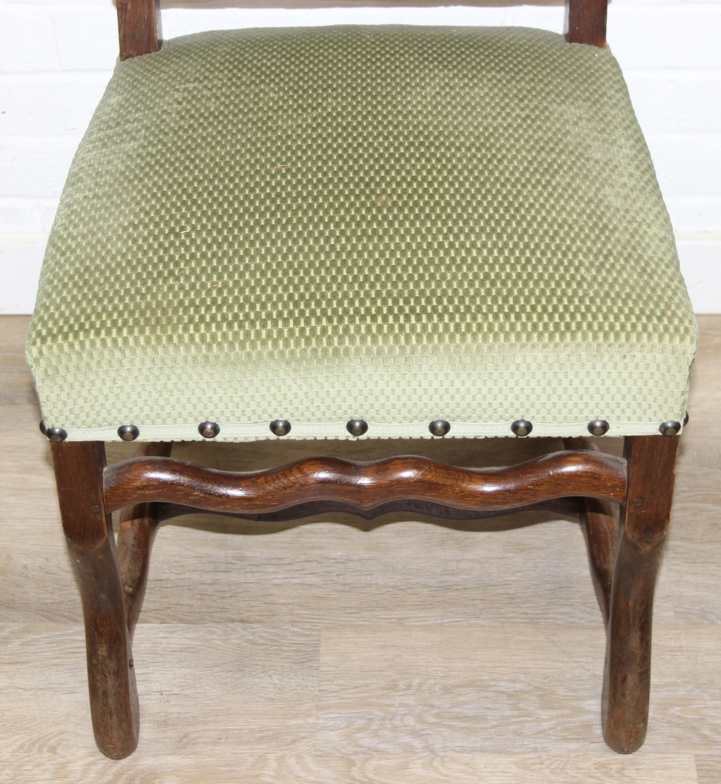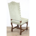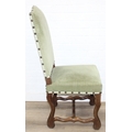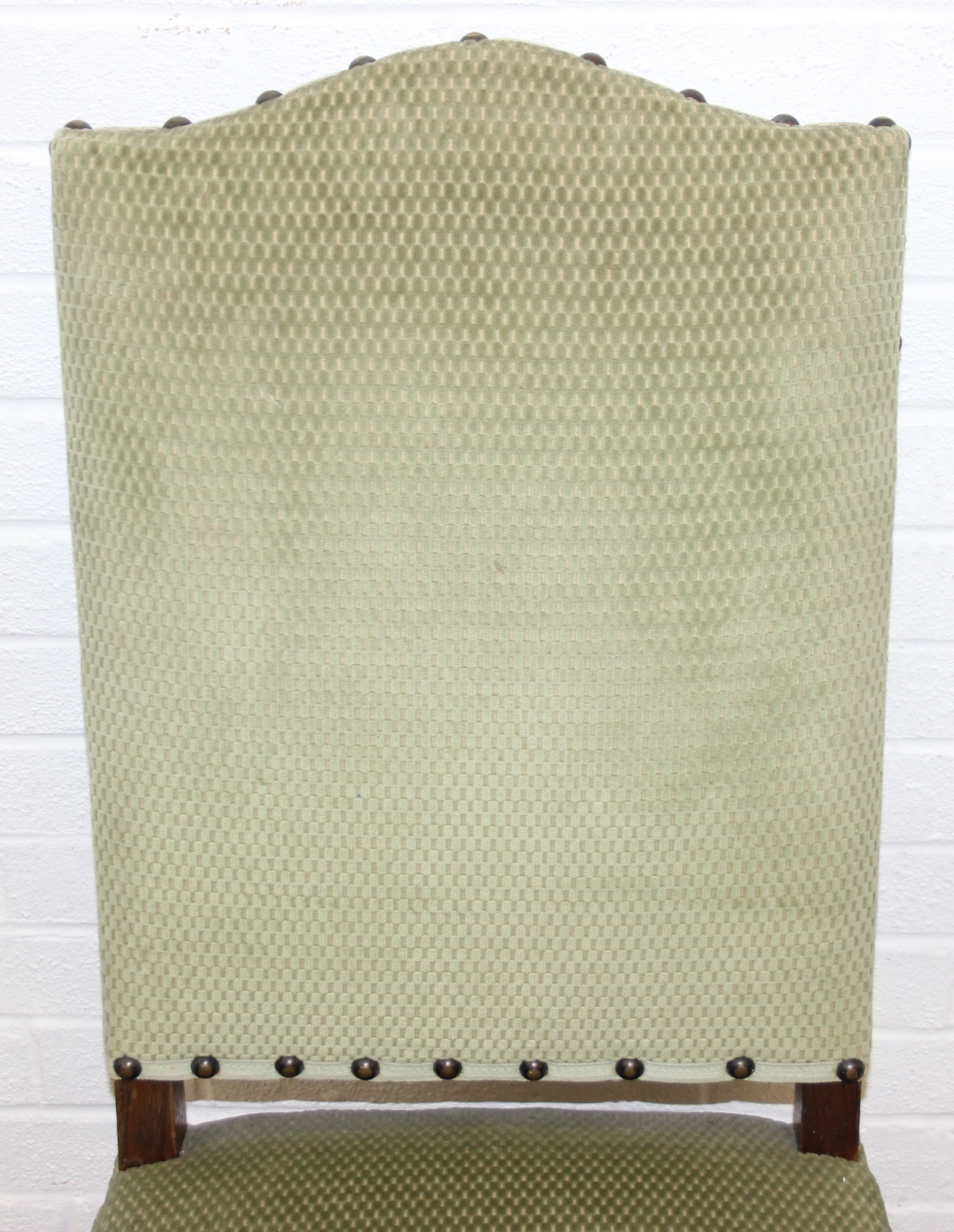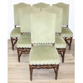 A set of six 17th century style high backed dining chairs with green upholstery, each 107cm tall [6]