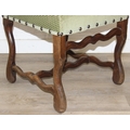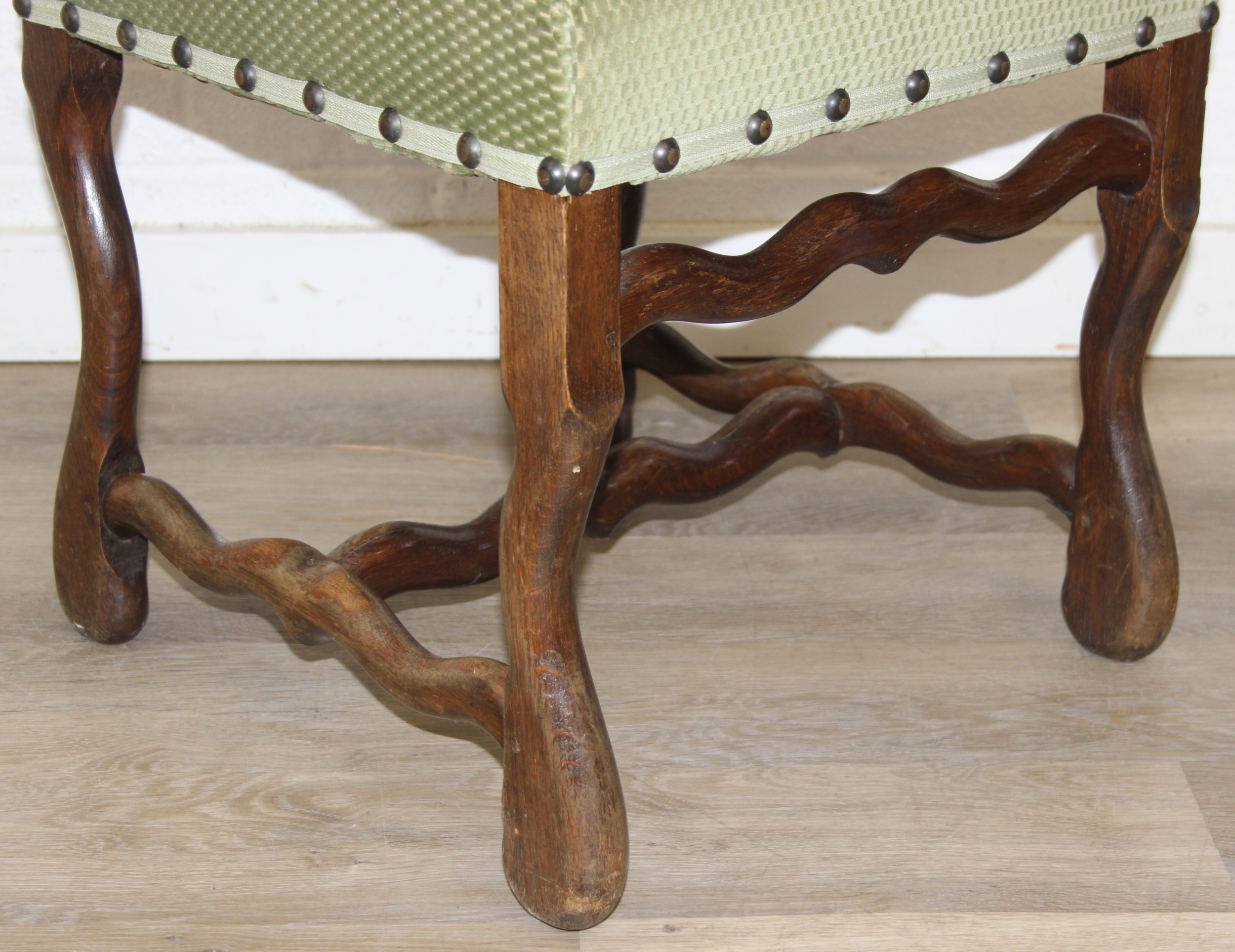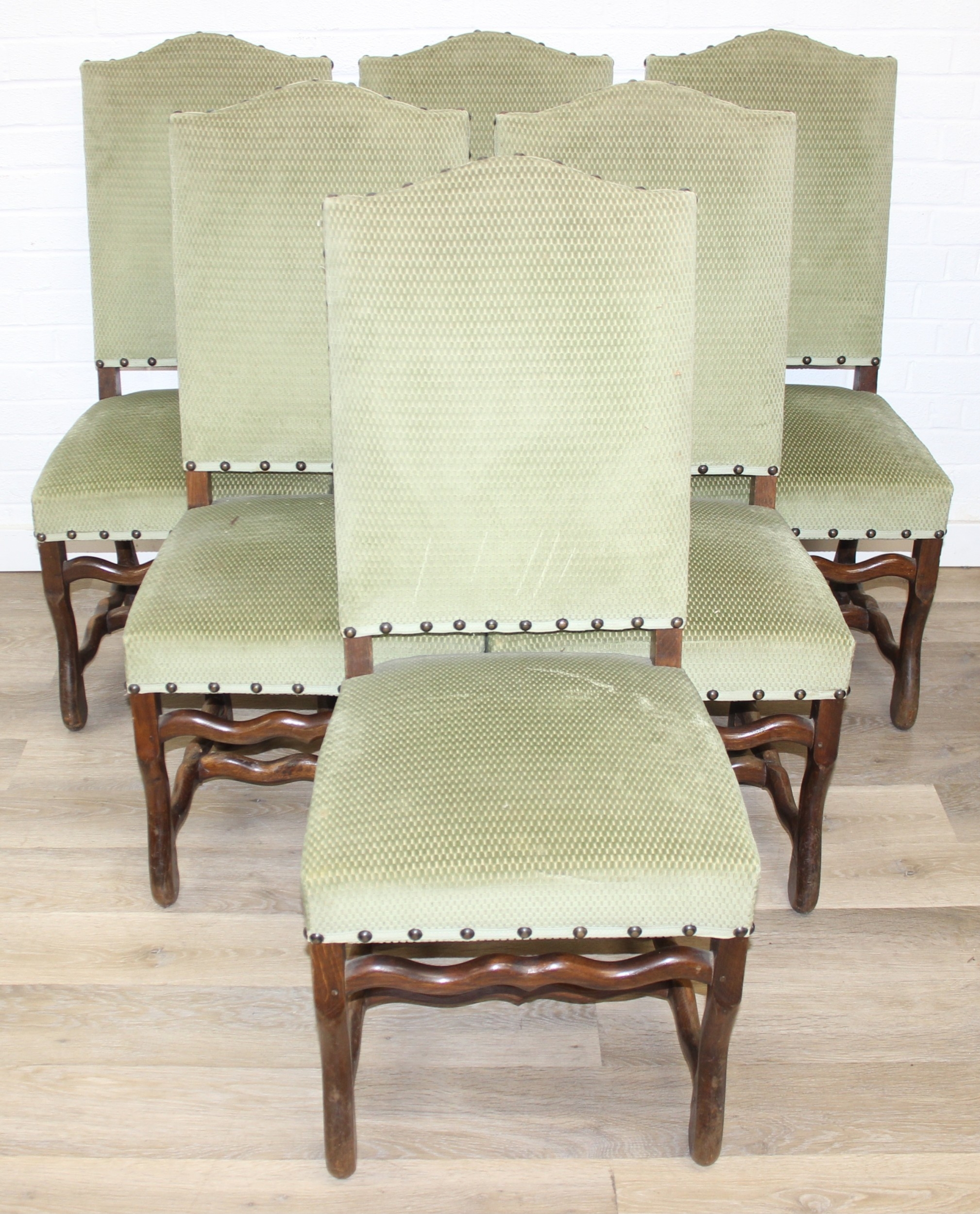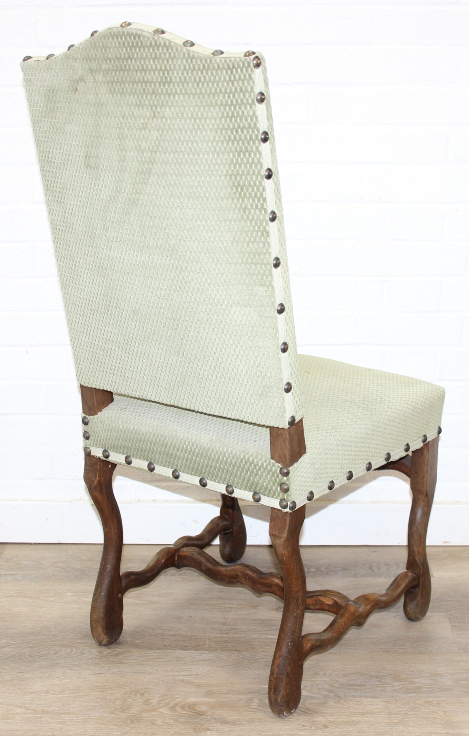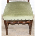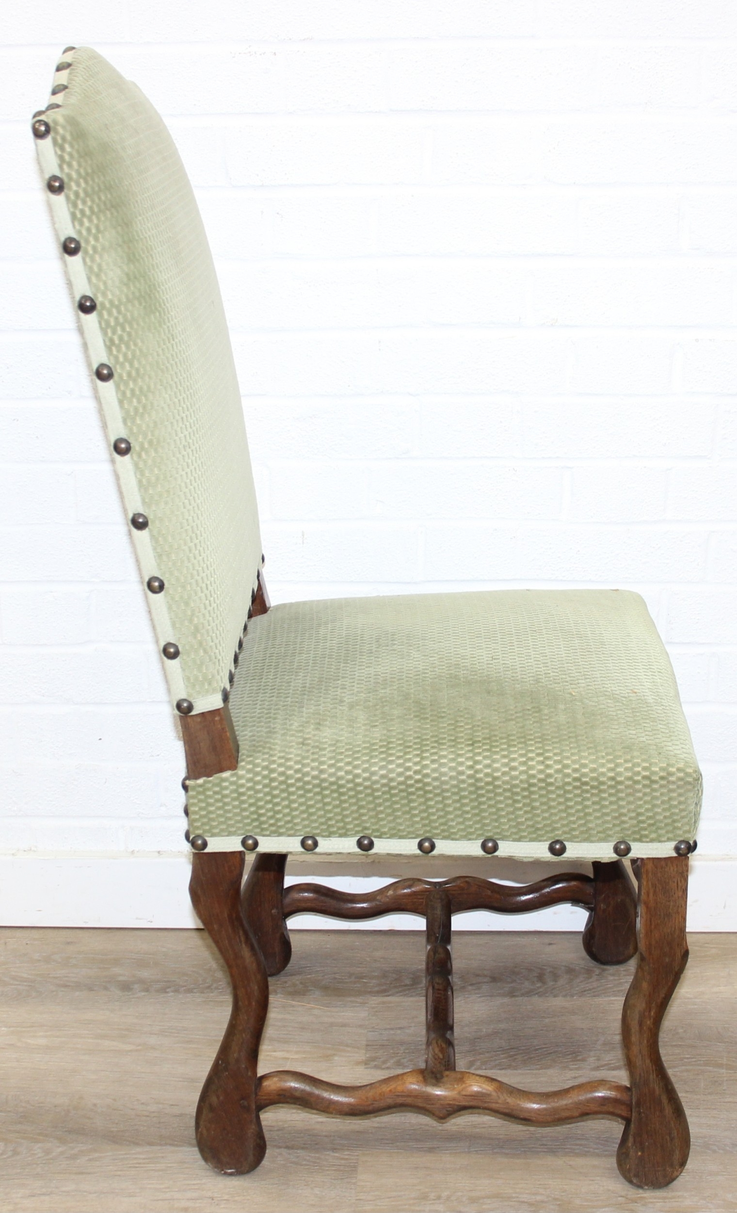 A set of six 17th century style high backed dining chairs with green upholstery, each 107cm tall [6]