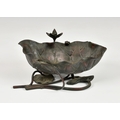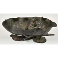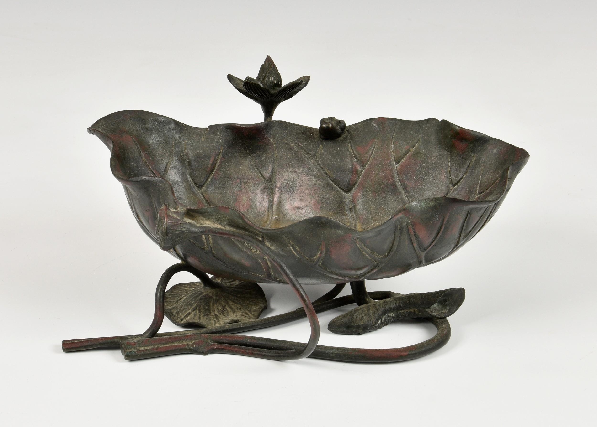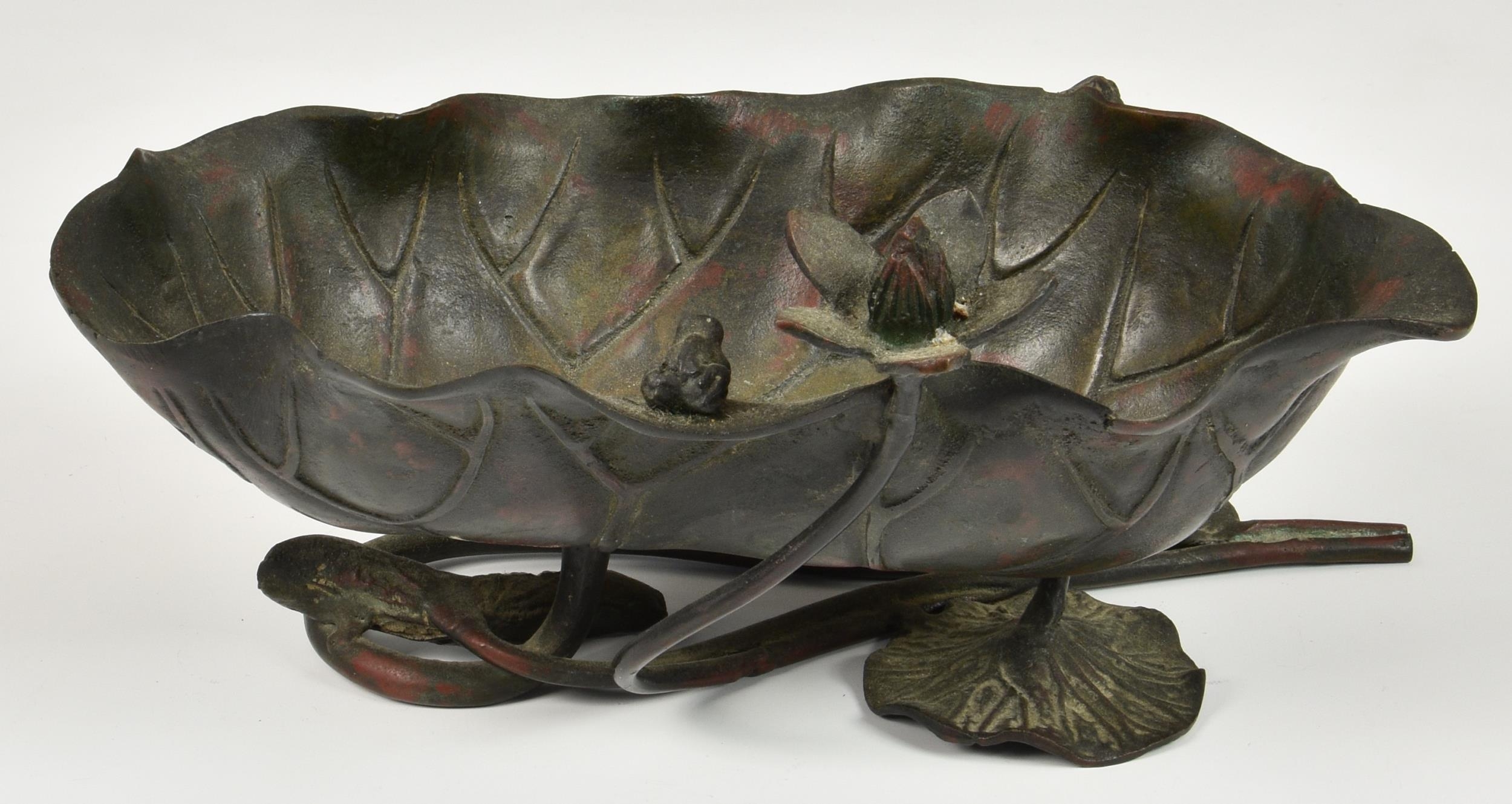 A Japanese bronze lotus form ikebana vessel with frog, Meiji period (1868-1912), red and brown patinated bronze, 4 ½in. (11.5cm.) high. * Some wear to patination to inside of vessel. Small casting split to rim. No other faults.