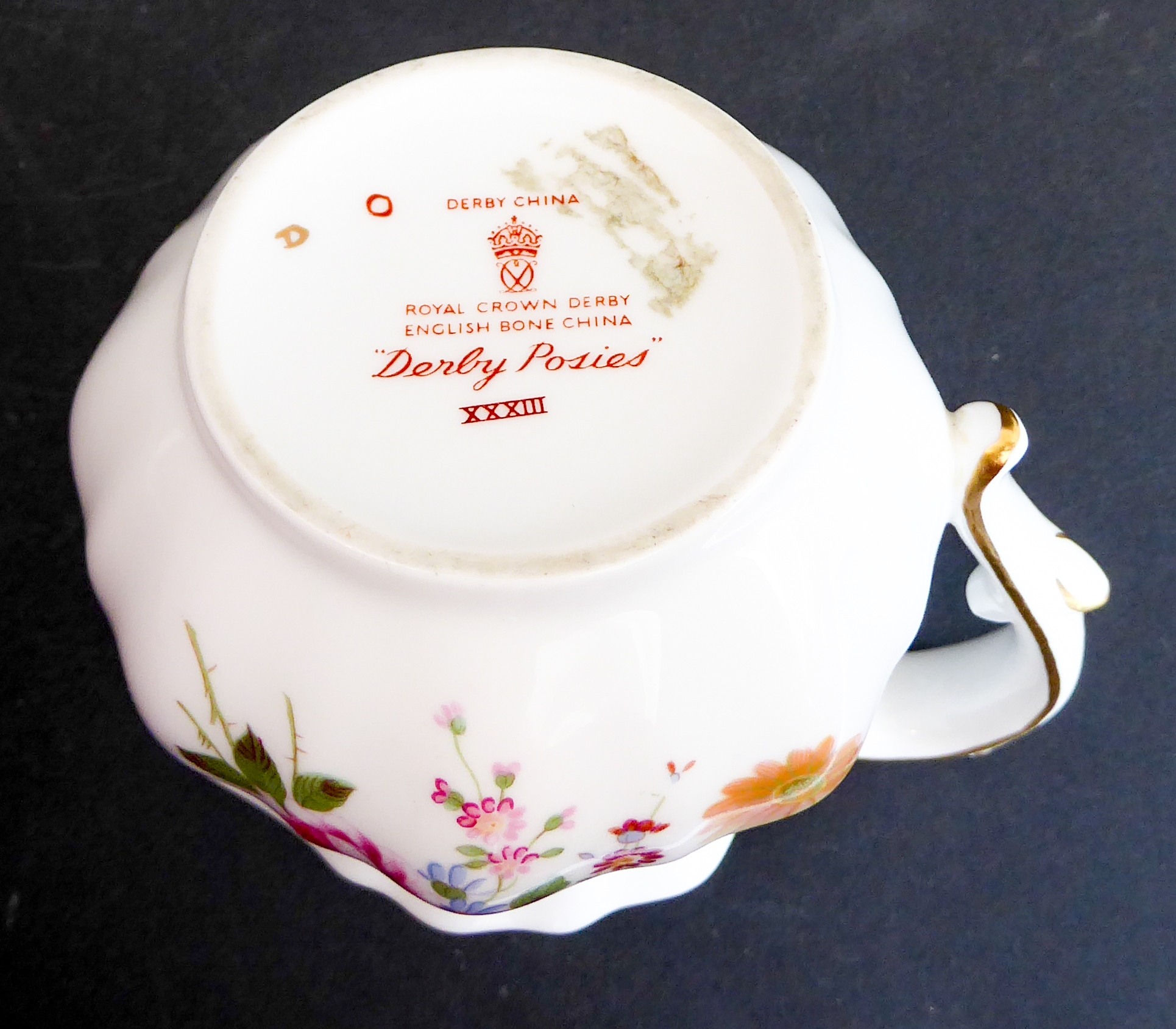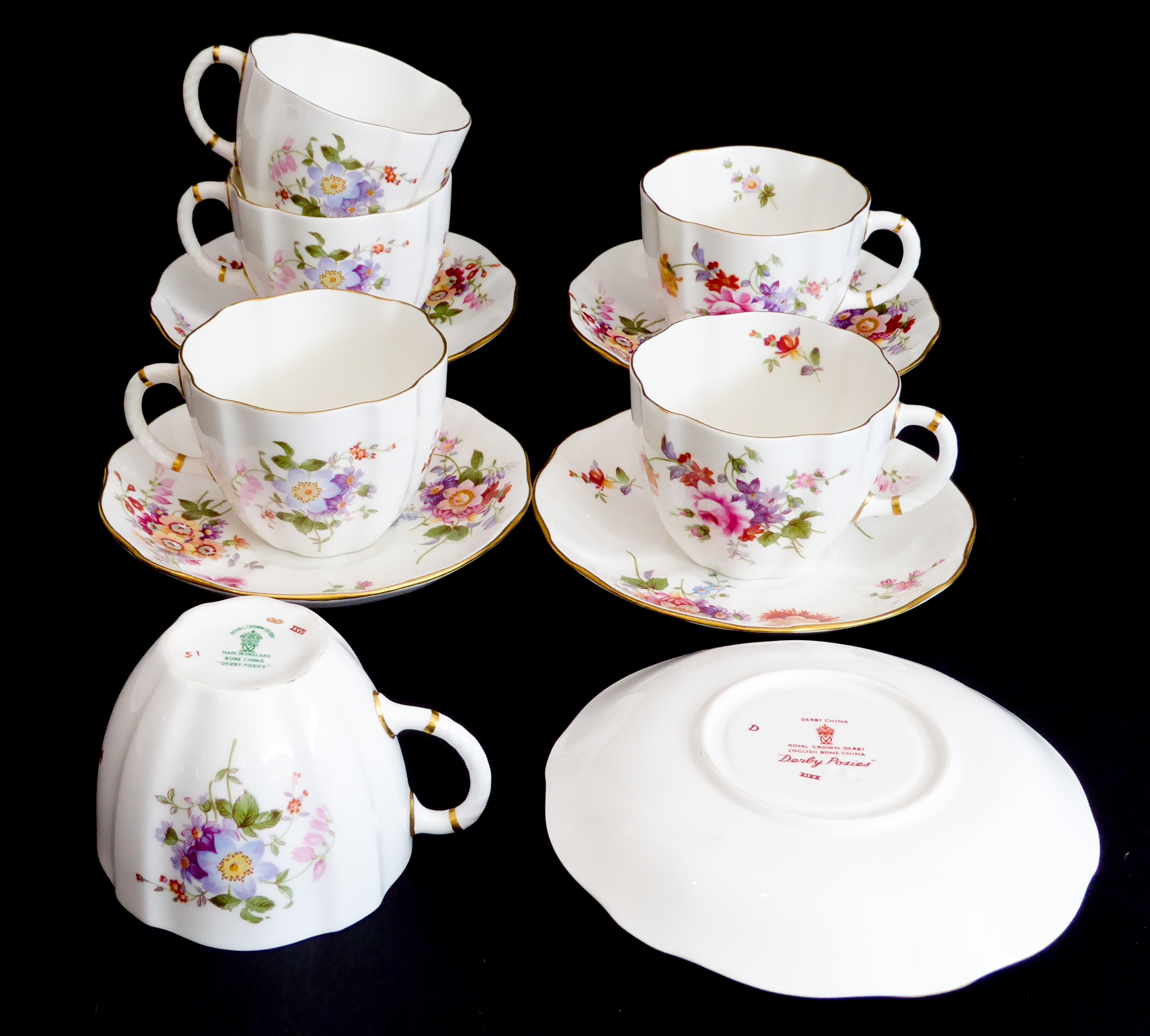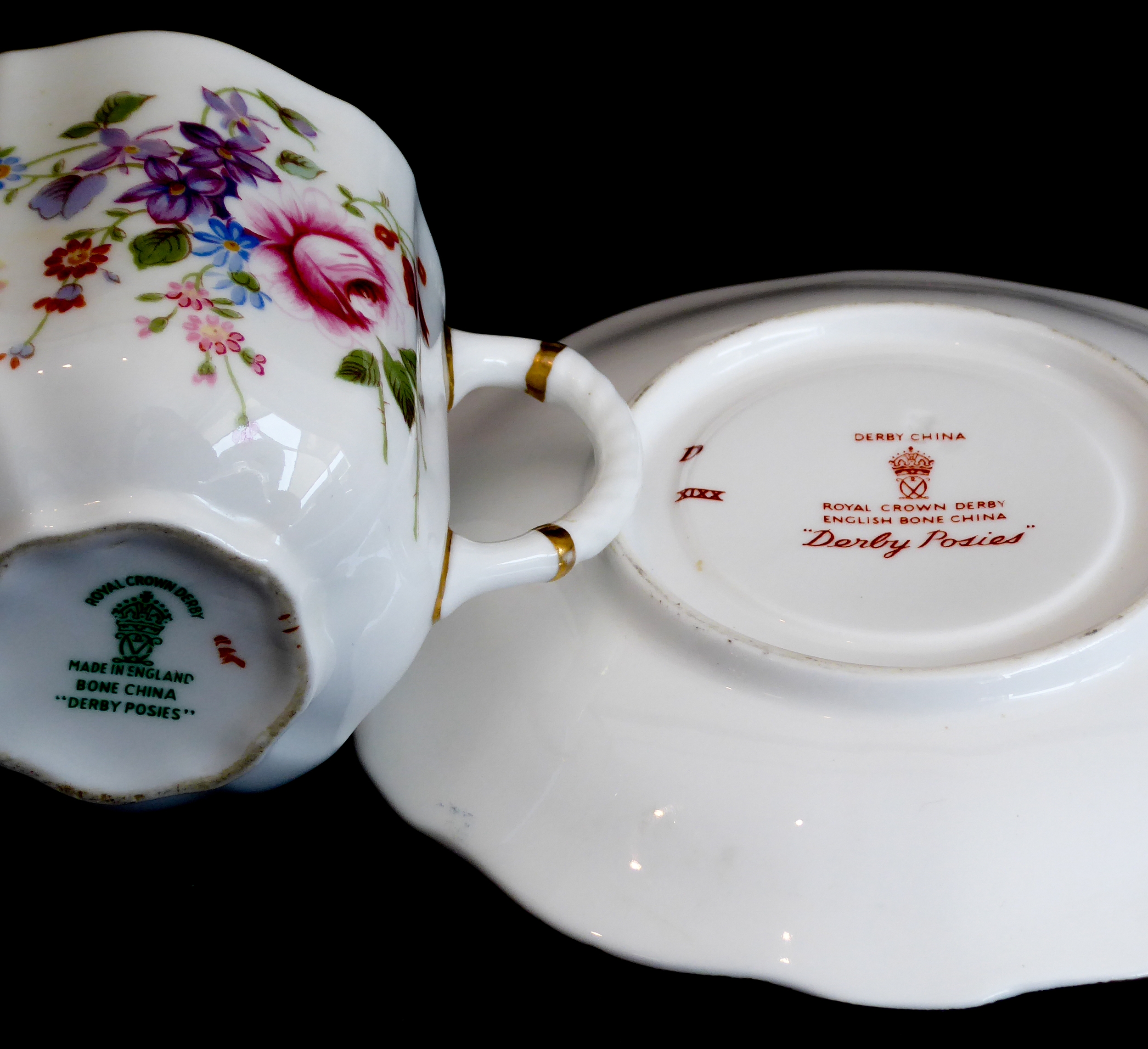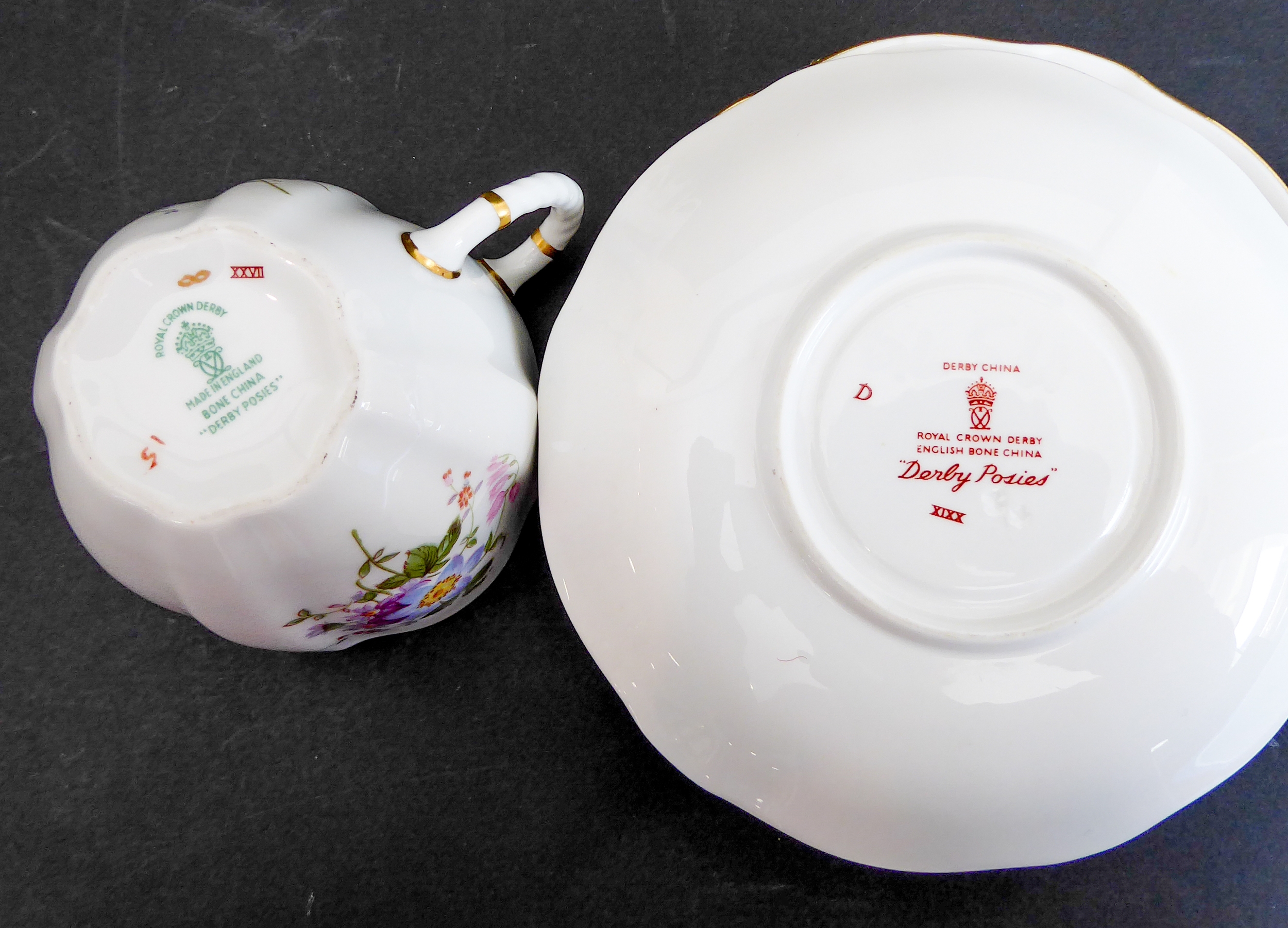 A Royal Crown Derby 'Derby Posies' six-place service comprising tea and coffee cups and saucers, side plates and a cream jug.