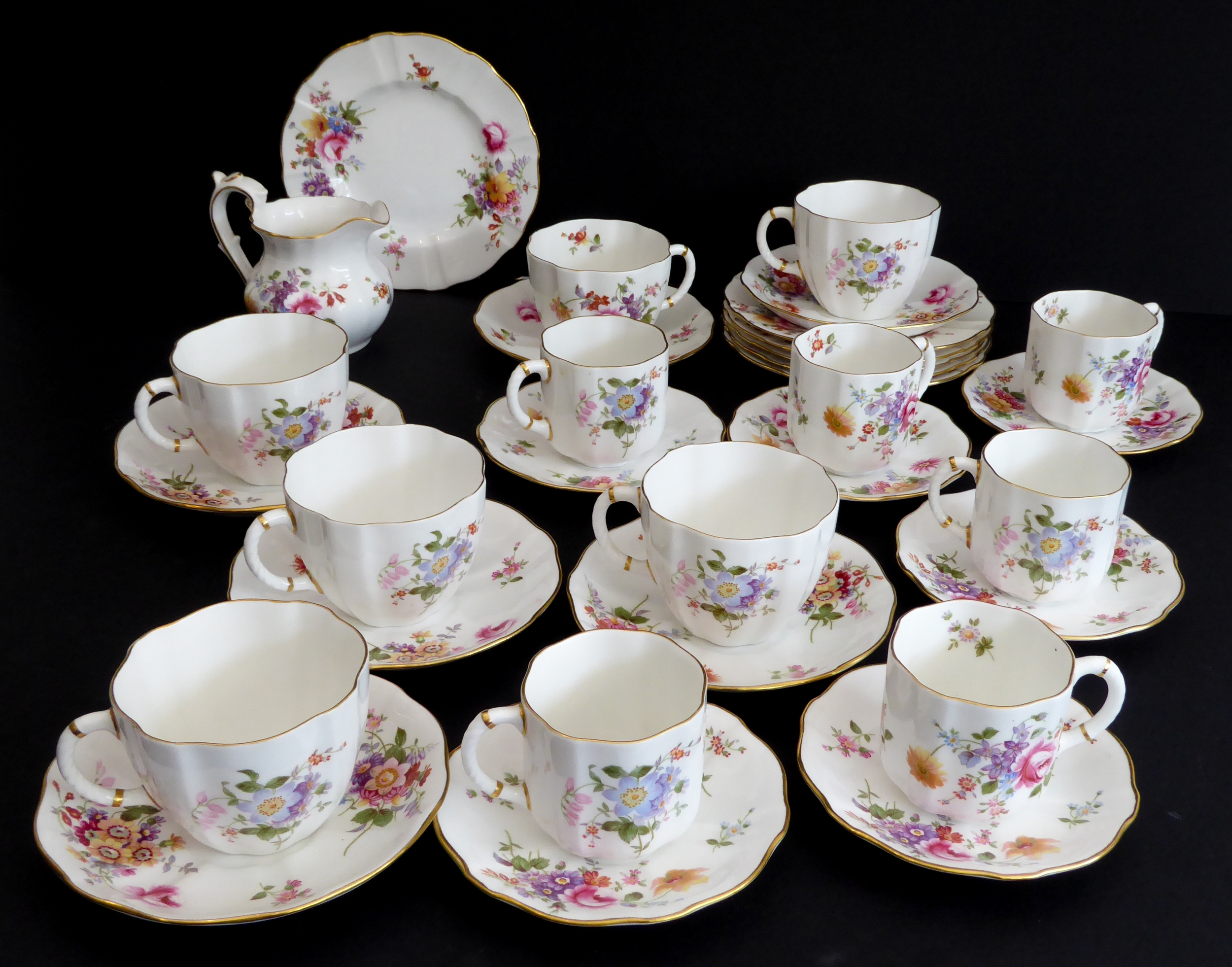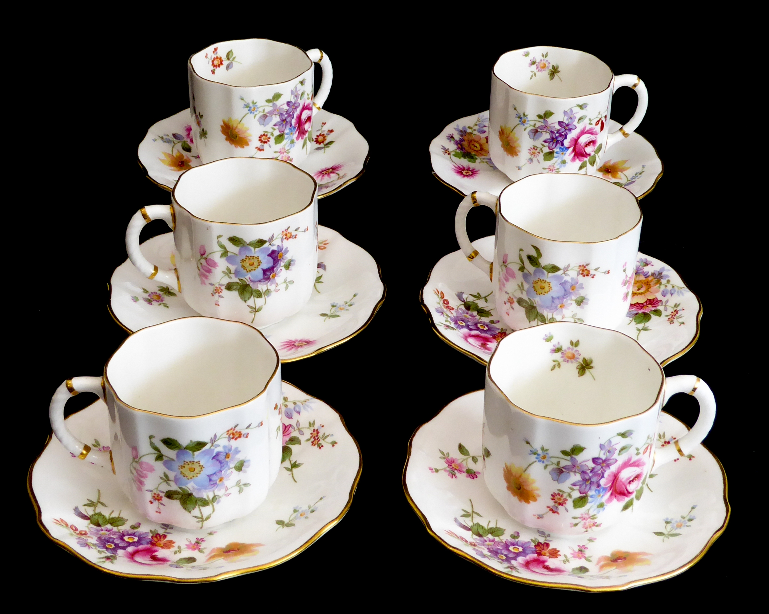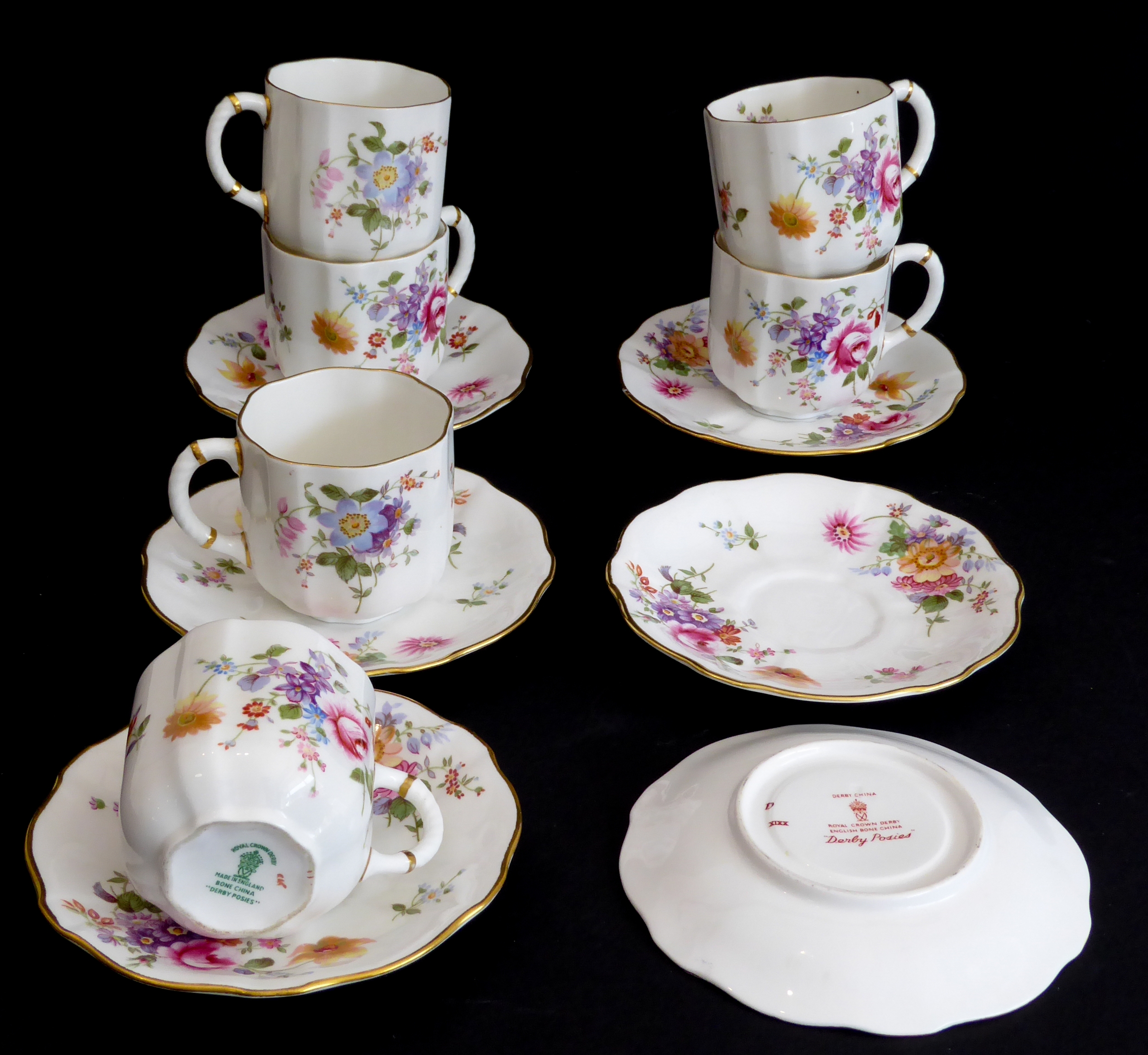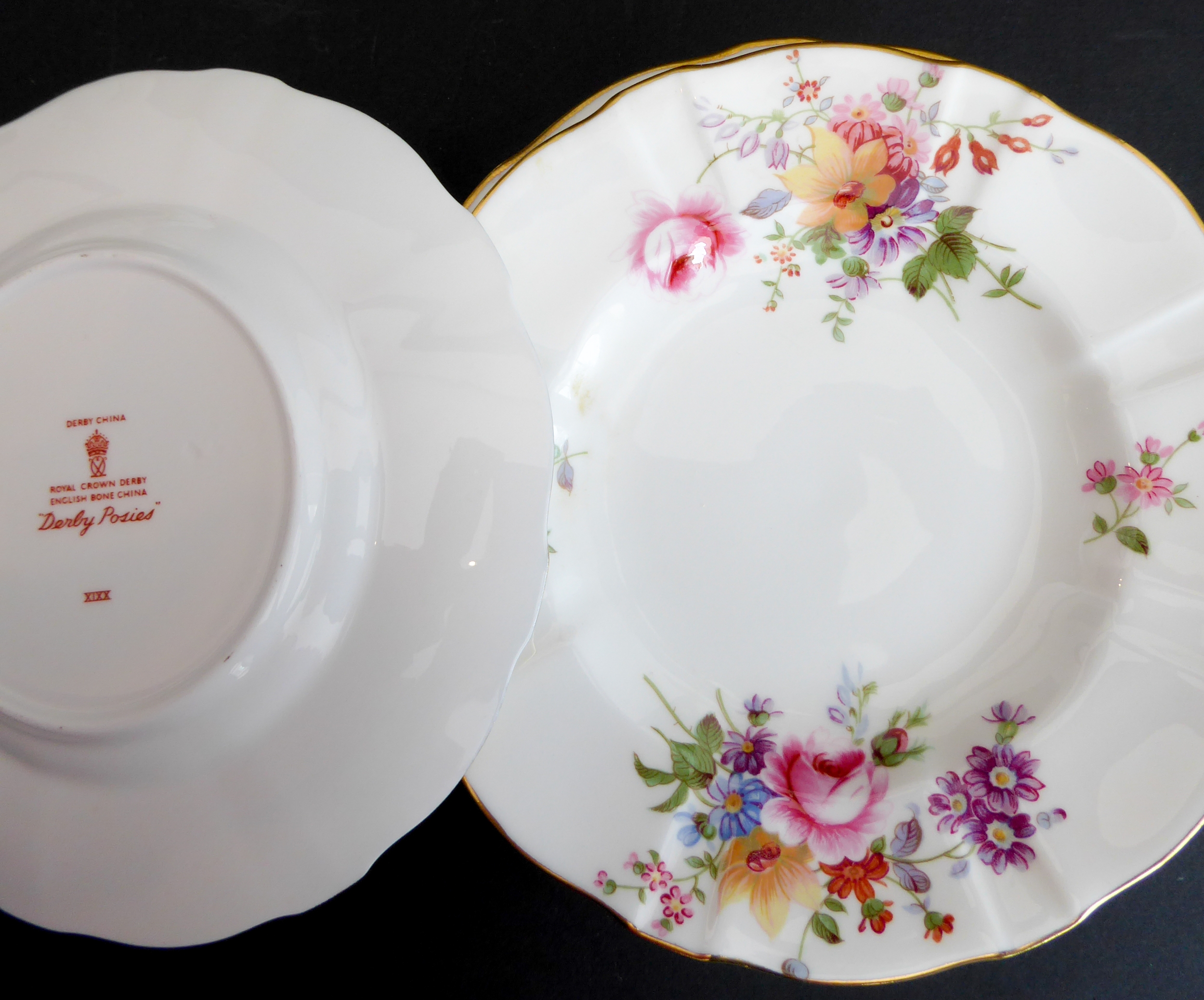 A Royal Crown Derby 'Derby Posies' six-place service comprising tea and coffee cups and saucers, side plates and a cream jug.