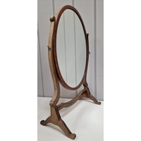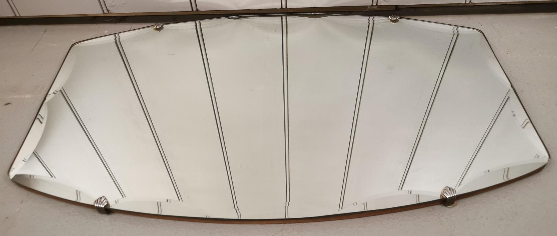 A vintage, hanging, scallop & bevelled edged wall mirror, with unusual claw fixings. Dimensions 38cm x 68cm.