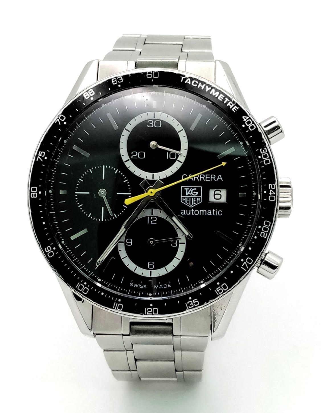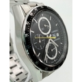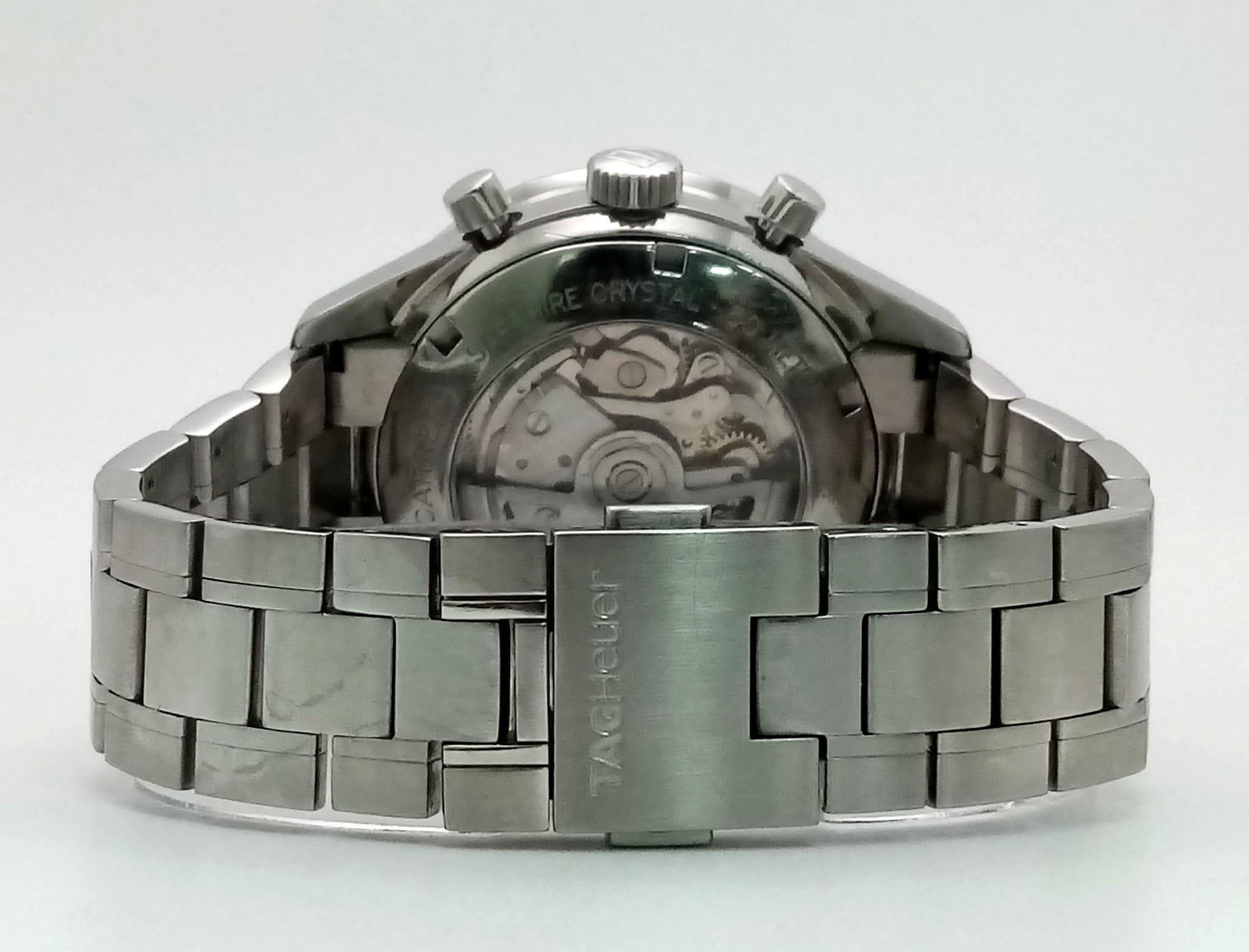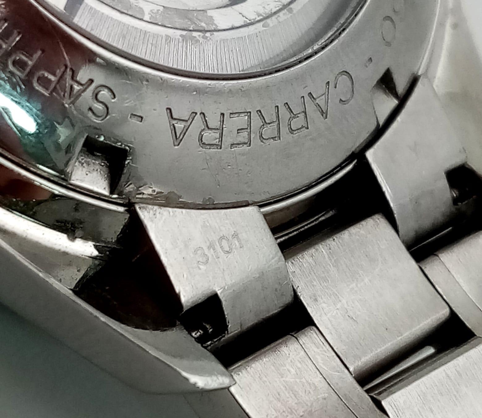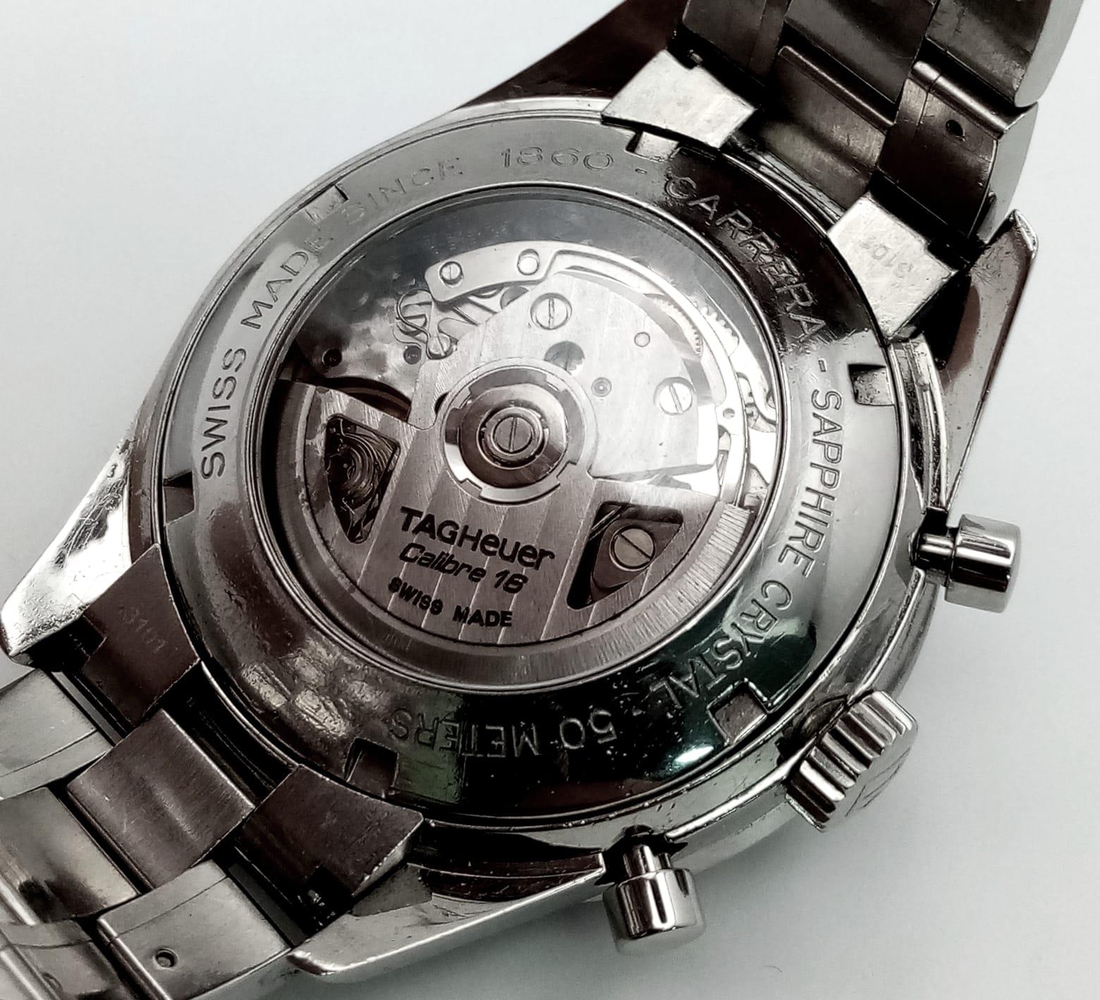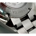 An Automatic Tag Carrera Chronograph Gents Watch. Stainless steel strap and case - 42mm. Black dial with three sub dials. Skeleton back. In good condition.