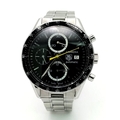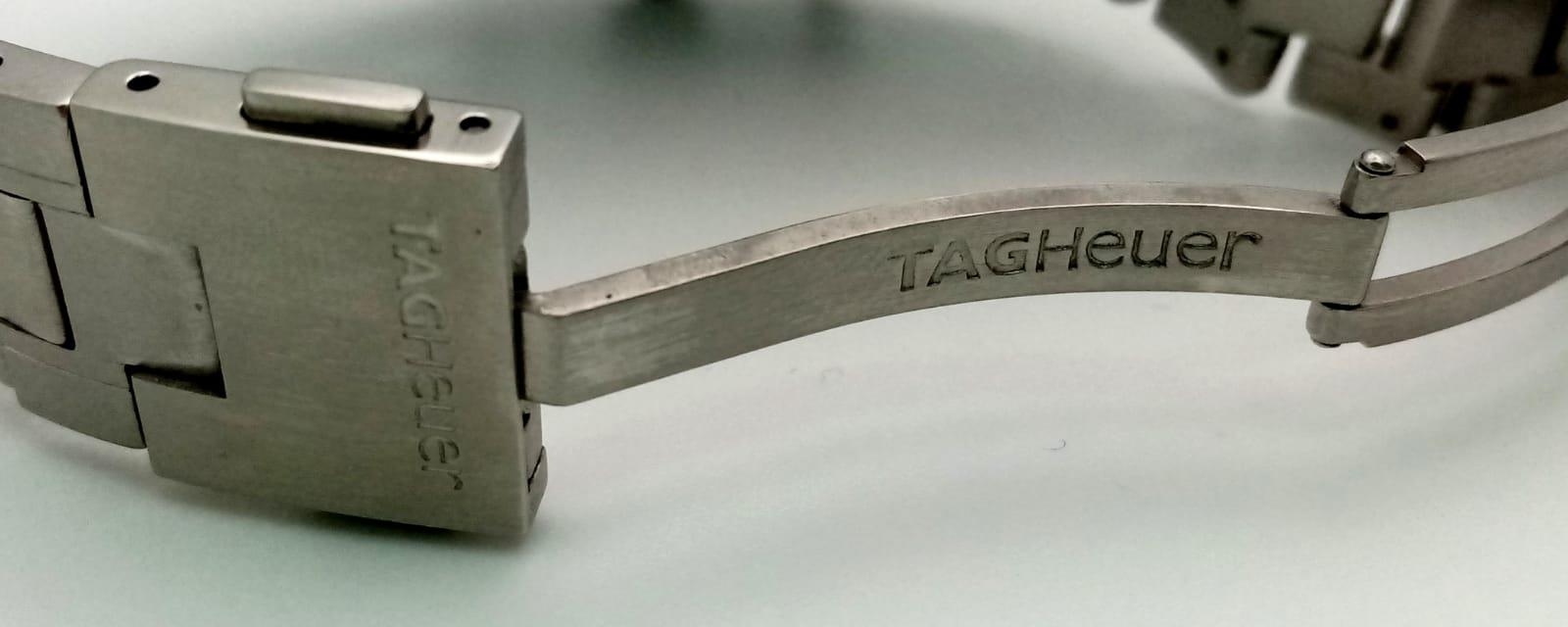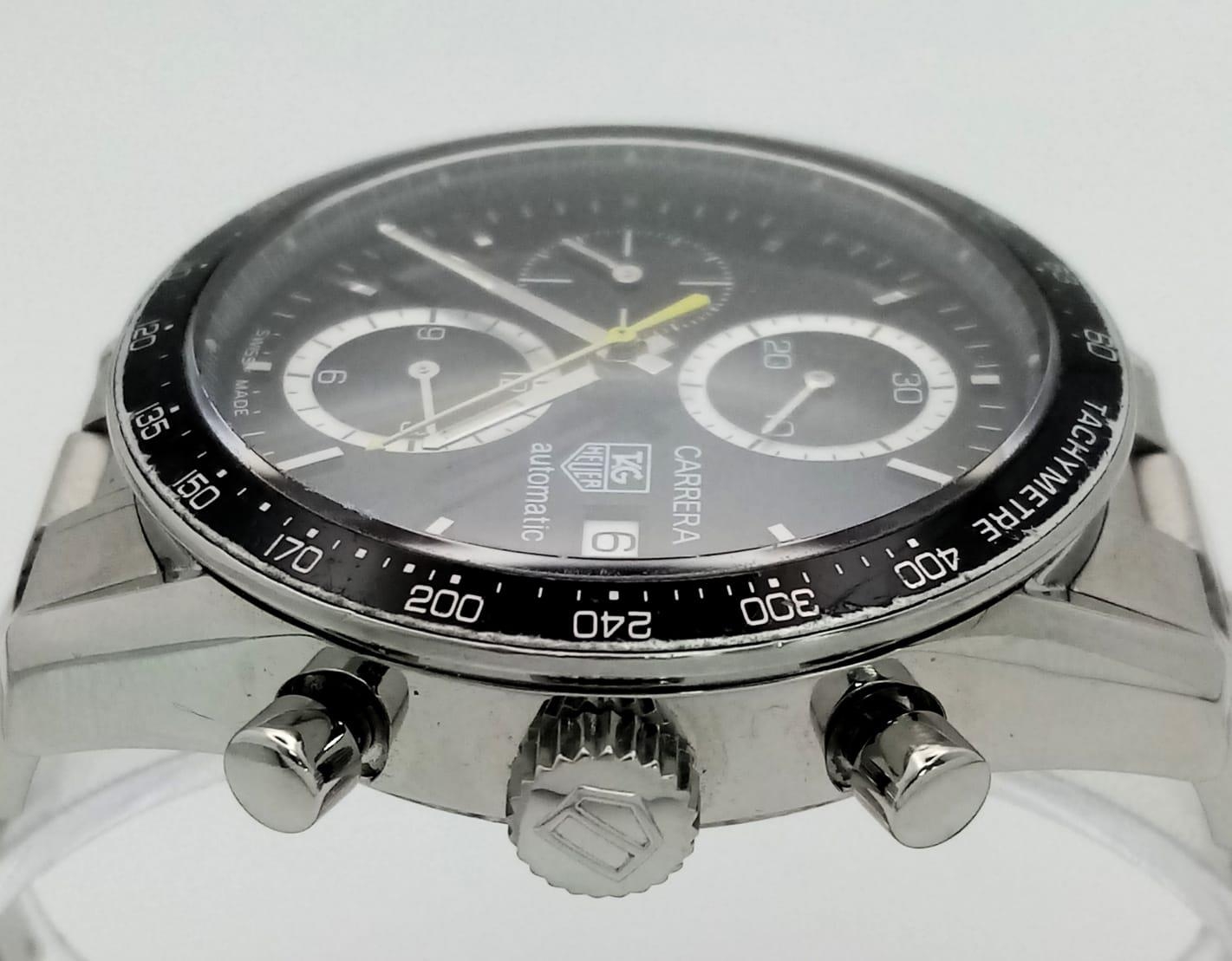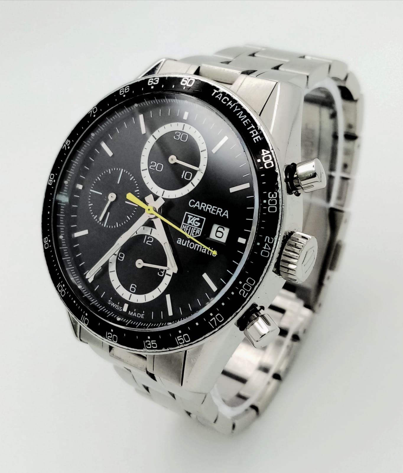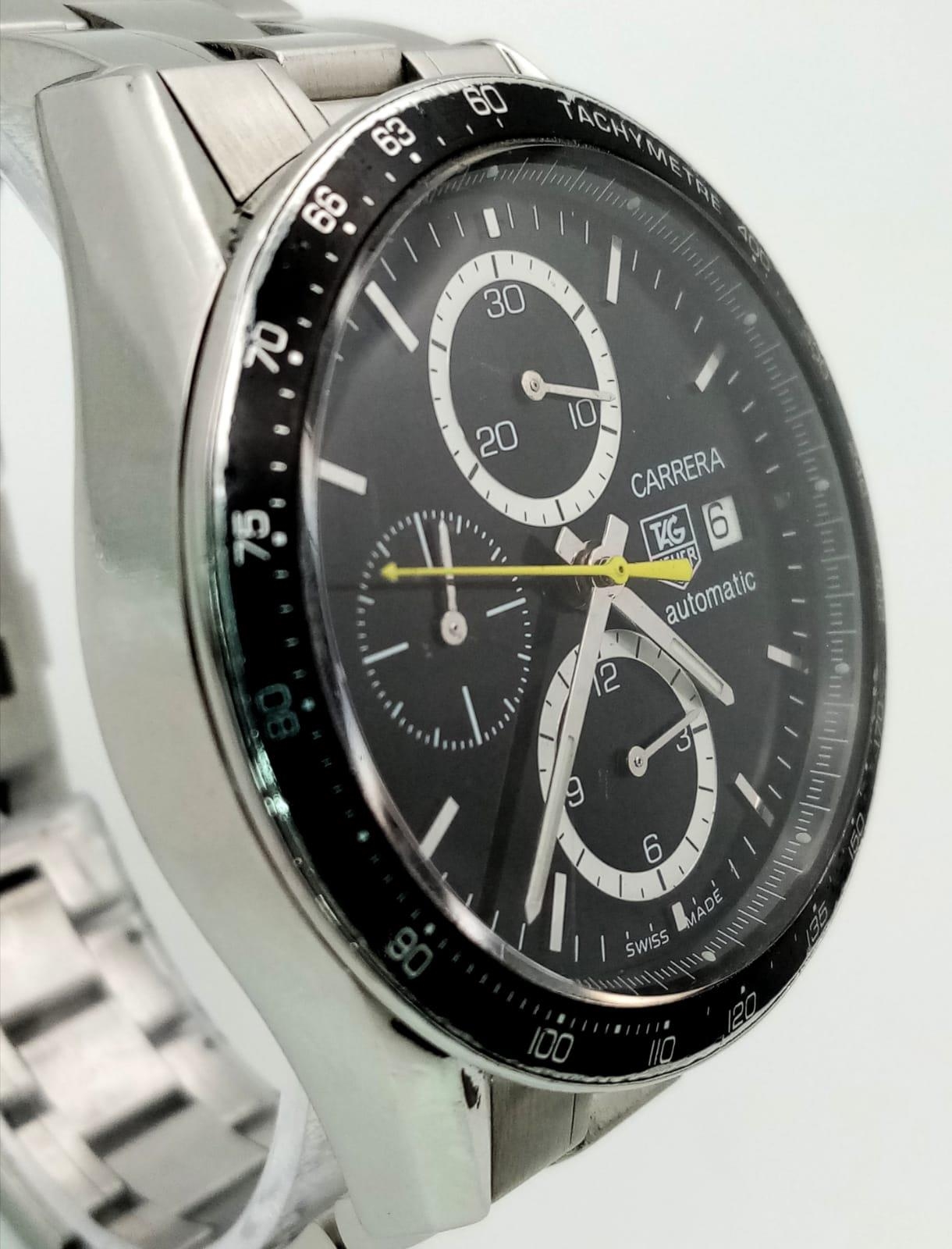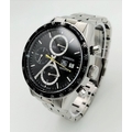 An Automatic Tag Carrera Chronograph Gents Watch. Stainless steel strap and case - 42mm. Black dial with three sub dials. Skeleton back. In good condition.