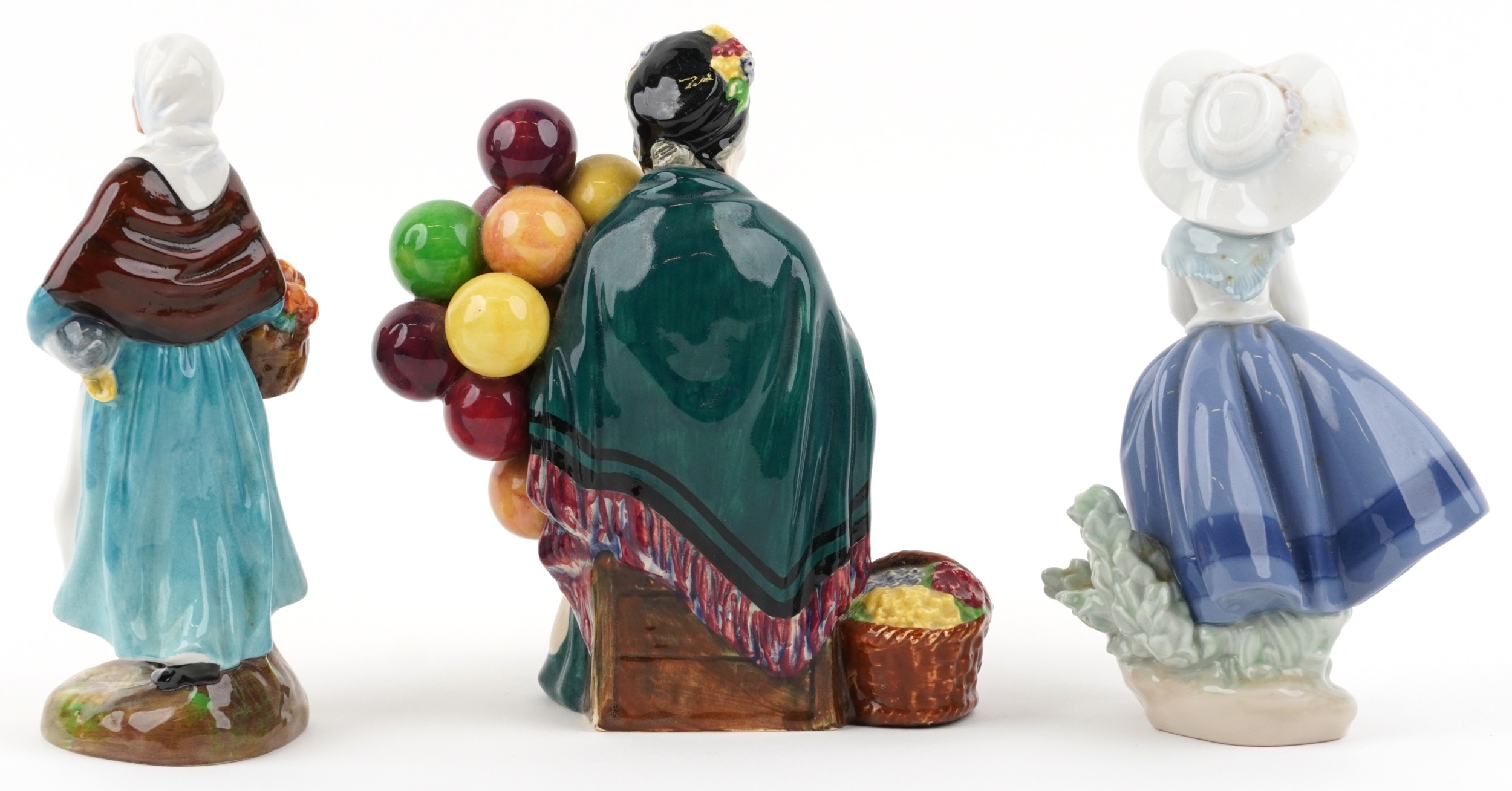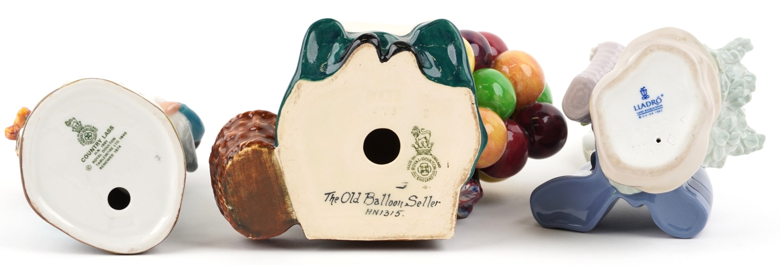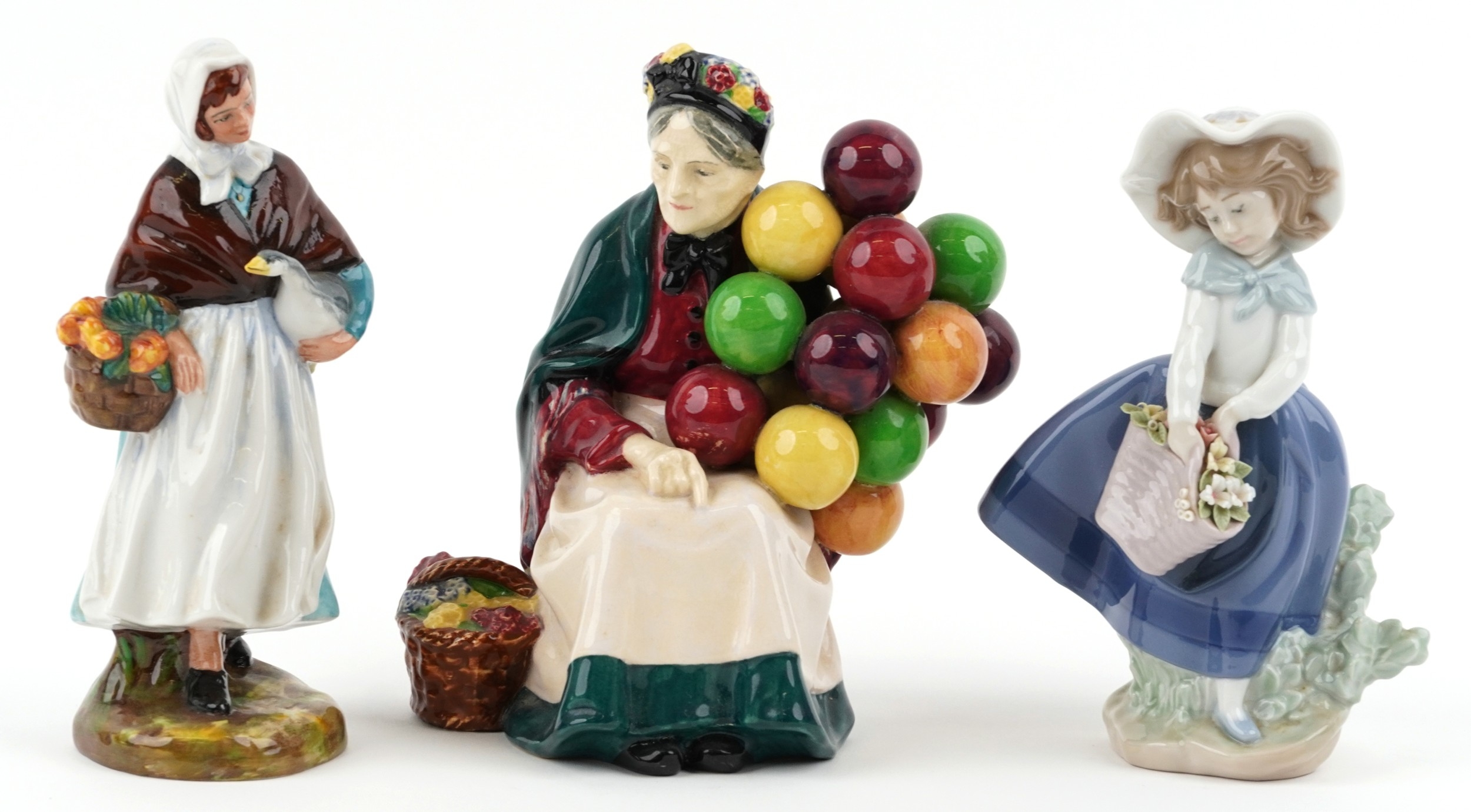A Royal Doulton The Old Balloon Seller HN 1315 together with a Royal Doulton Country Lass HN 1991 and a Lladro figure of a girl holding a basket, the largest 18cm high.