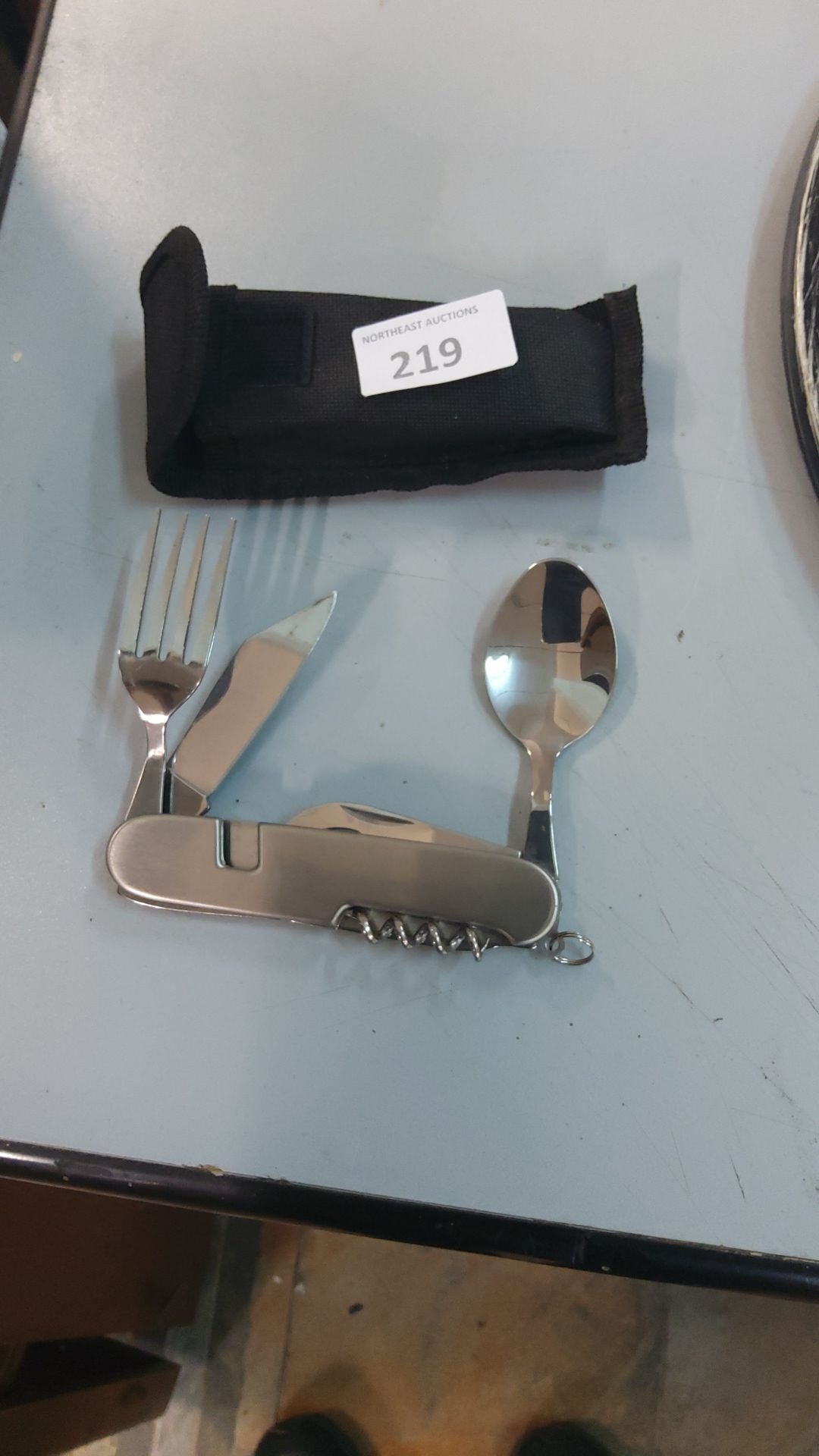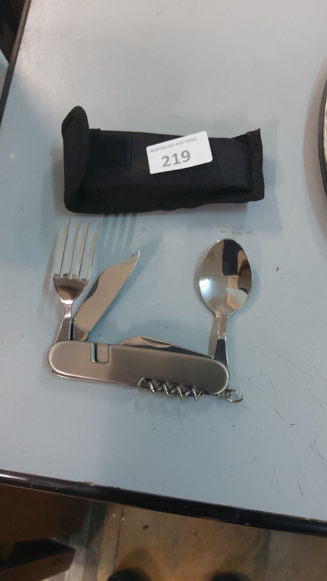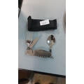 Stainless steel camping utensil tool includes a fork, knife, spoon, corkscrew, and pouch.