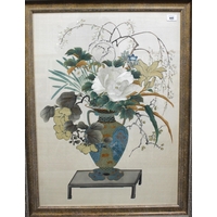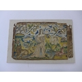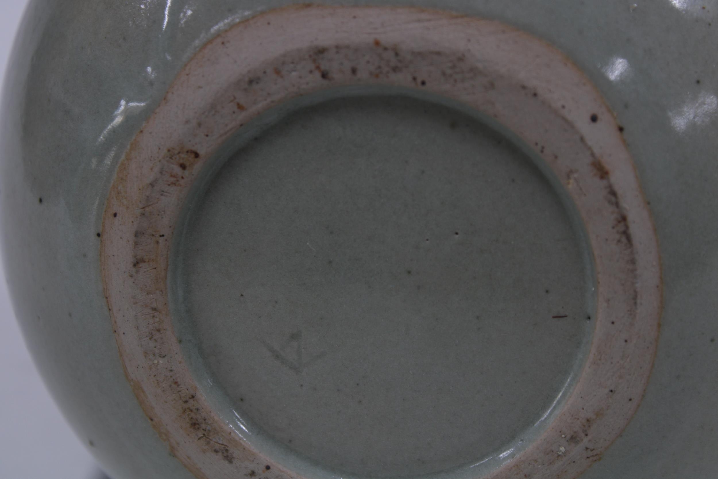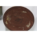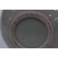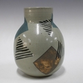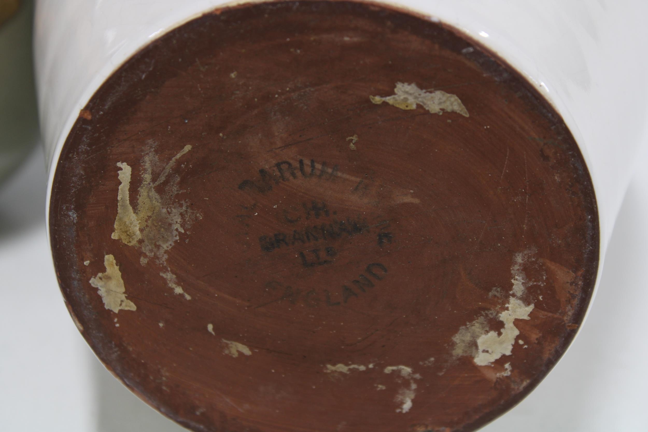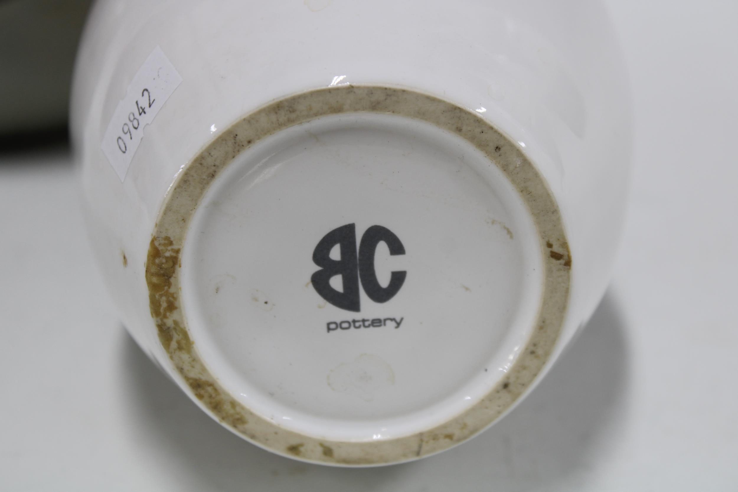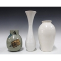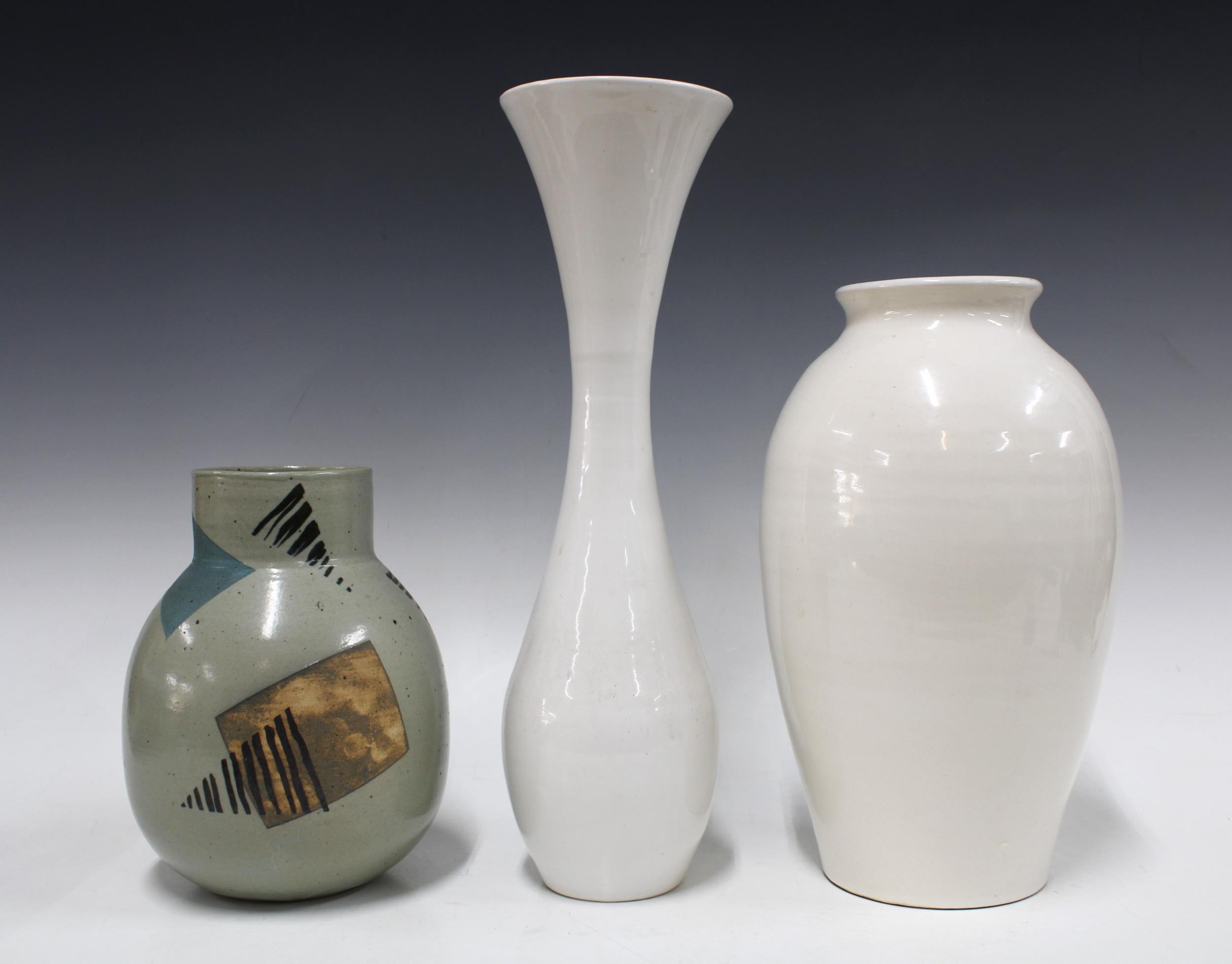 Three studio pottery vases to include a large vase of slender proportions, a white glazed Brannam baluster vase and a smaller vase with geometric pattern, (3)
