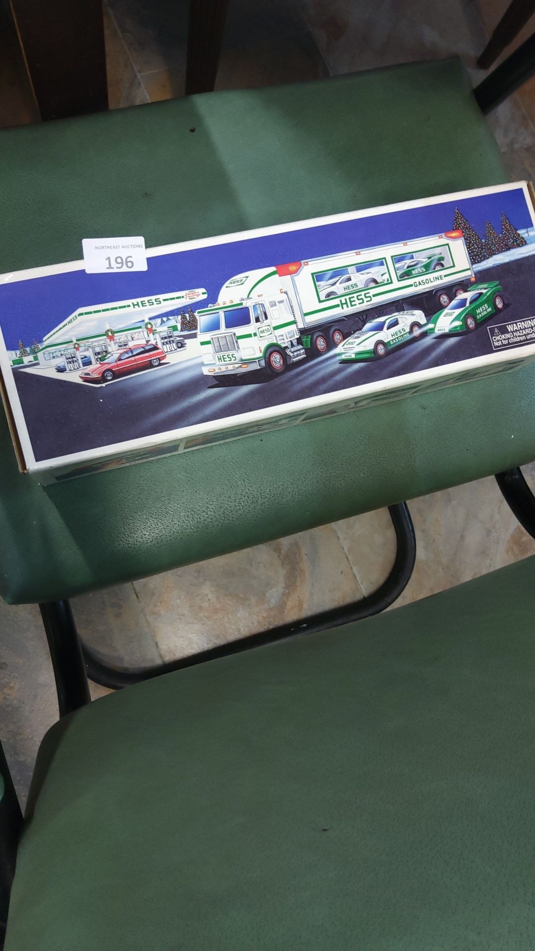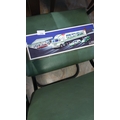 Hess Toy Truck, complete with original box. Features vibrant artwork displaying classic delivery truck and race cars. Reflects vintage design.