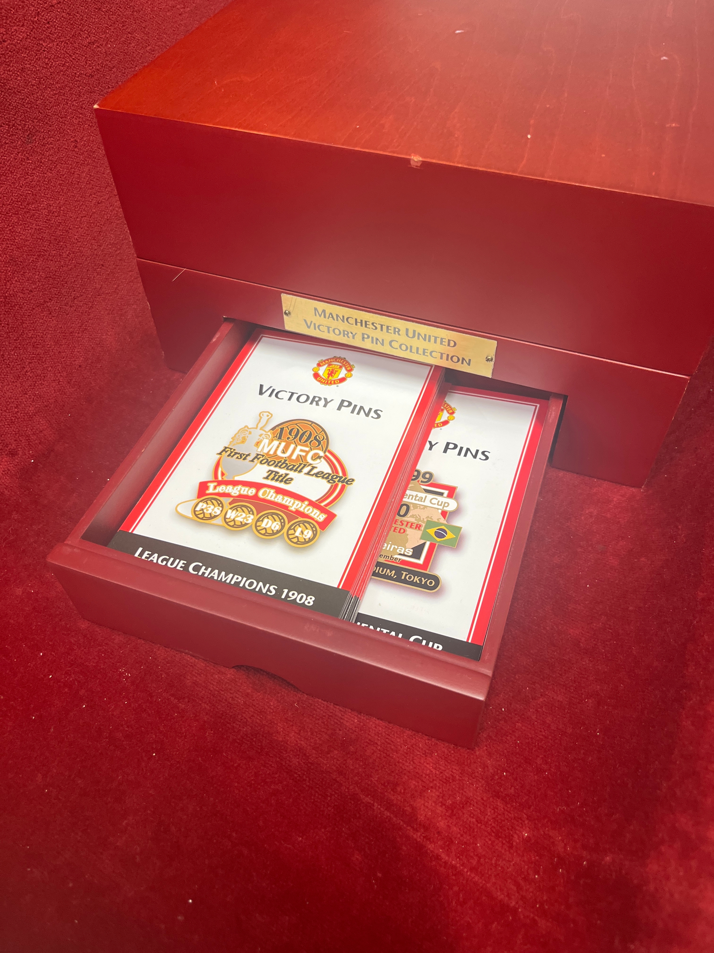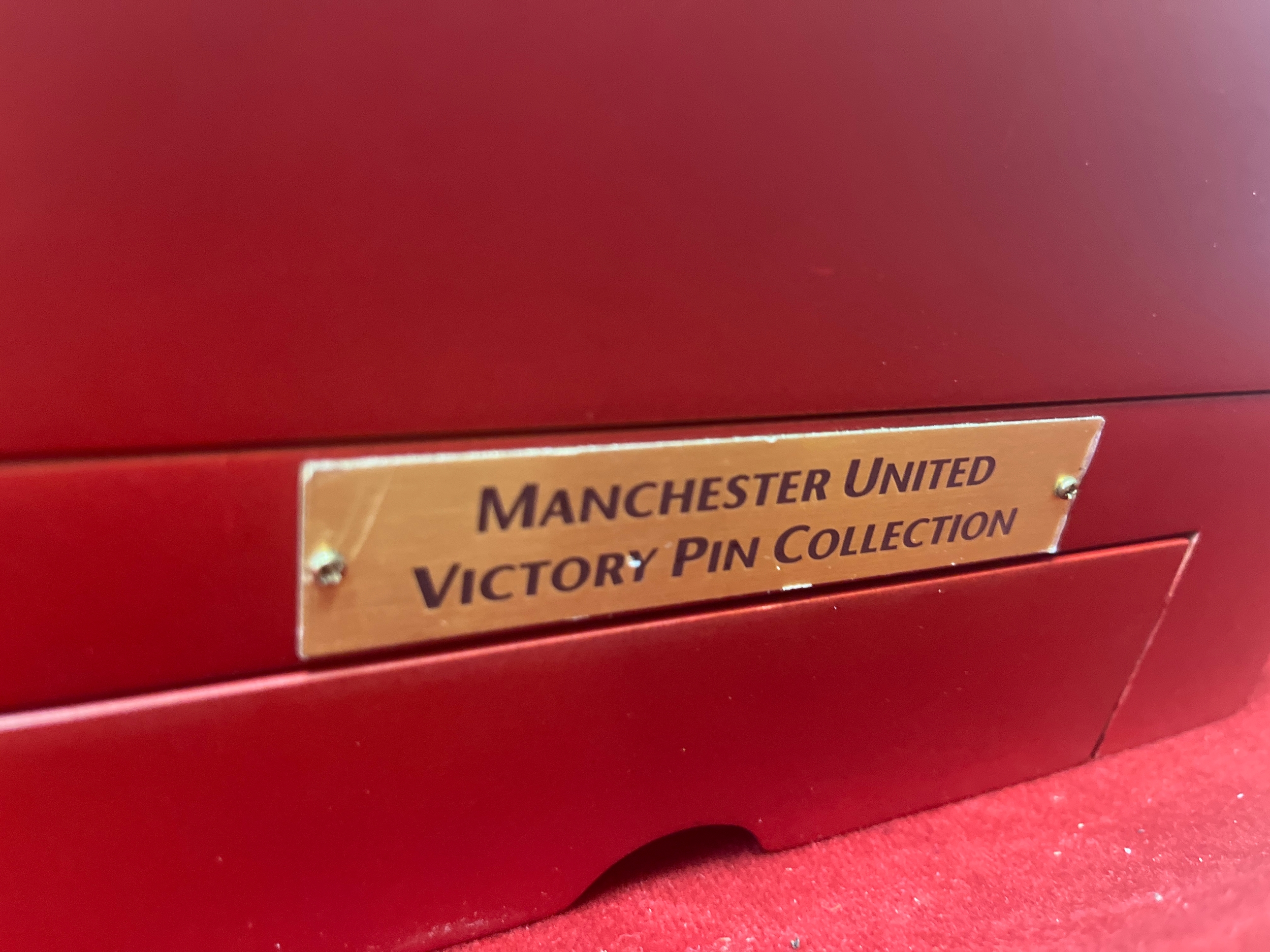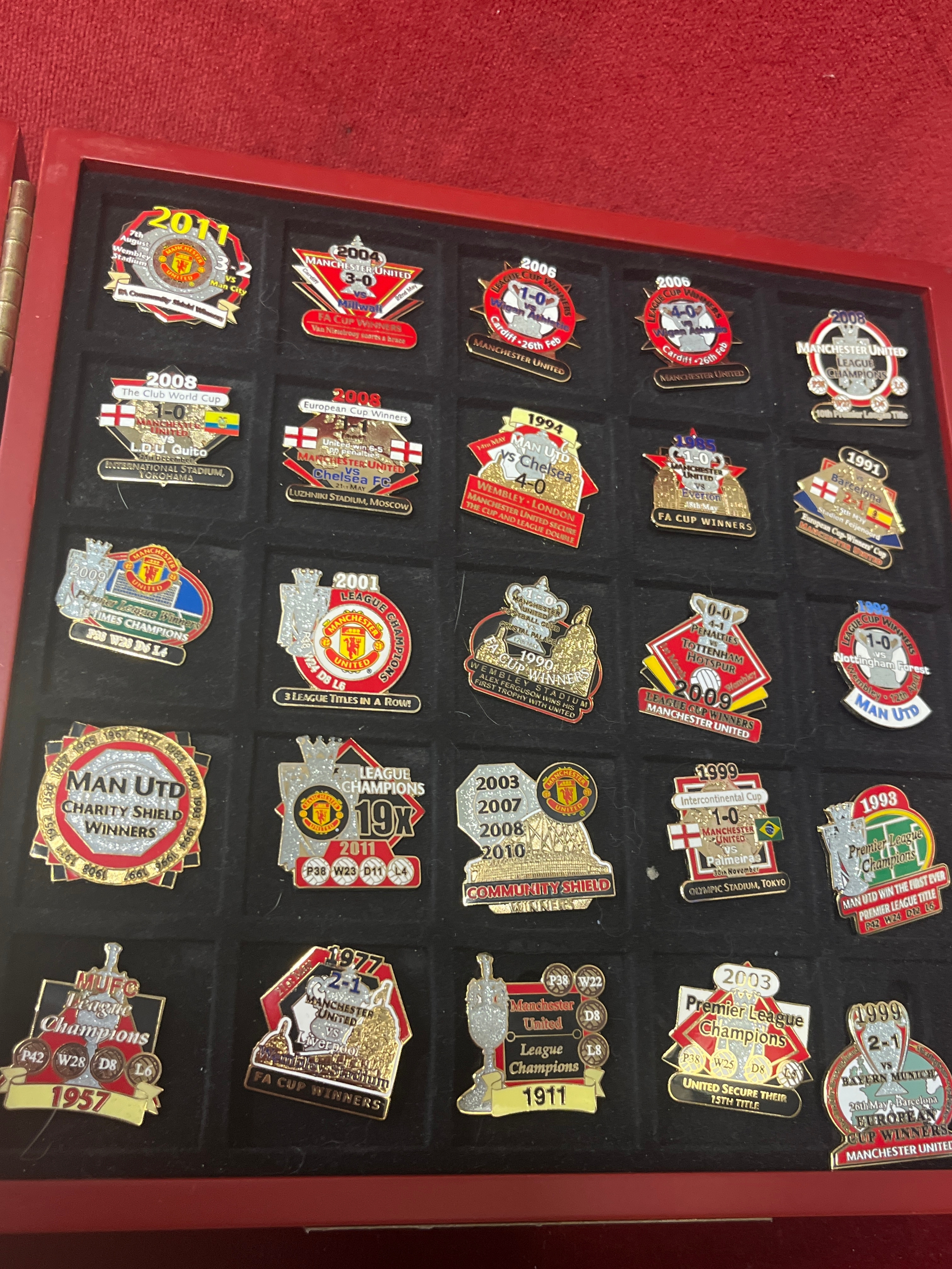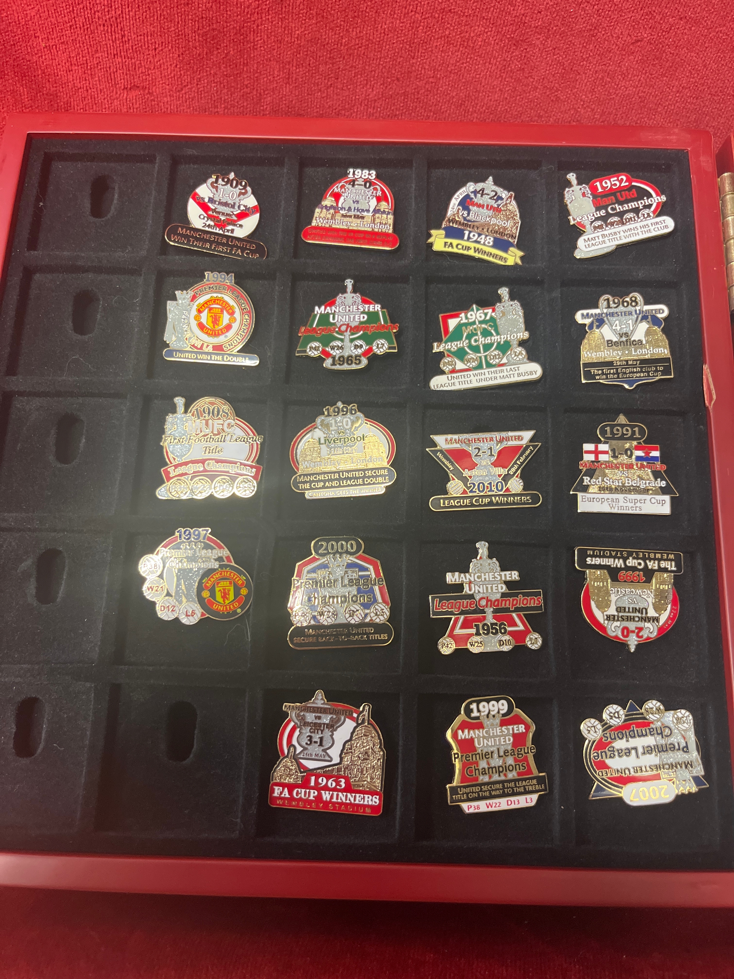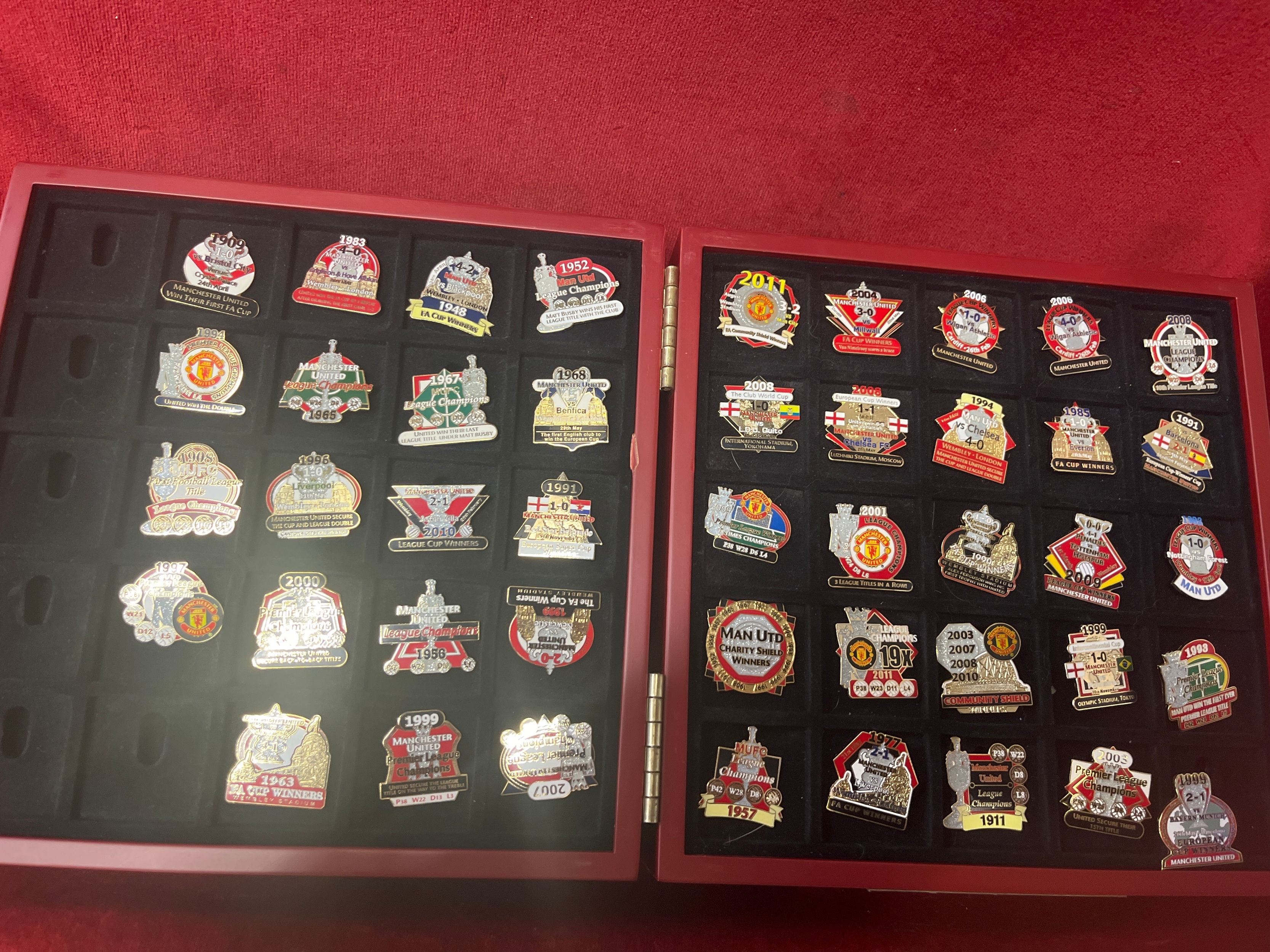 Manchester United Victory Pin collection , 44 badges Danbury mint (6 missing badges available). Drawer to side holds the certificates