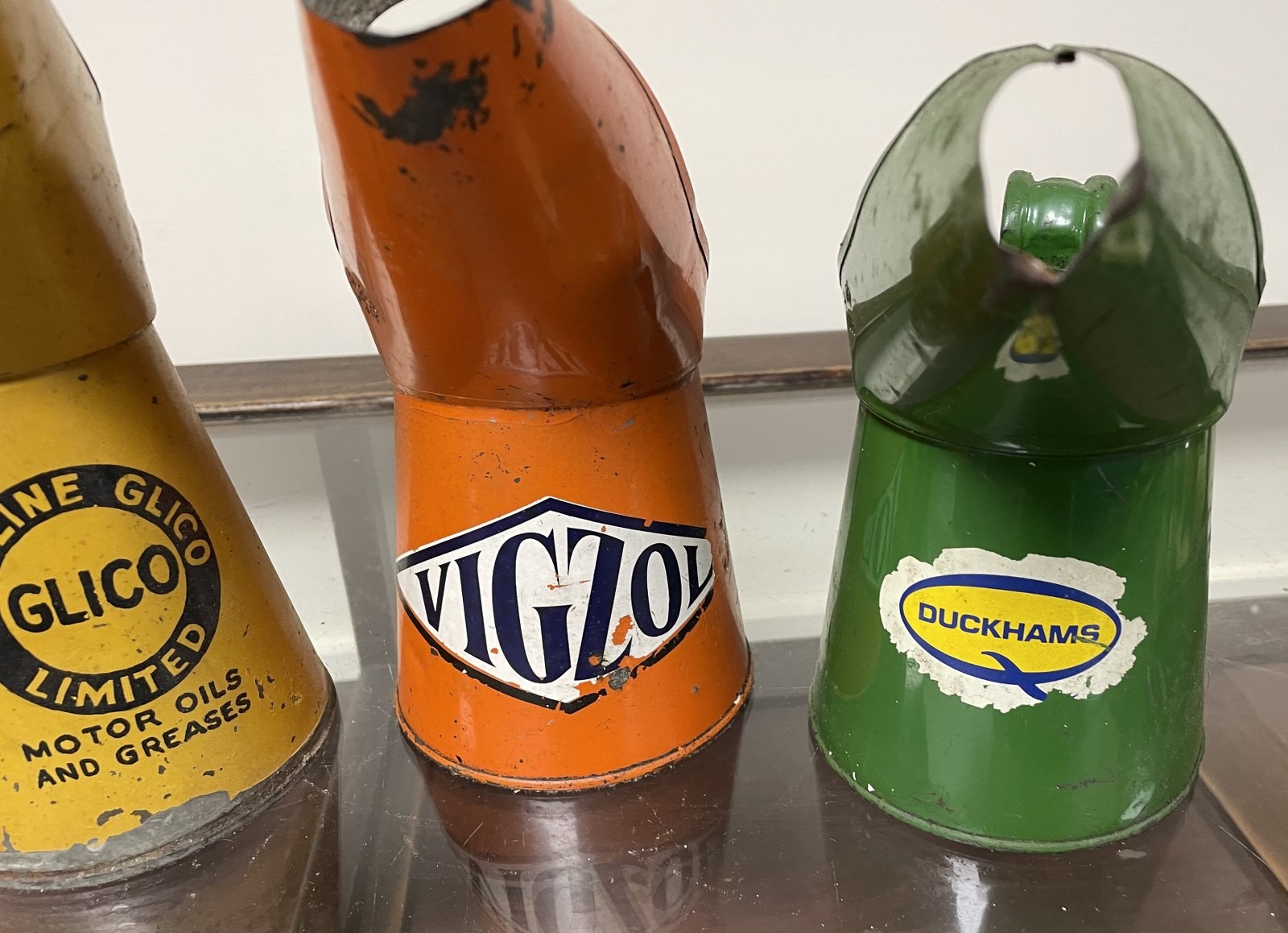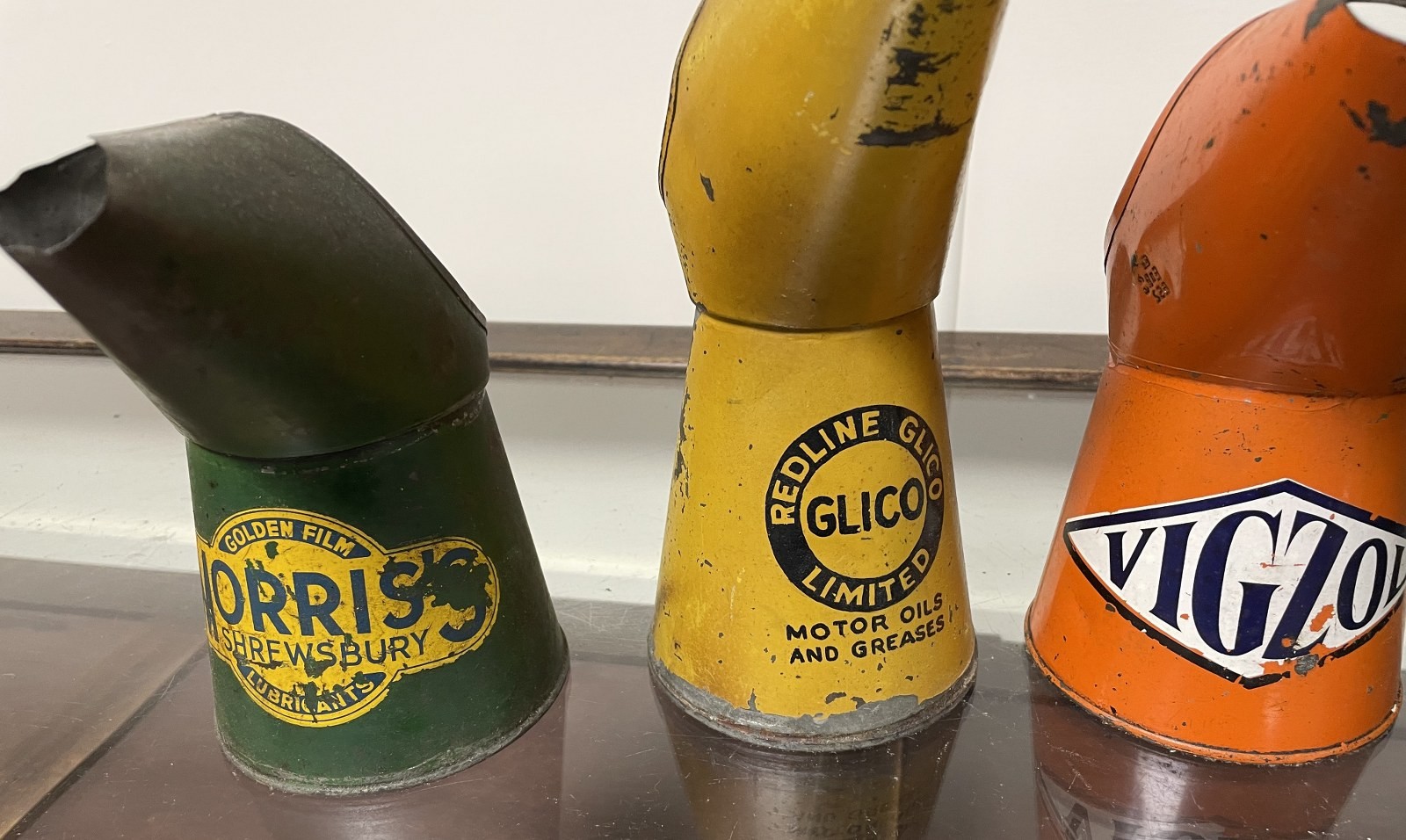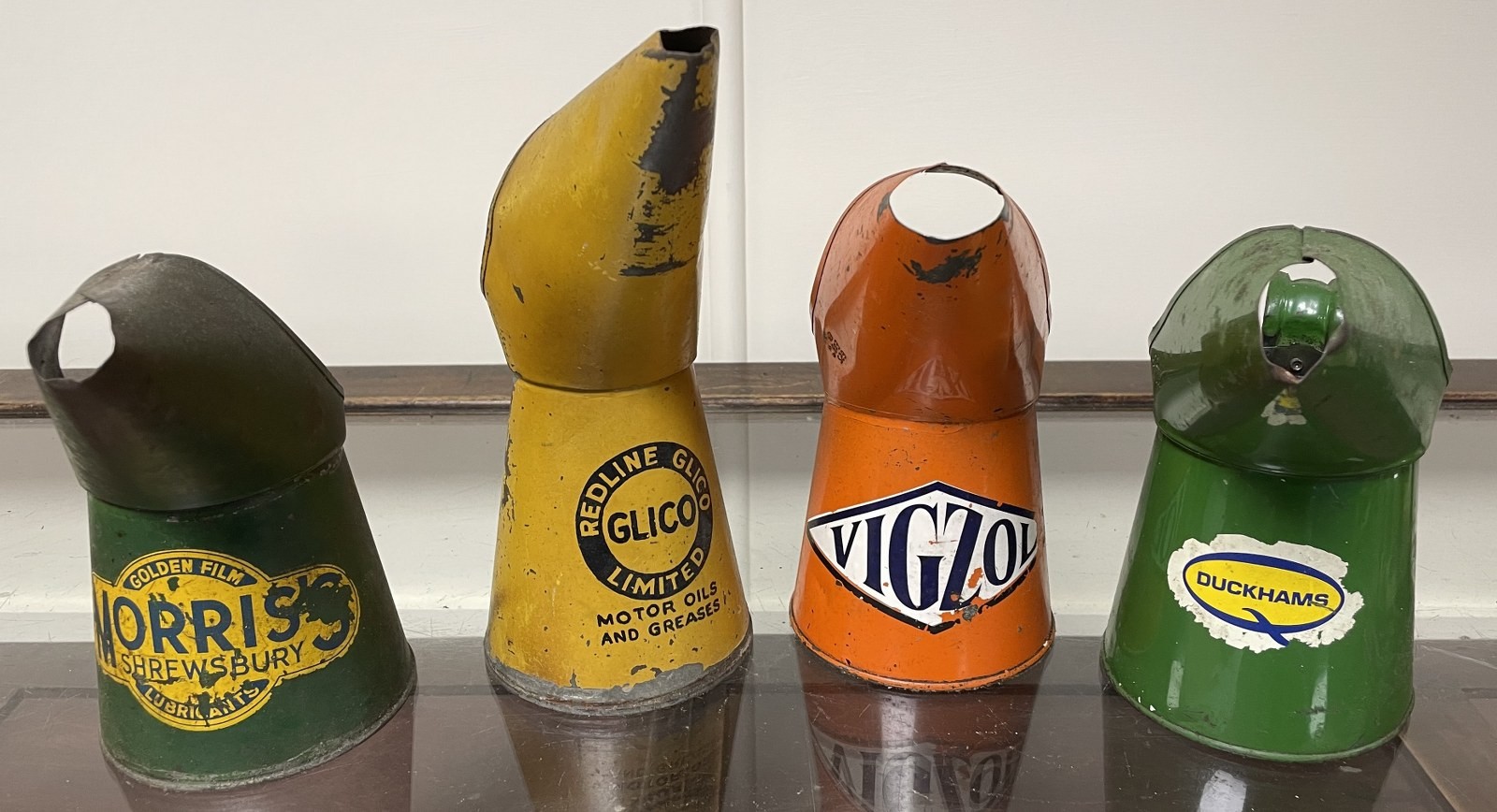 A Morris Shrewsbury Golden Film Lubricants oil jug, 17.5 cm high, and three others (4)