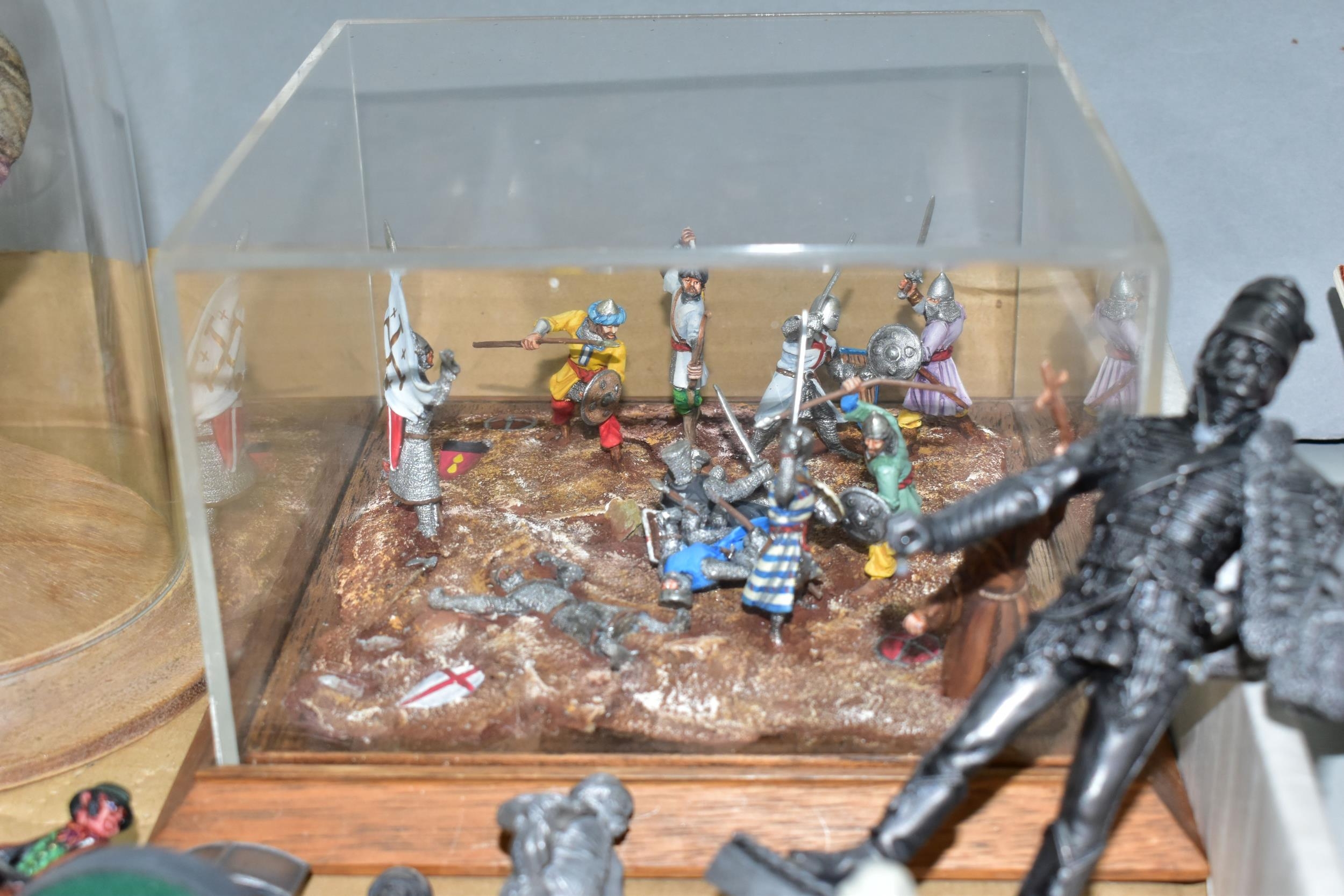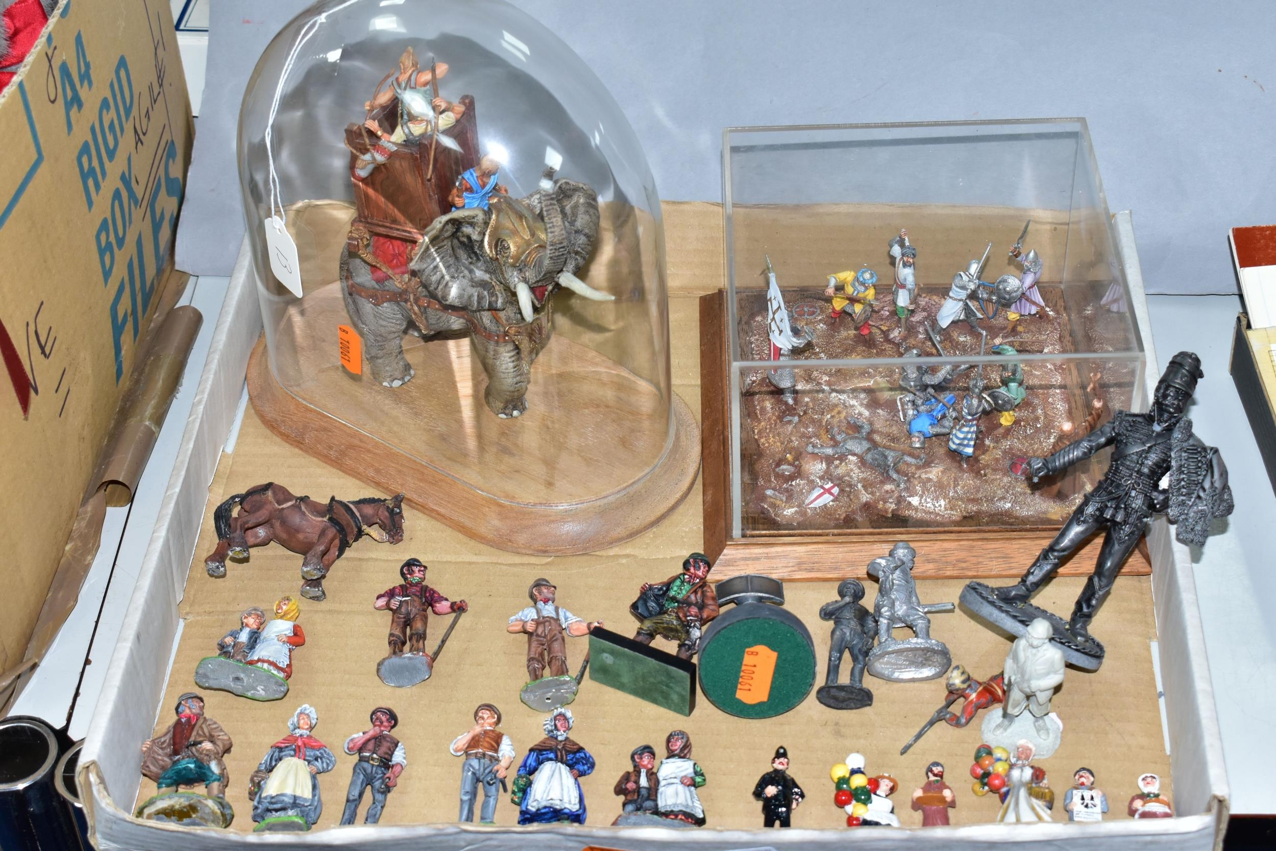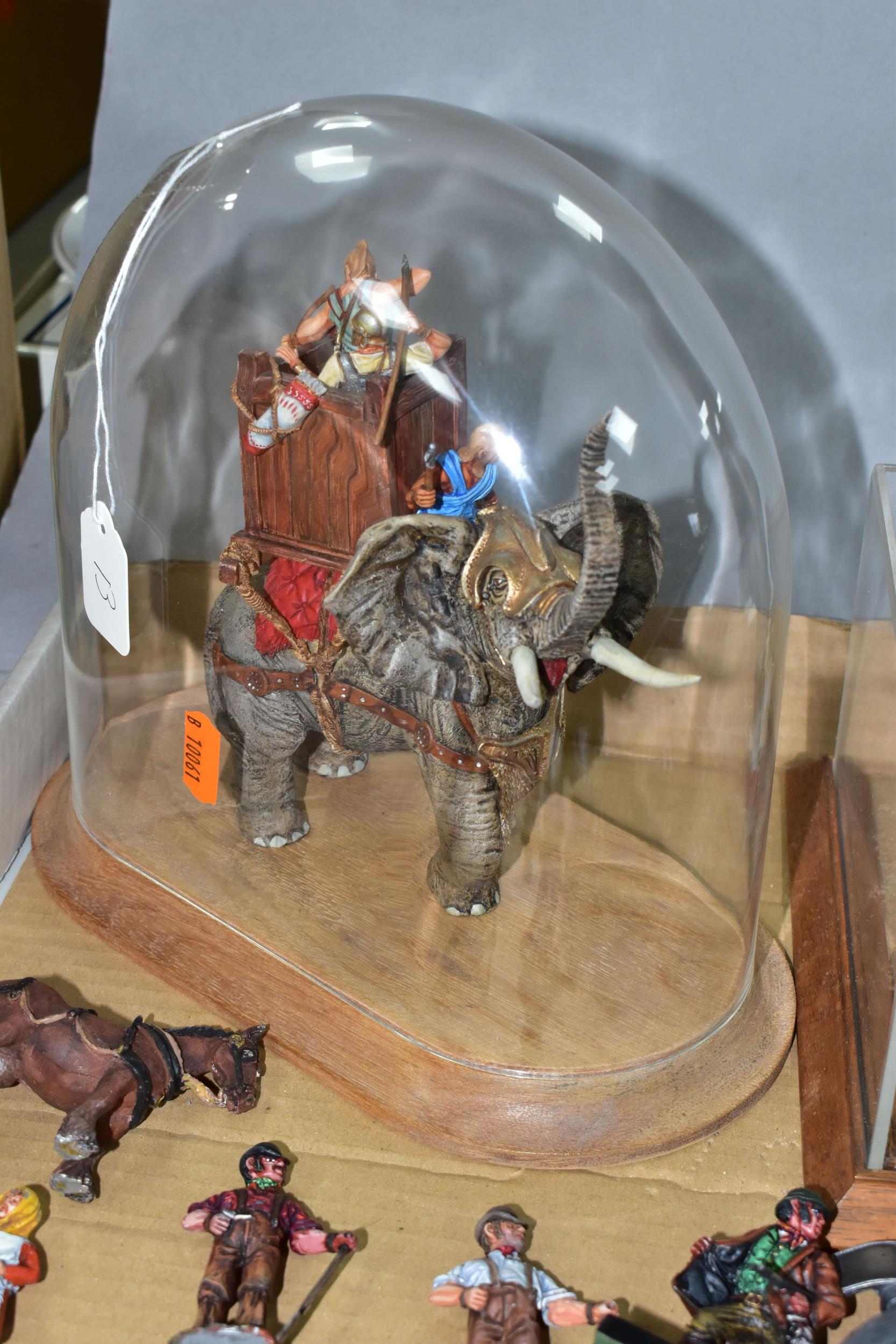 A QUANTITY OF MODERN CAST FIGURES, to include a war Elephant wearing armour and carrying a howdah and crew on his back, marked J. Ridle? to base of one foot, loosely mounted on a wooden plinth under a perspex dome, with a battle scene from the Crusades diorama, mounted on a wooden base under a perspex cover, size approx. 18cm x 18cm and a quantity of assorted loose figures, some with makers names to bases, majority in fairly good condition with only minor wear