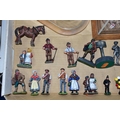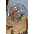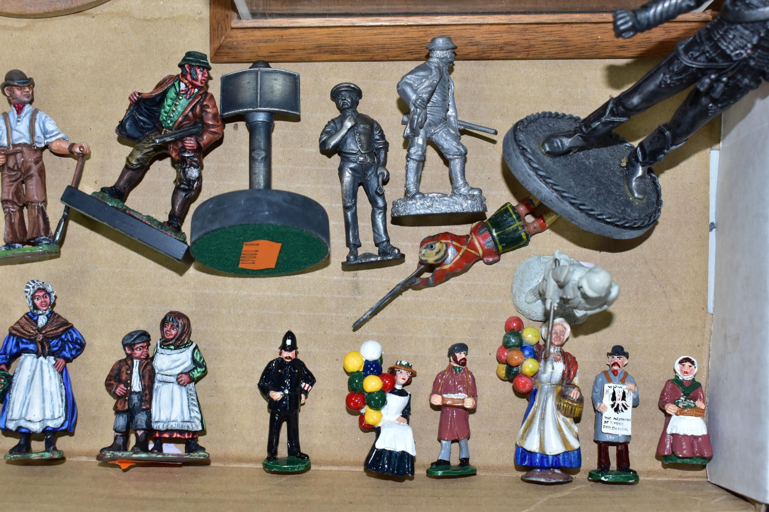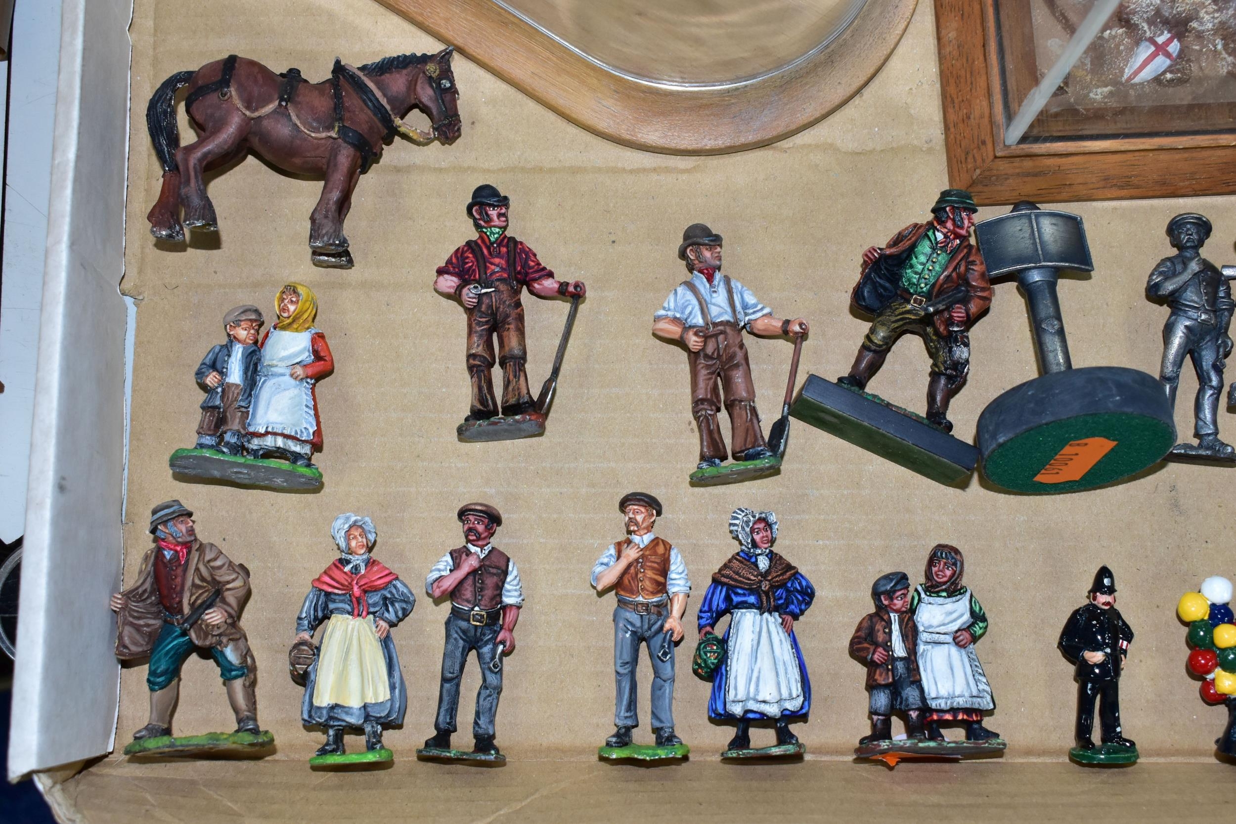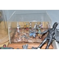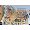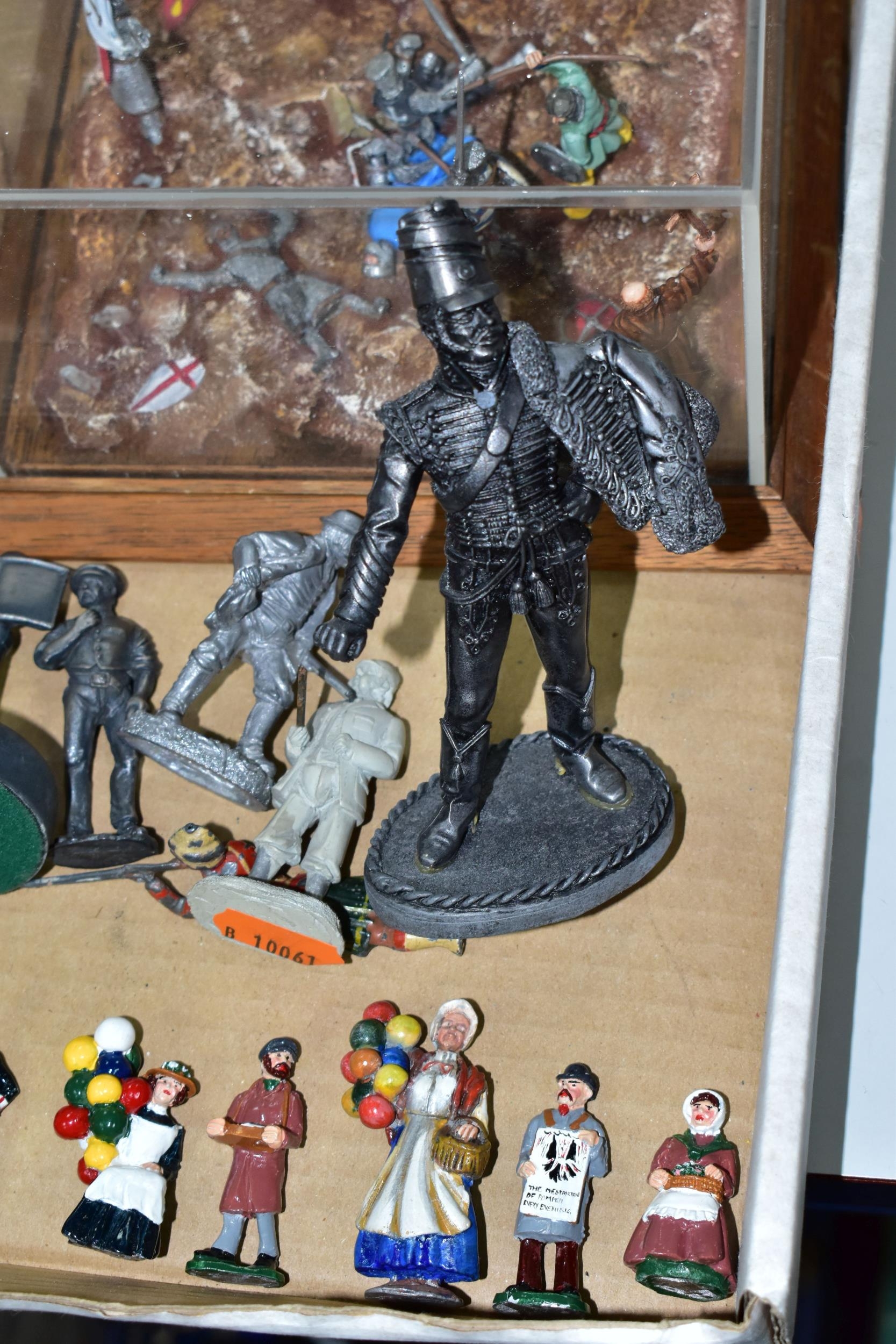 A QUANTITY OF MODERN CAST FIGURES, to include a war Elephant wearing armour and carrying a howdah and crew on his back, marked J. Ridle? to base of one foot, loosely mounted on a wooden plinth under a perspex dome, with a battle scene from the Crusades diorama, mounted on a wooden base under a perspex cover, size approx. 18cm x 18cm and a quantity of assorted loose figures, some with makers names to bases, majority in fairly good condition with only minor wear