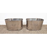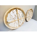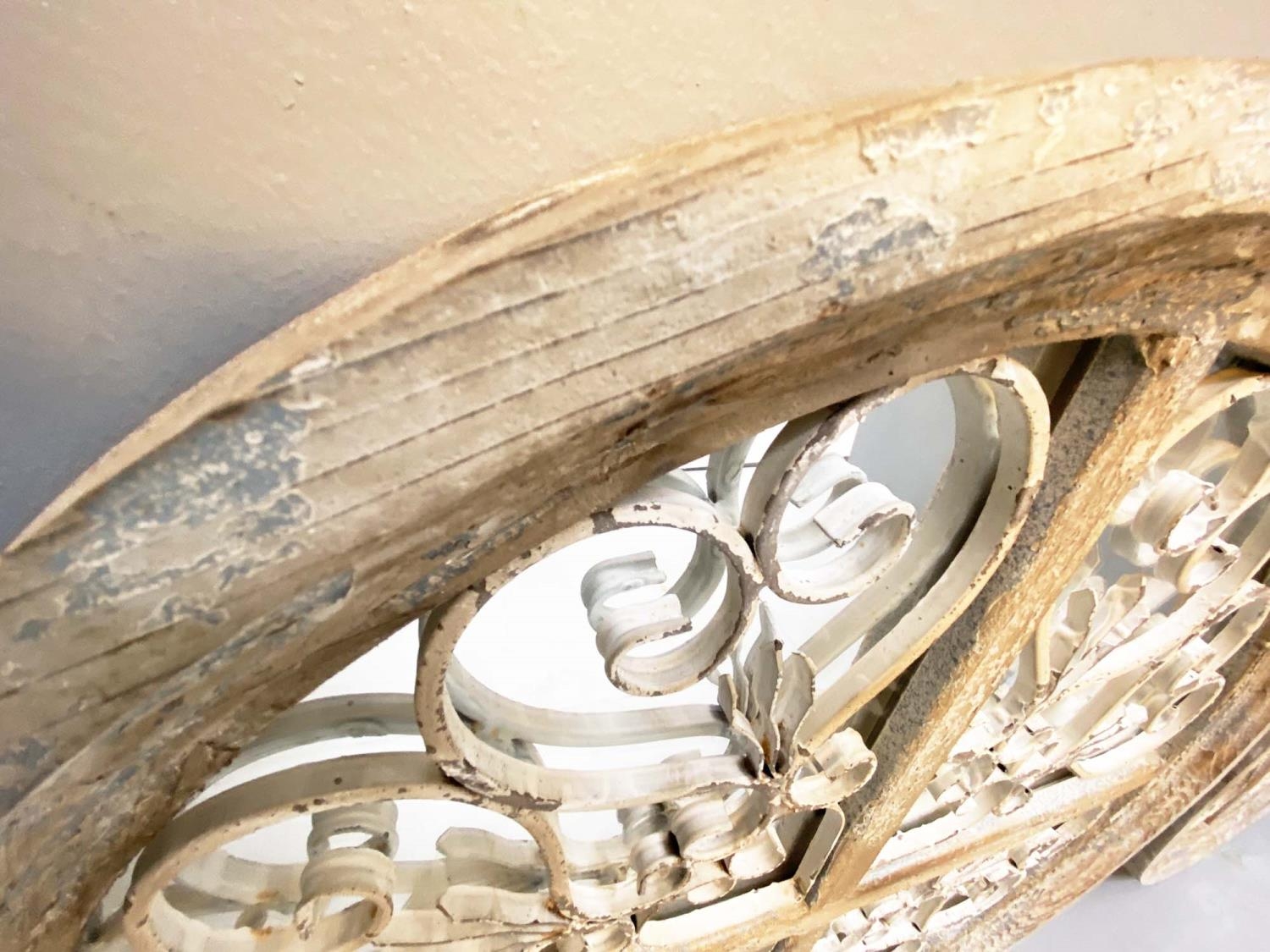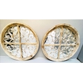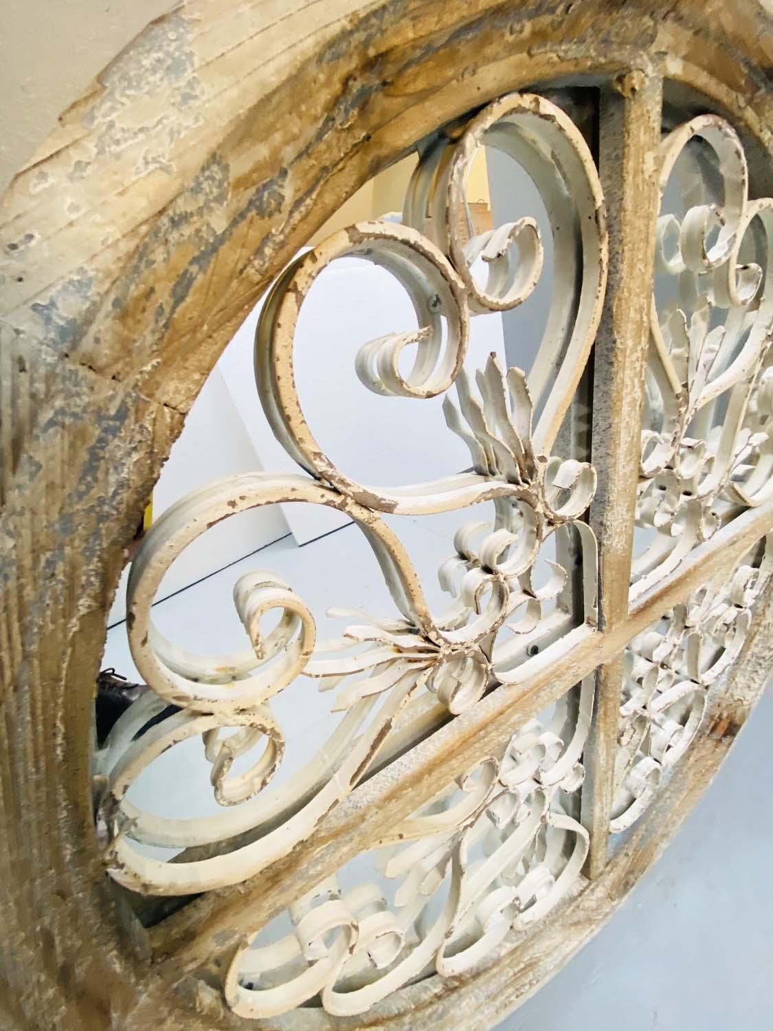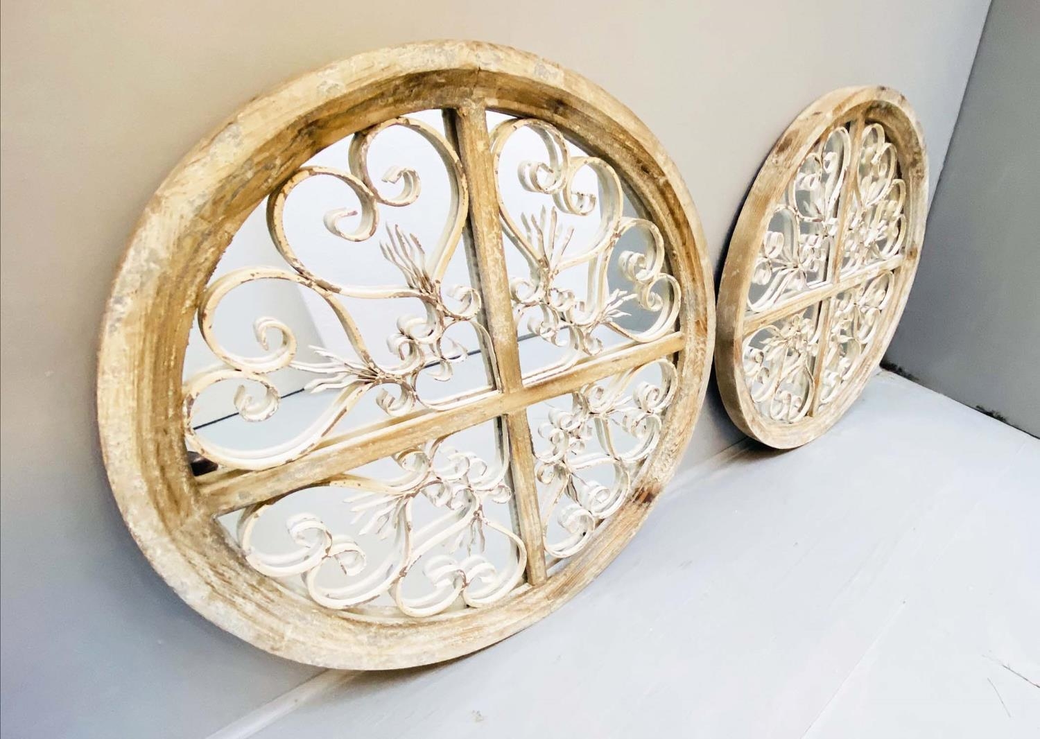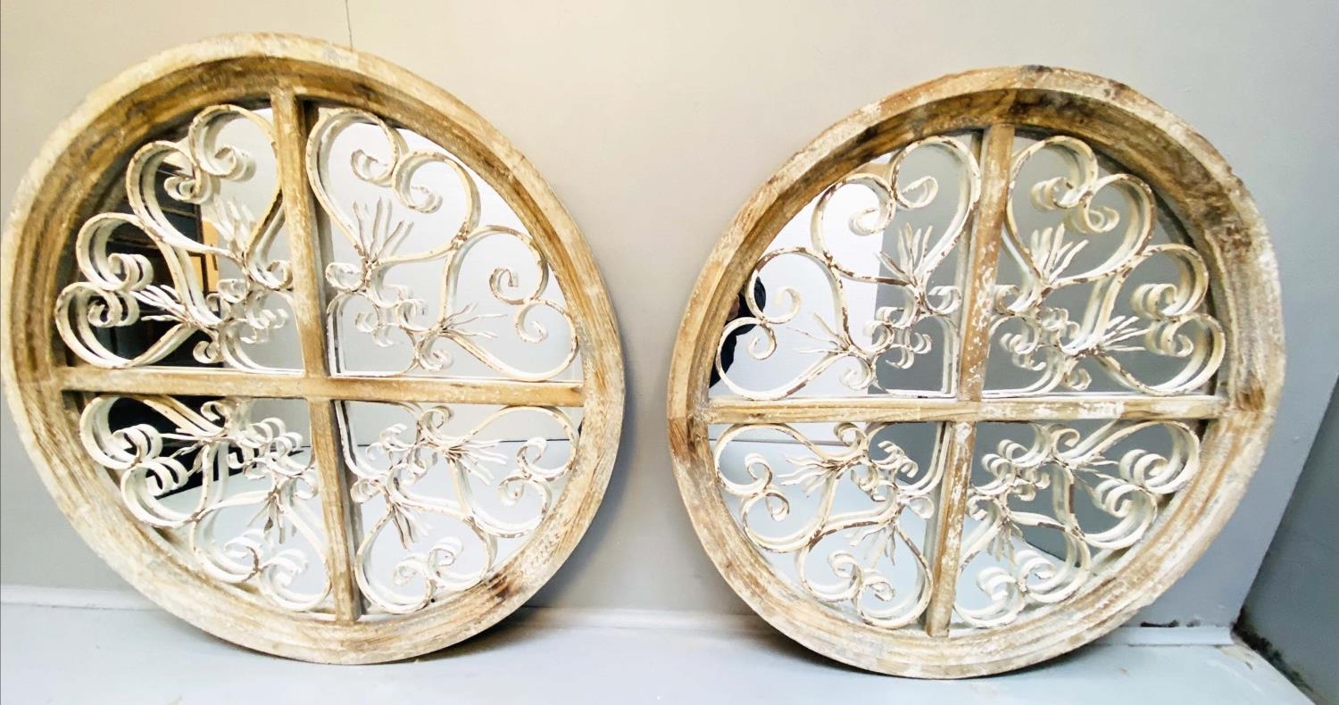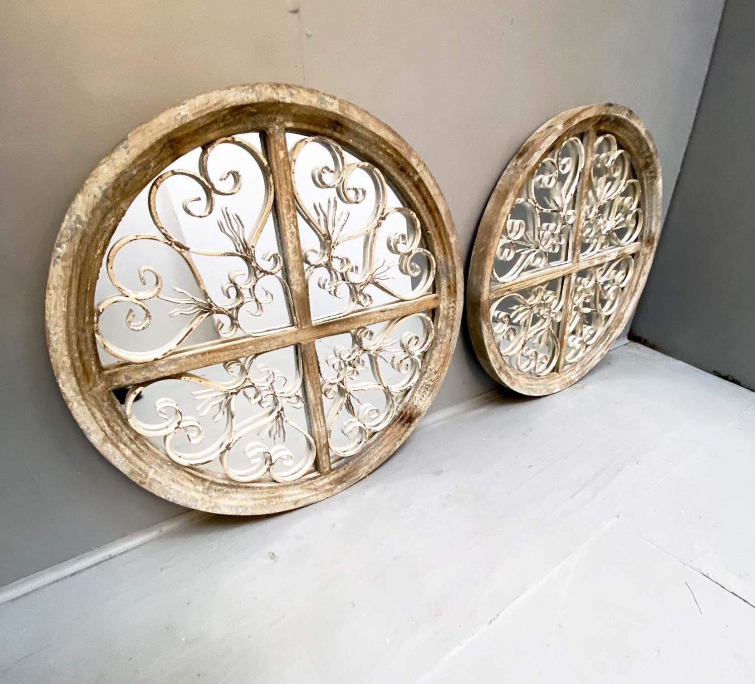 ARCHITECTURAL WALL MIRRORS, a pair, circular, distressed painted frames, 72cm diam. (2)