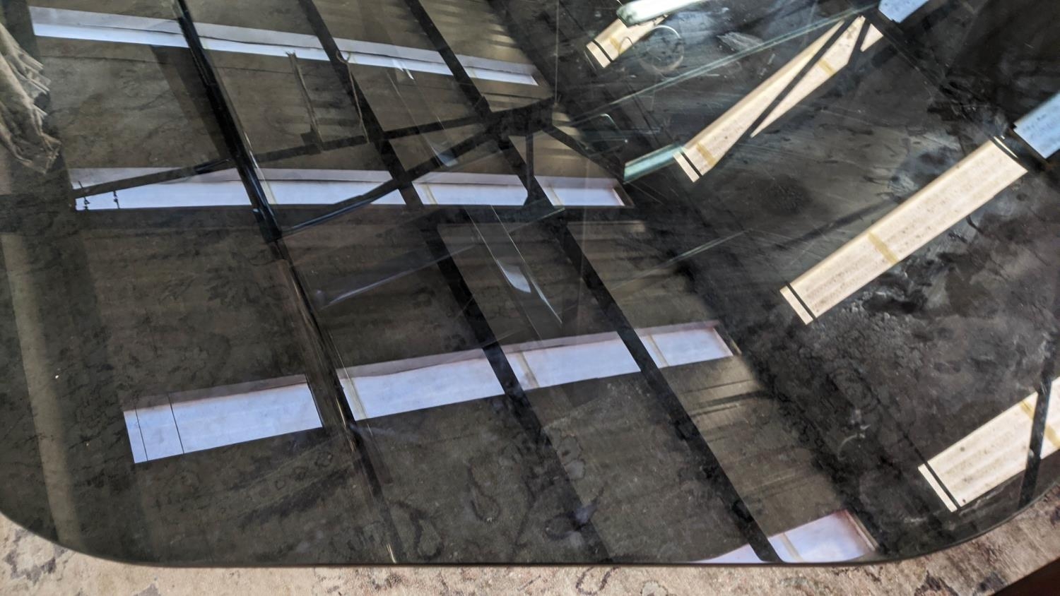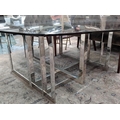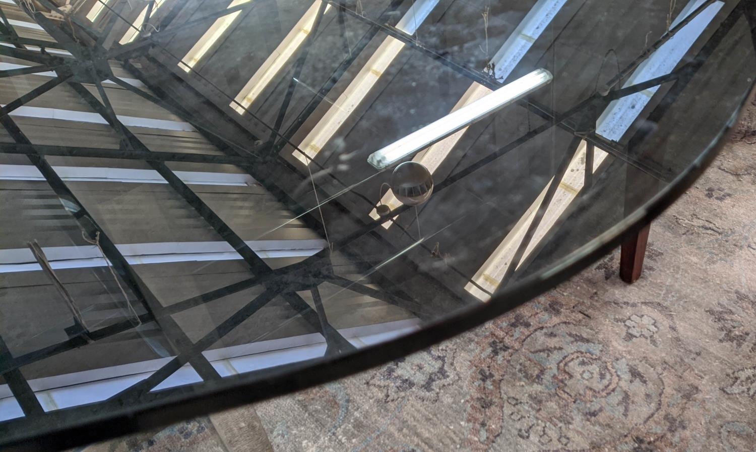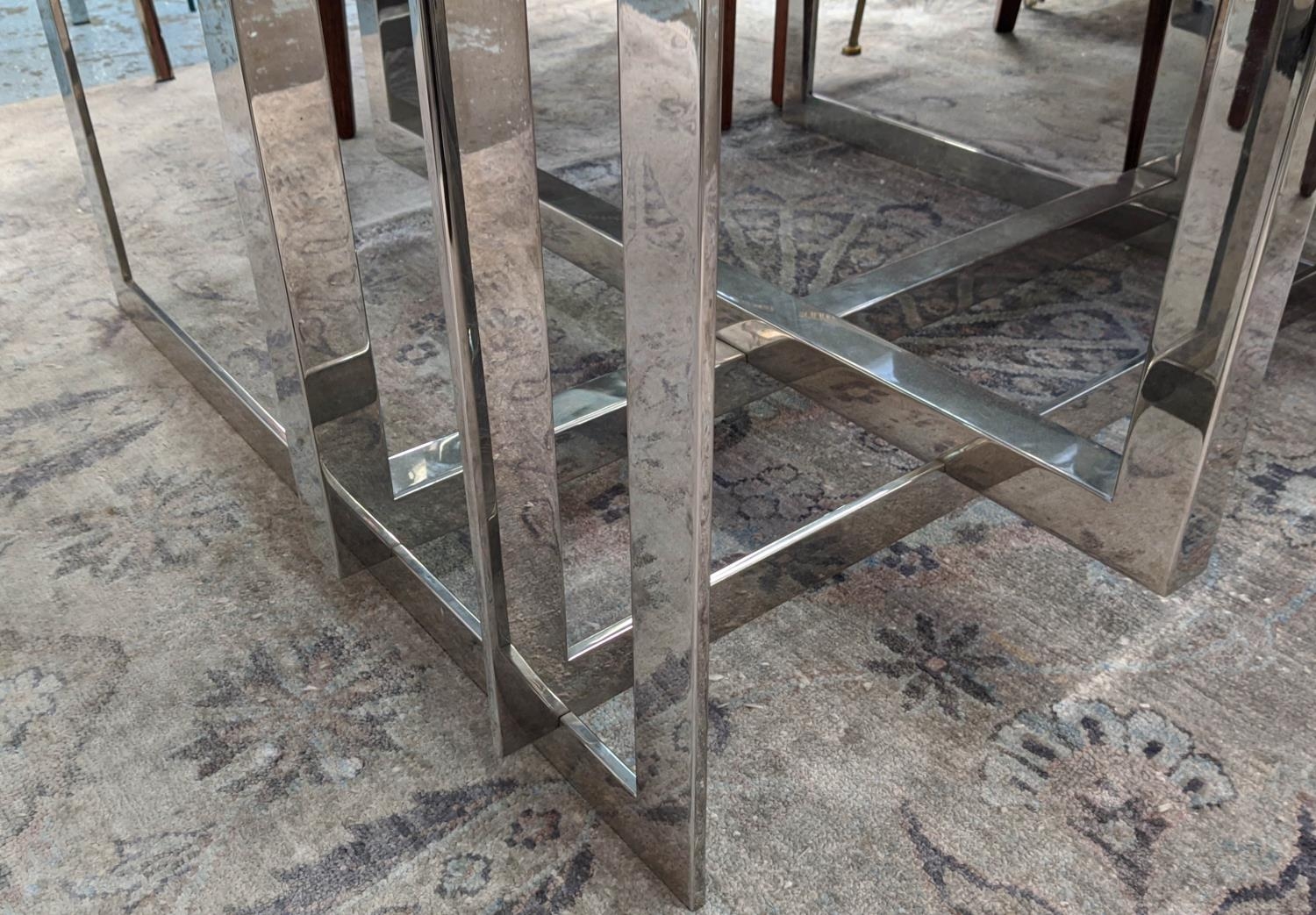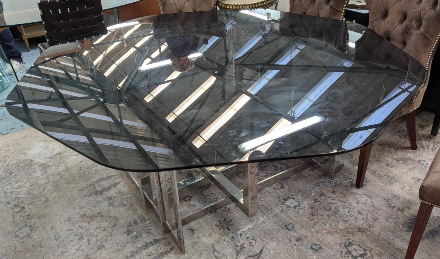DINING TABLE, 184cm diam x 72cm H, contemporary, polished metal base, smoked glass top.