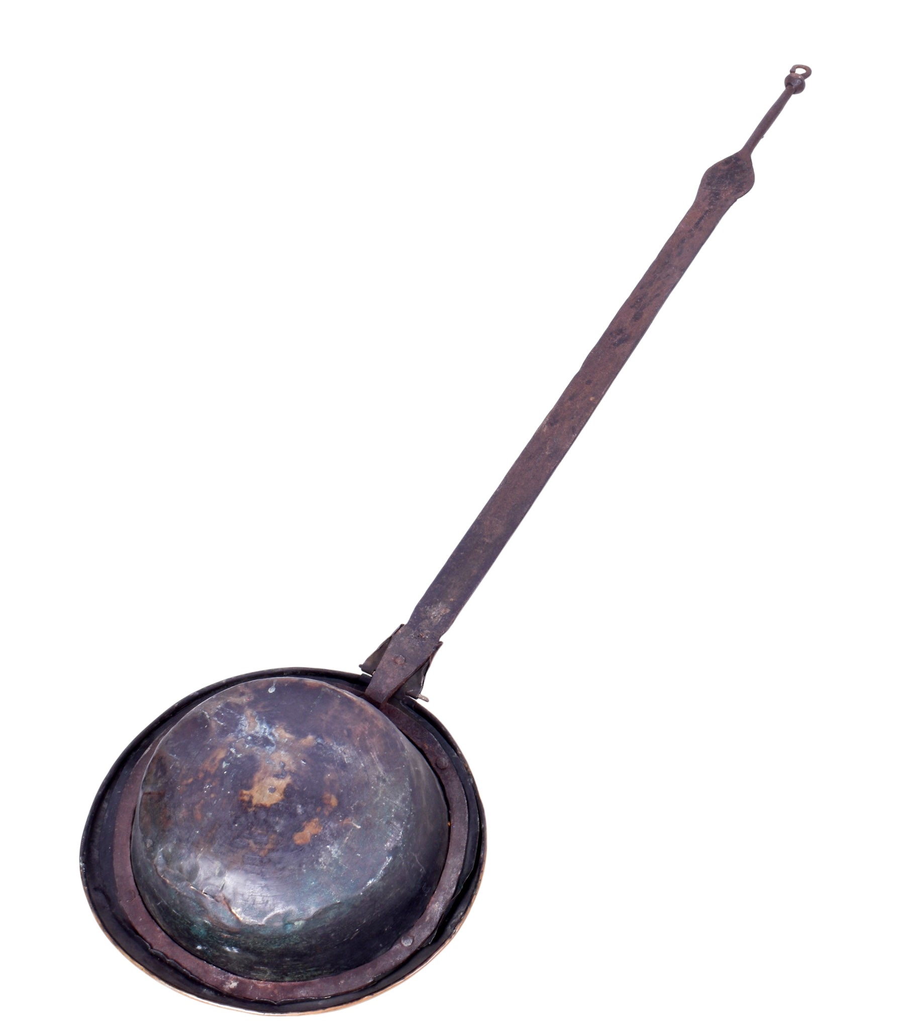 A vintage bed warmer. Having a metal handle and brass cover with impressed decoration, L97.5cm.