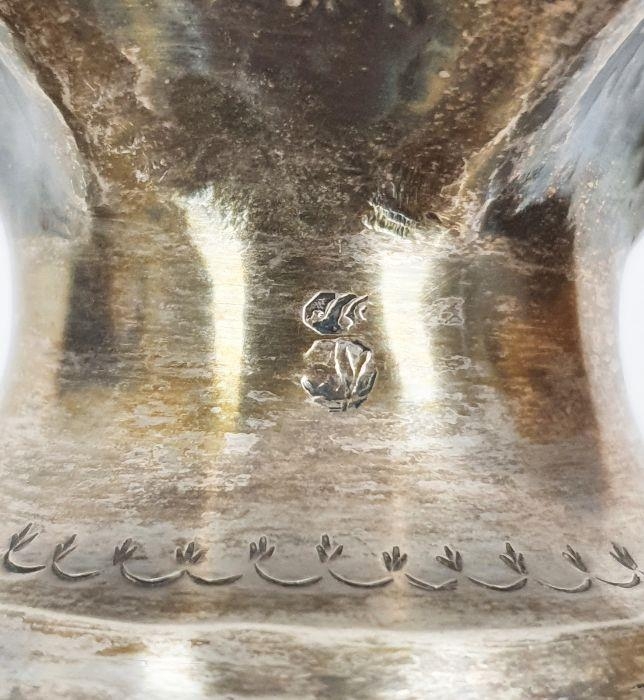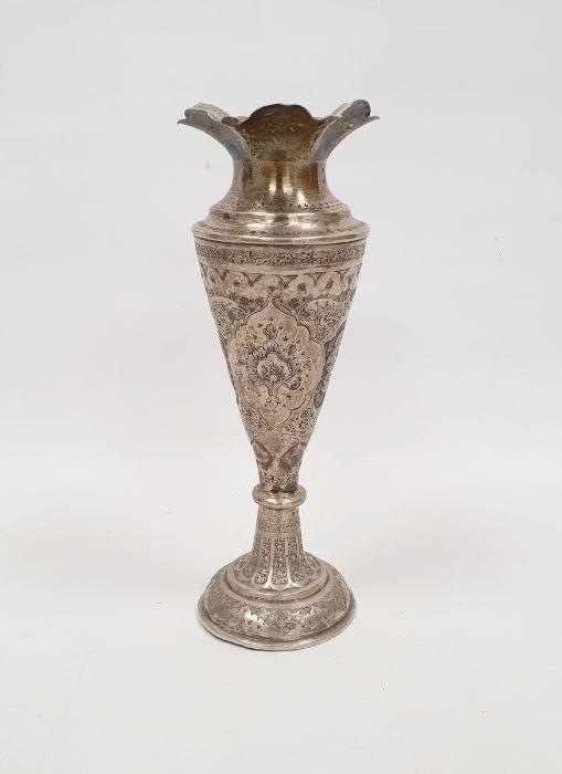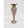 Foreign silver-coloured metal tapering vase on a circular base, repousse floral decorated, indistinctly marked to rim, 23.5cm high, 11ozt approx.