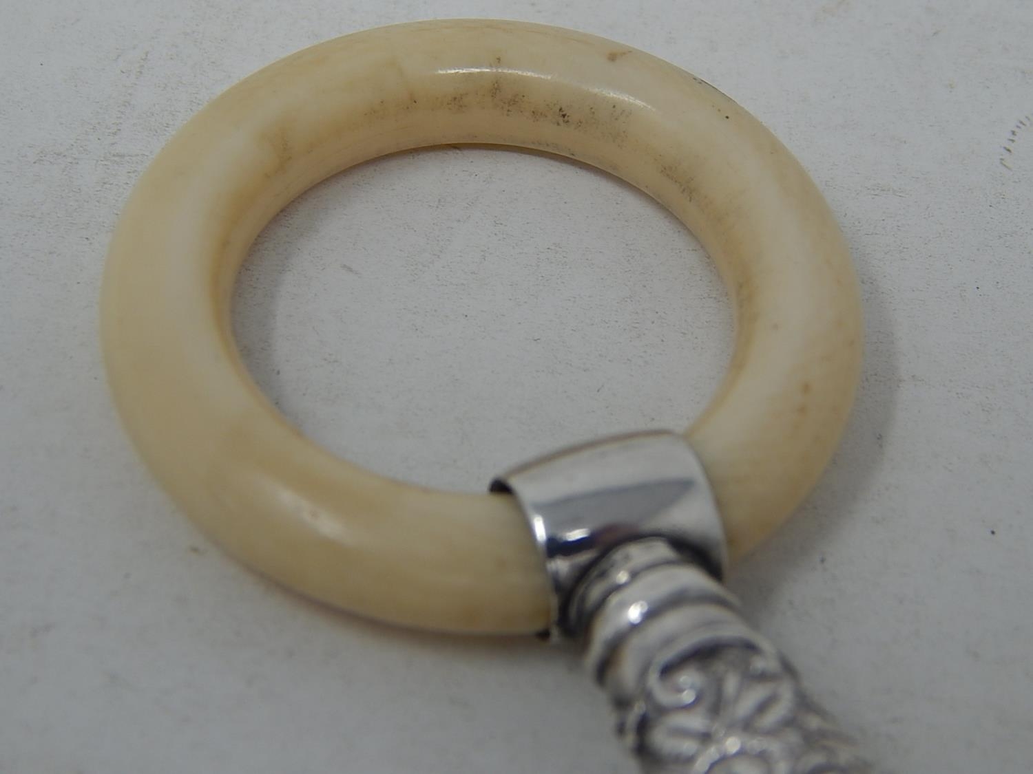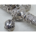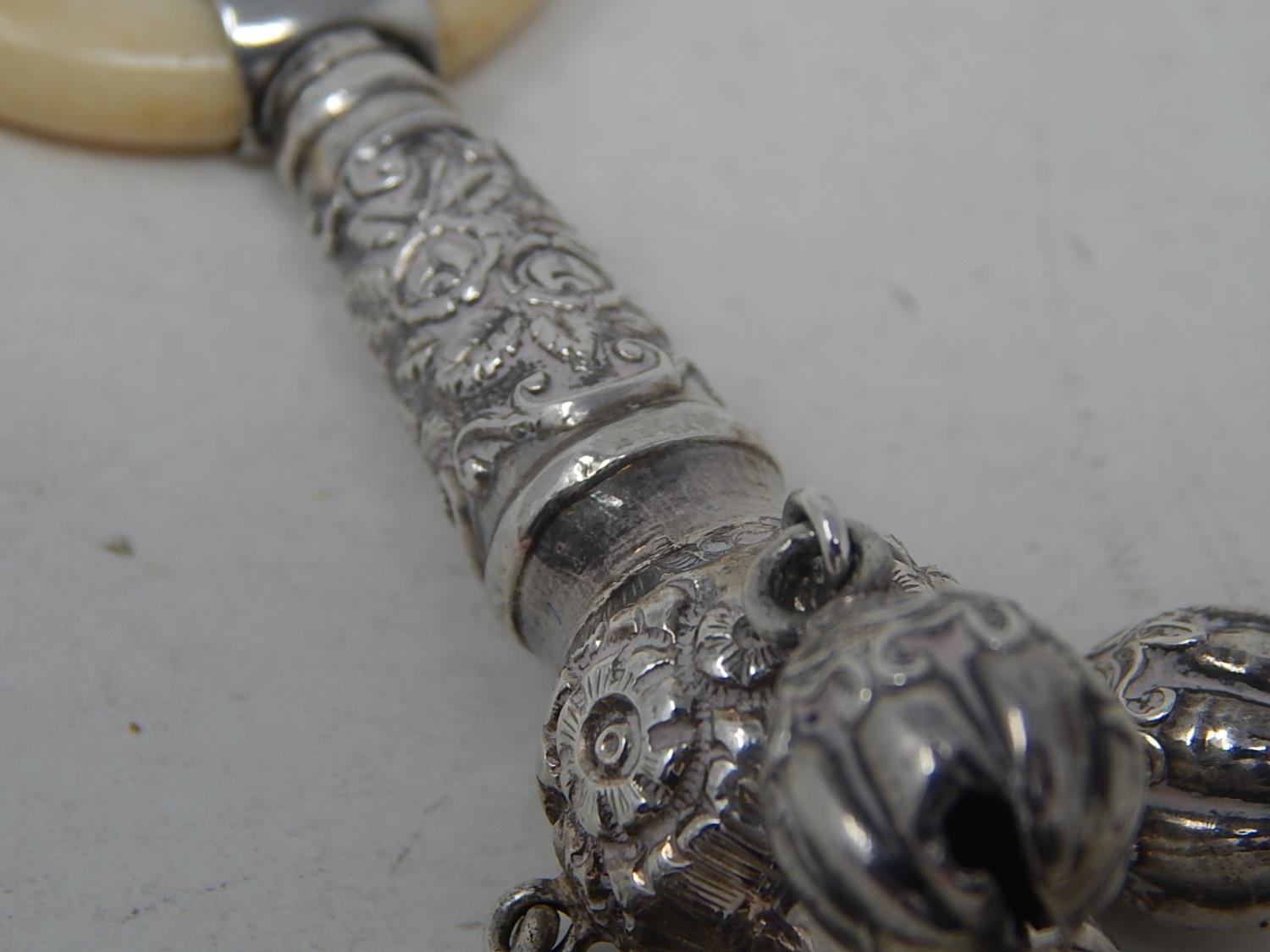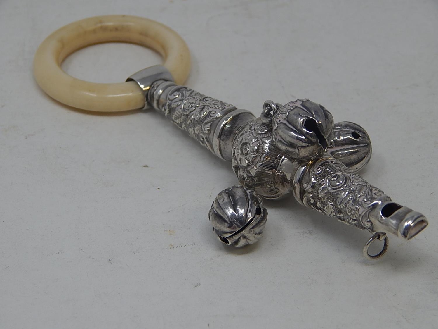 Victorian Tests Silver Combined Rattle with All Three attached Bells & Whistle with Ivory Teether: Dates c.1890