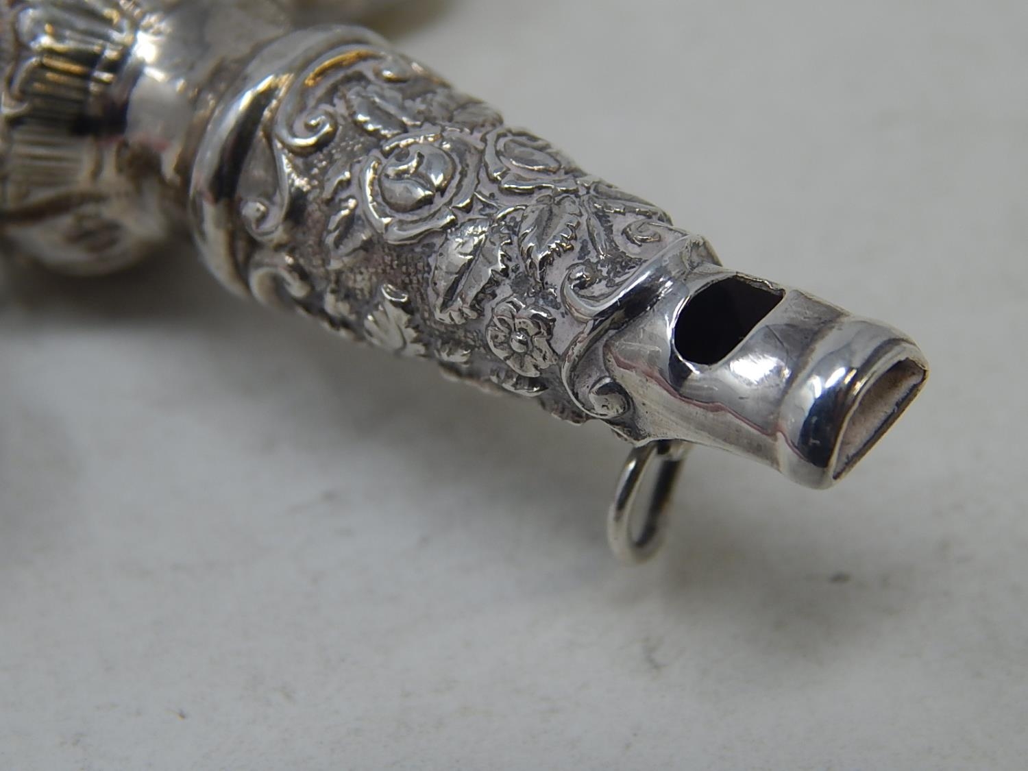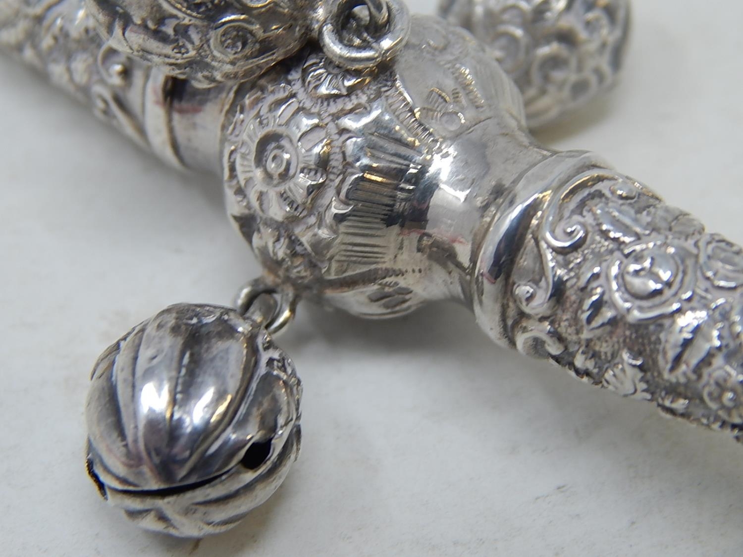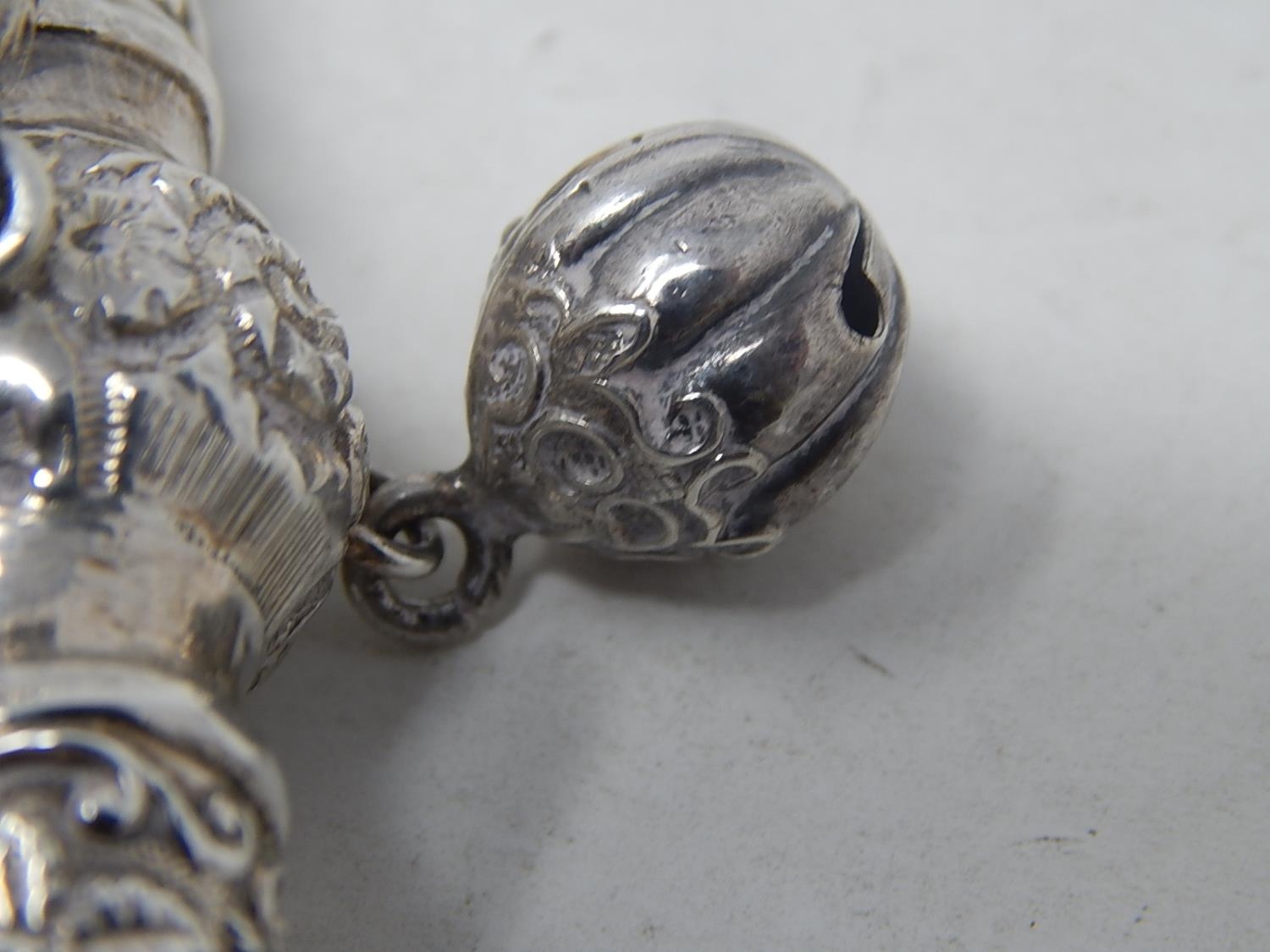 Victorian Tests Silver Combined Rattle with All Three attached Bells & Whistle with Ivory Teether: Dates c.1890
