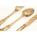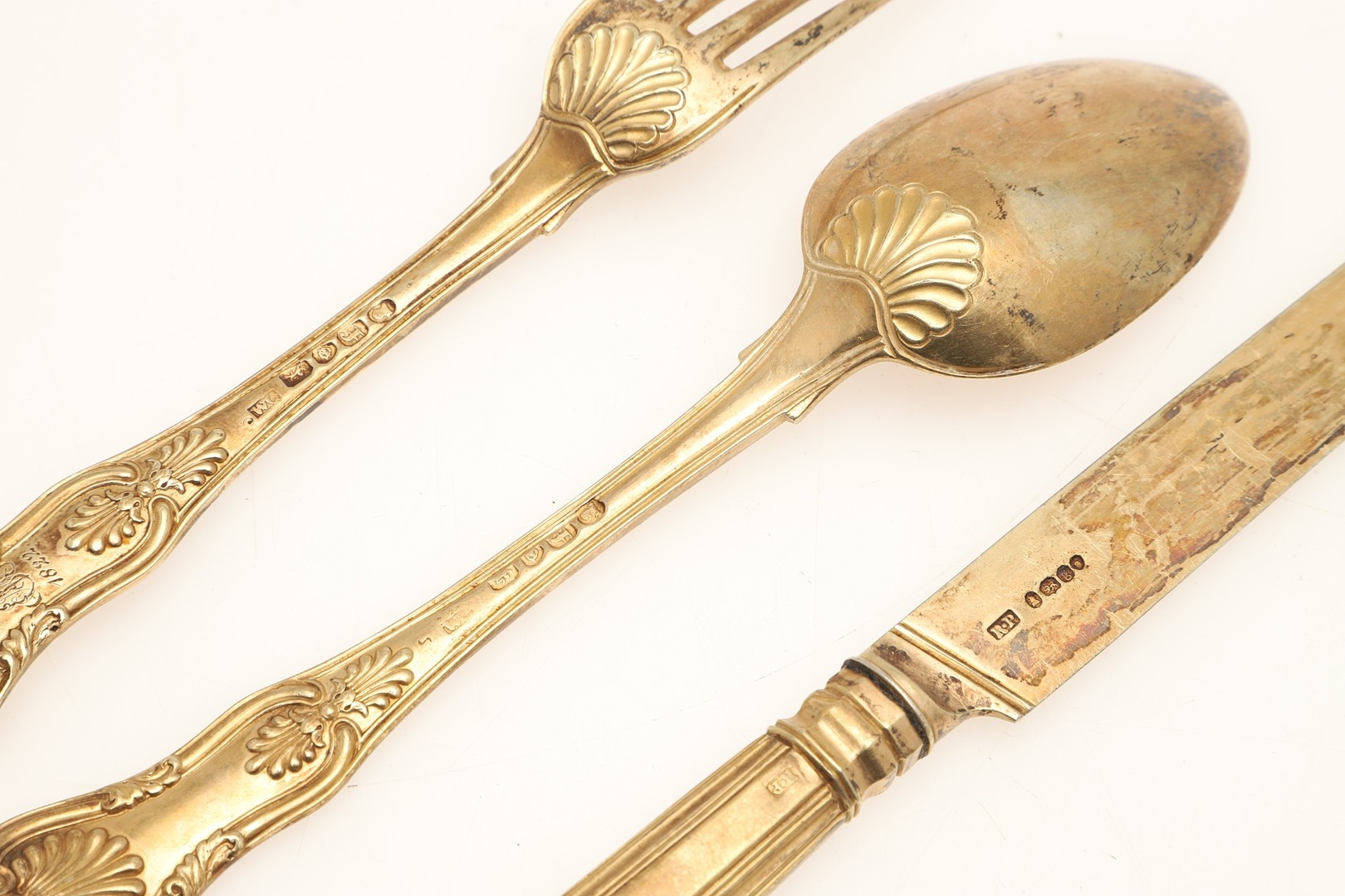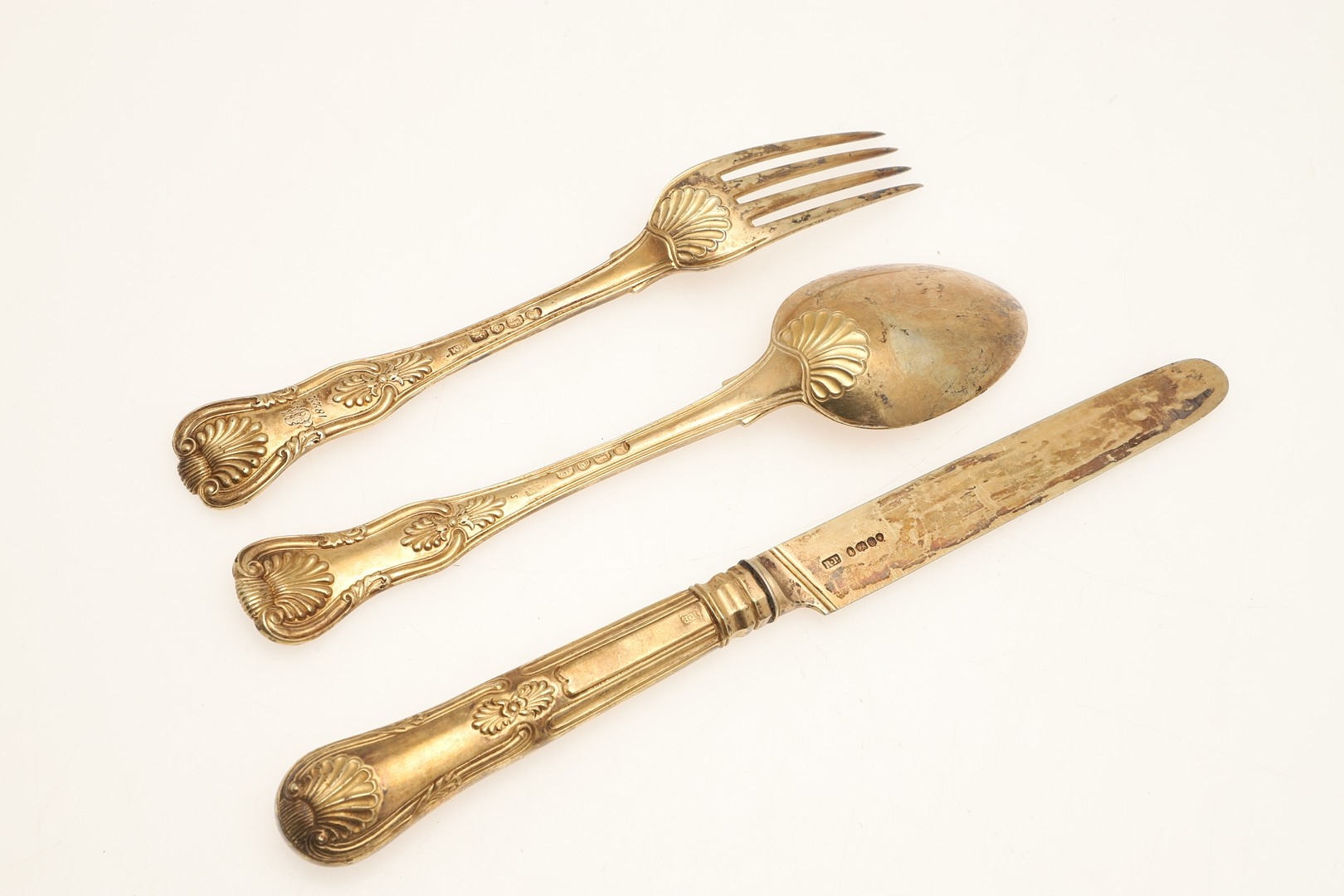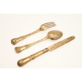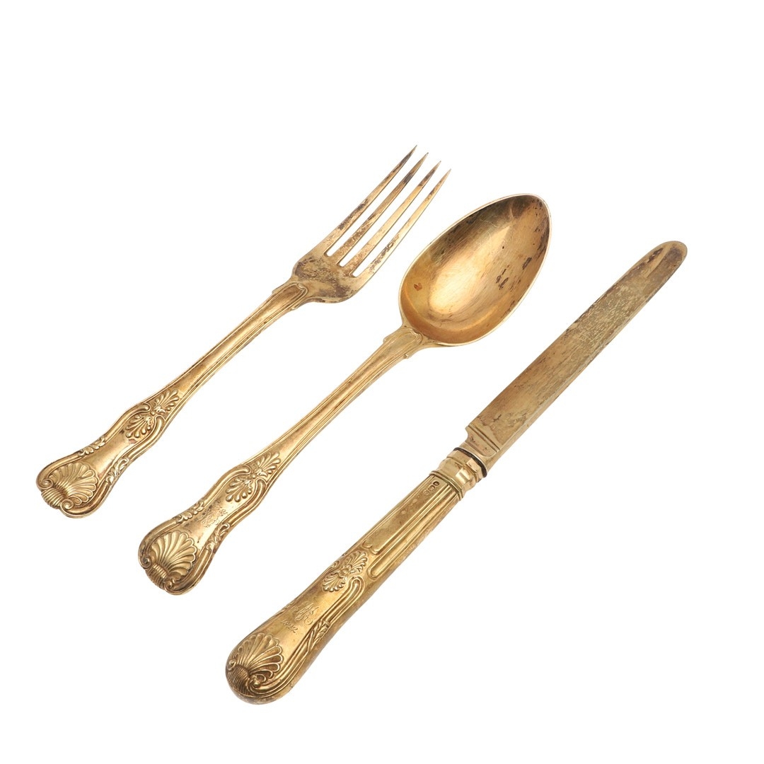 A GEORGE IV SILVER GILT KINGS PATTERN KNIFE, FORK AND SPOON SET. The fork and spoon hallmarked WC, London, 1821, together with a filled silver handled and silver bladed knife (length 22cm). All with engraved initials and dated 1822. Total lot weight 6.2ozt. (3).