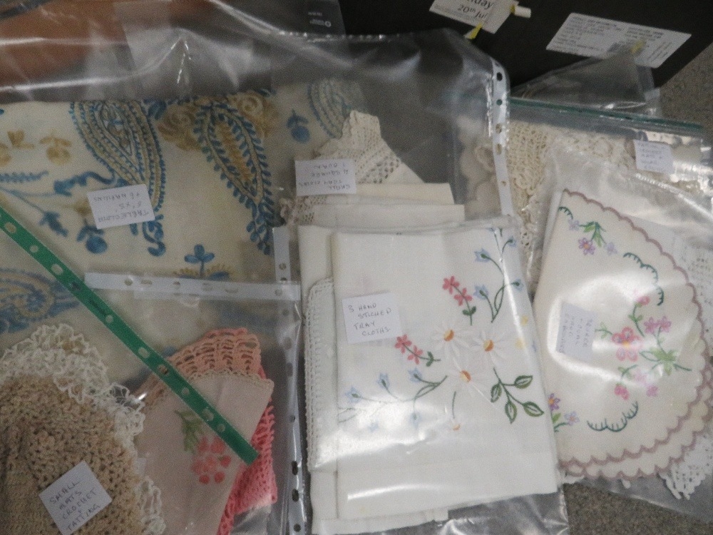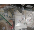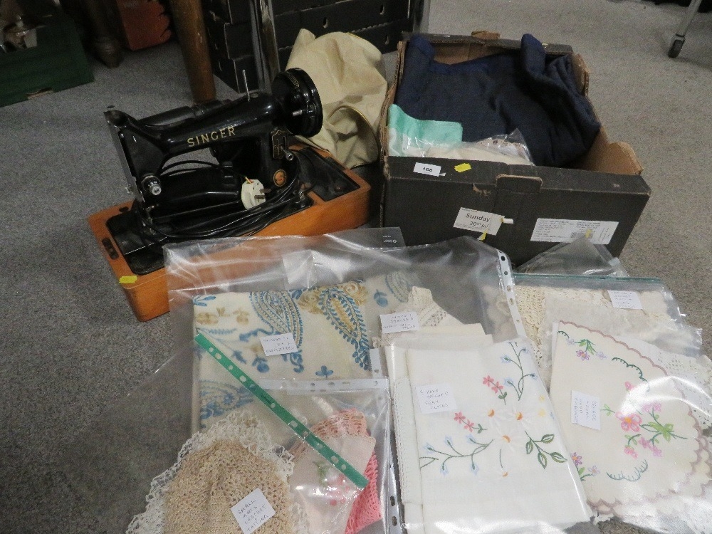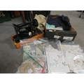 A vintage electric Singer sewing machine together with a tray of linen and lace
