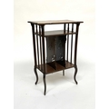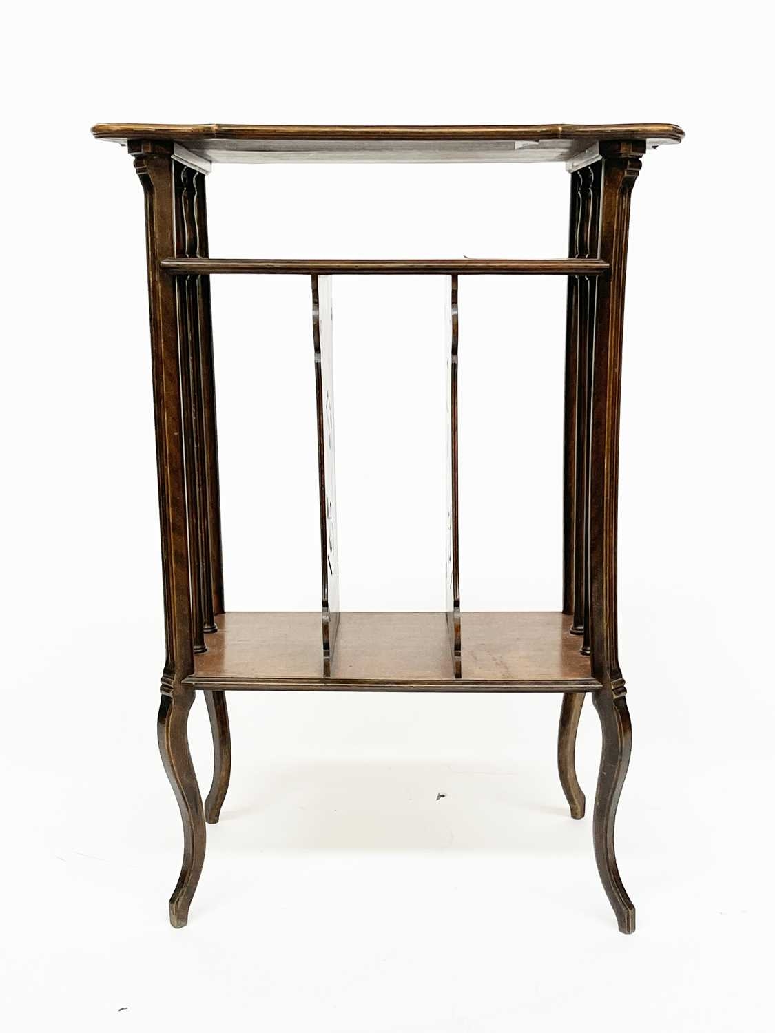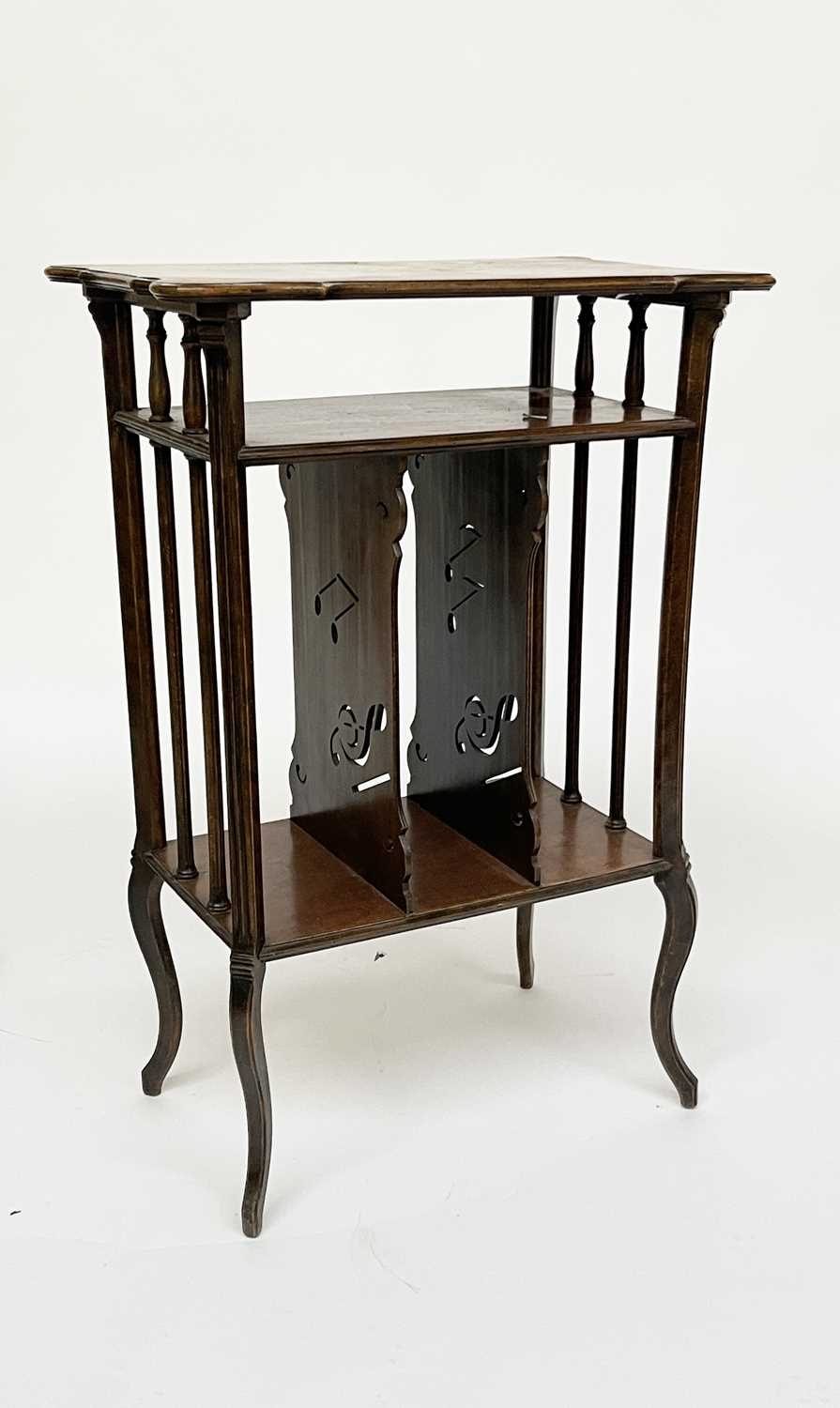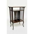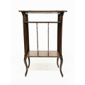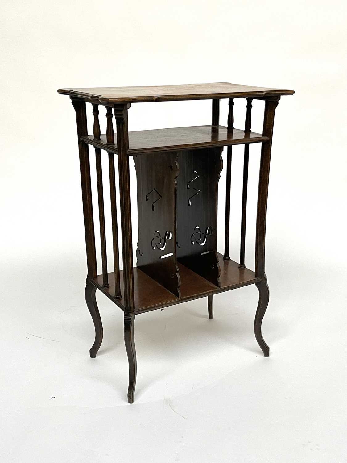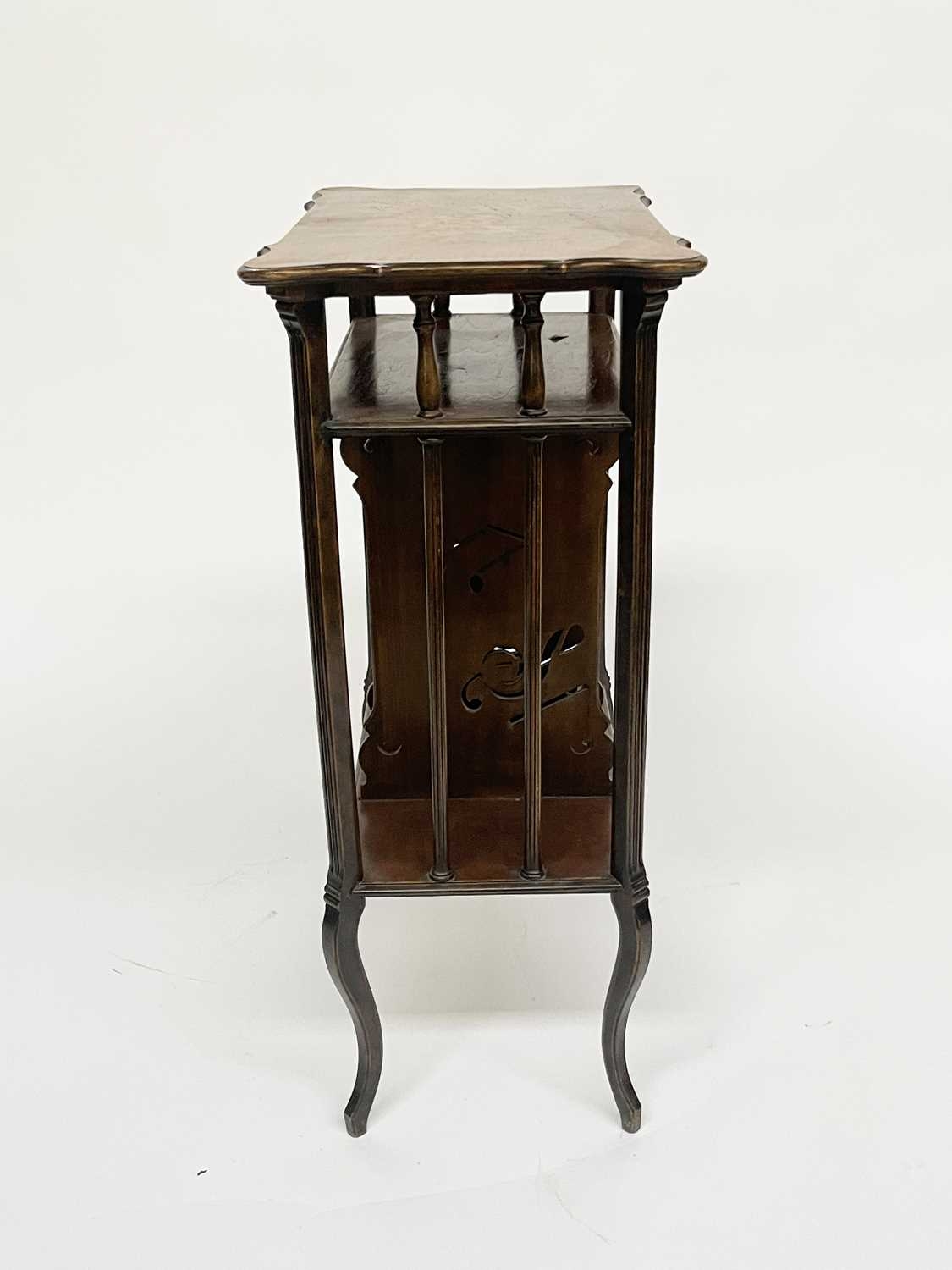 Emile Galle, an Art Nouveau specimen marquetry inlaid music rack, inlaid with irises to the ogee table top, on fluted dowel supports and cabriole legs, fret carved dividers with musical notes, 65cm wide, 95cm high, 40cm deep