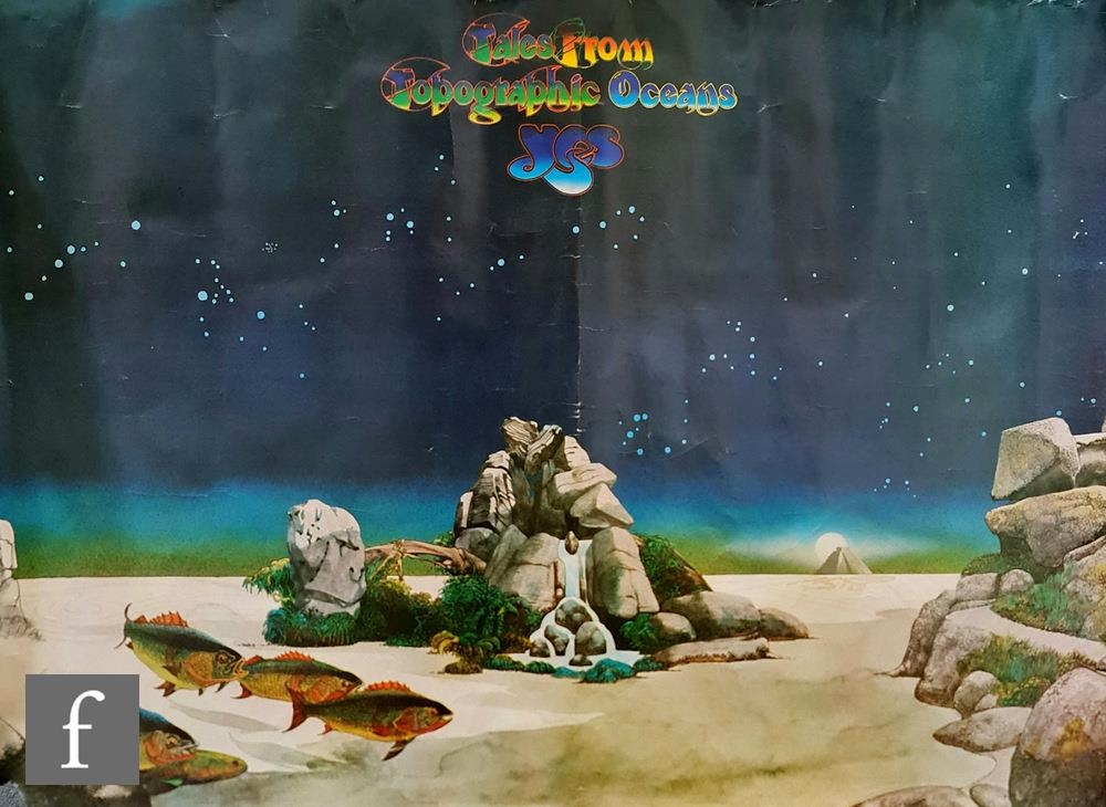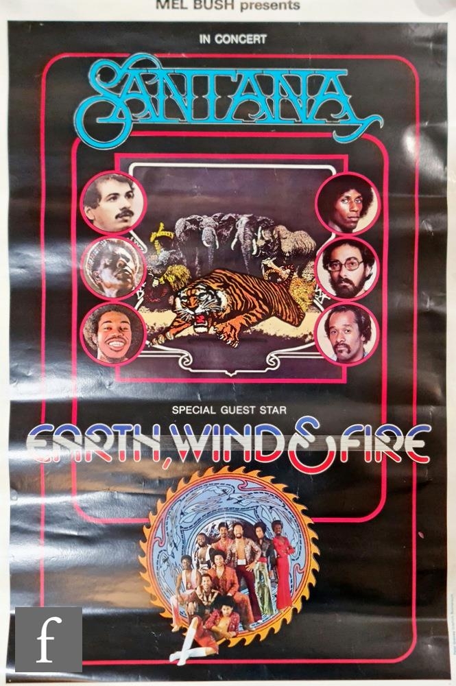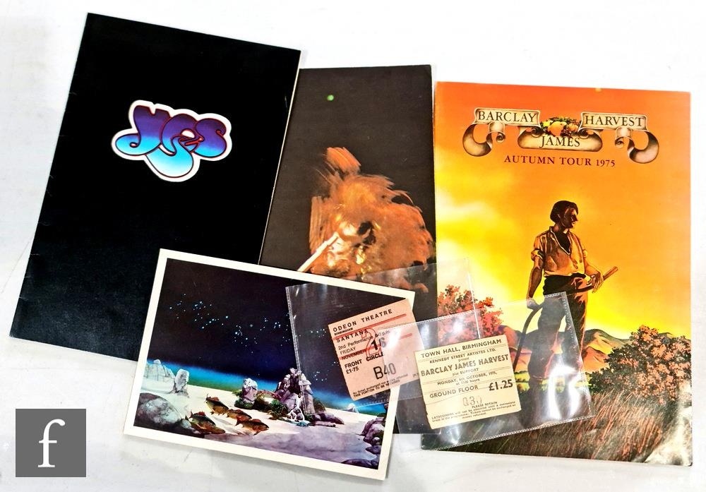A collection of 1970s music memorabilia, to include an original 1970s Santana and Earth, Wind & Fire concert poster, Peter Grainey Graphics, Bournemouth, 76cm x 50.5cm, together with an original Yes 1973 Tales from Topographic Oceans poster, 60cm x 83cm, and postcard, 15cm x 21cm, a Yes 1973, tour programme, a 1975 Barclay James Harvest, Autumn Tour programme and ticket stub, a 1973 Santana Birmingham Odeon 2nd November ticket stub, and a Jethro Tull ‘Thick as a Brick’ 1972 programme. (8)
