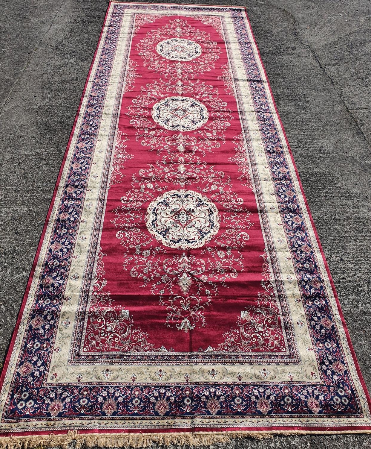 A beautiful rich red ground Persian Carpet with a cash and carpet unique pattern and unique size. 680cms x 280cms.