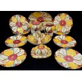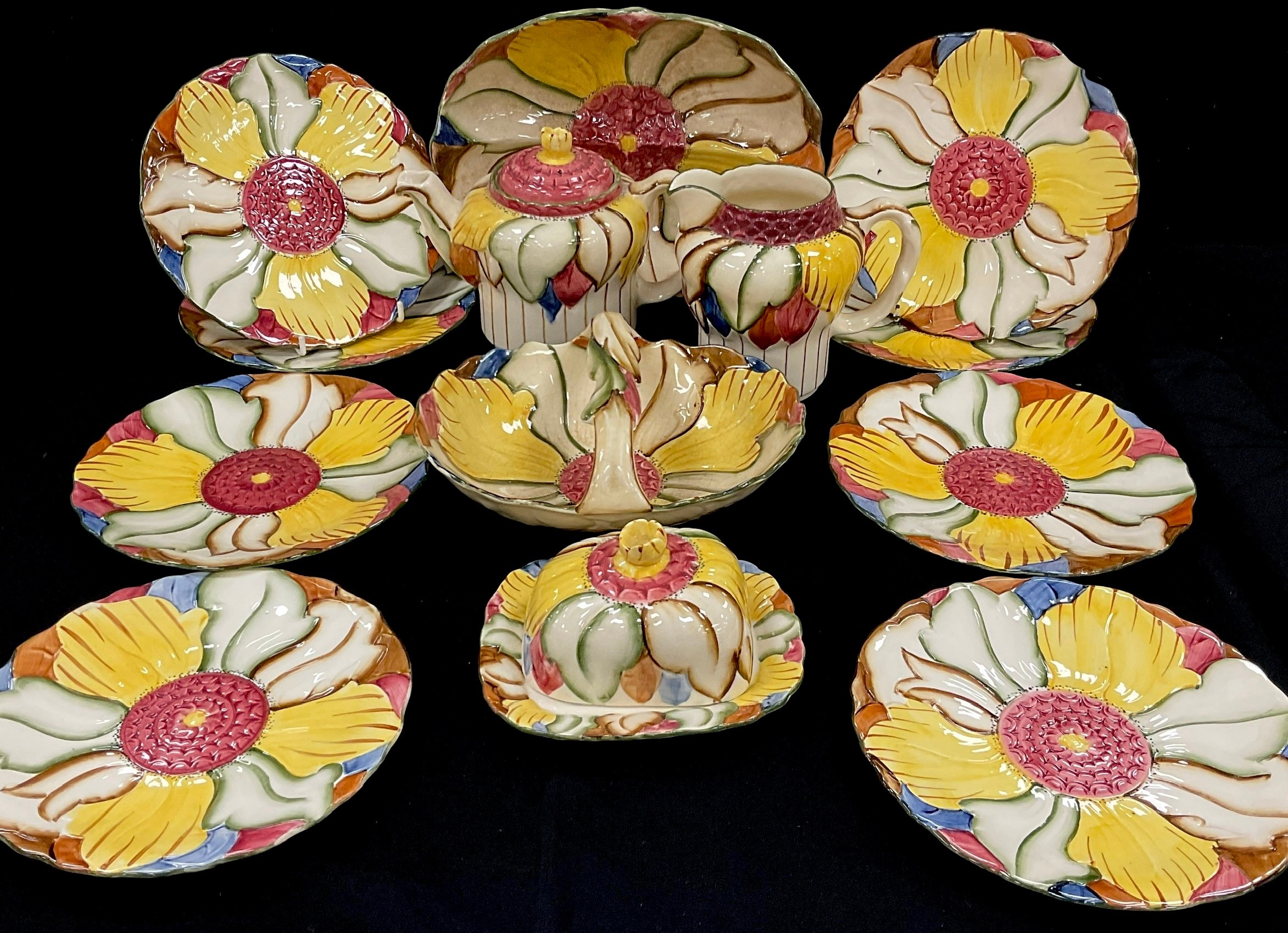 Burslem ware including a flower shaped tea pot, basket, jug, butter dish, serving dish, eight plates.