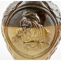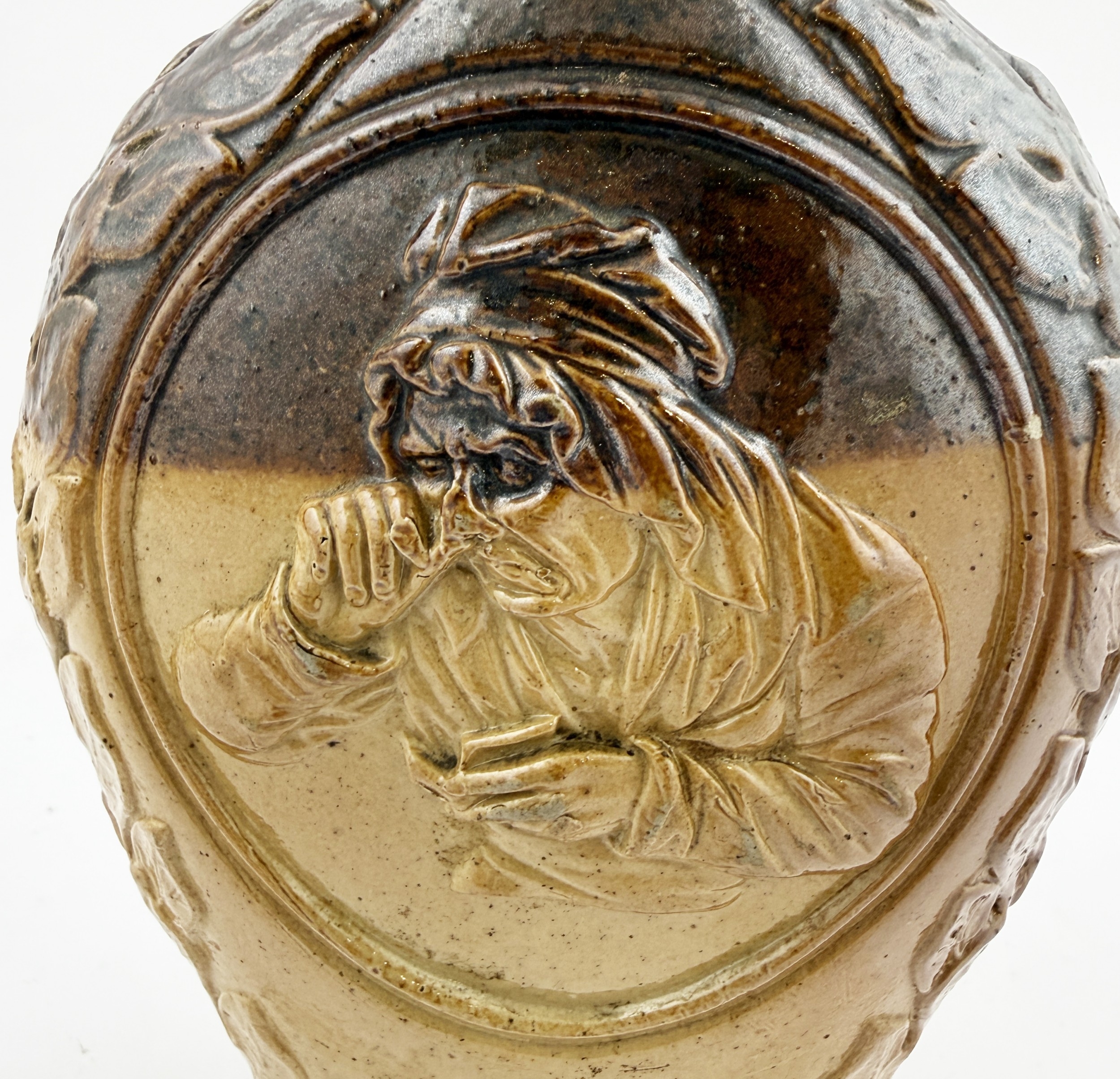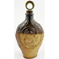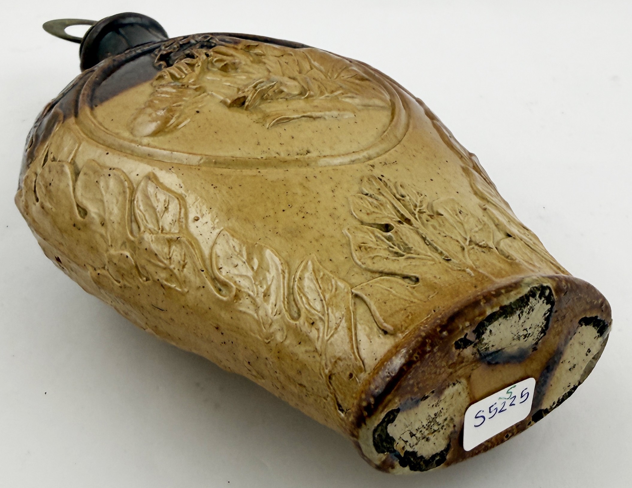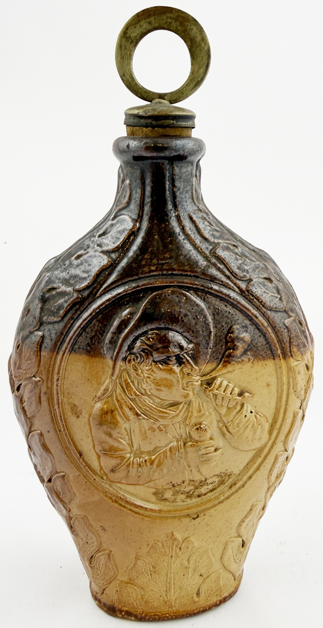 SNUFF TAKER/ SMOKER REFORM FLASK. RF p40. 6.75 ins tall exc. stopper. Well coloured flask, oak leaf border, no p.m. Original metal topped cork. Minor high point wear & tiny body nick to snuff taker side.