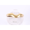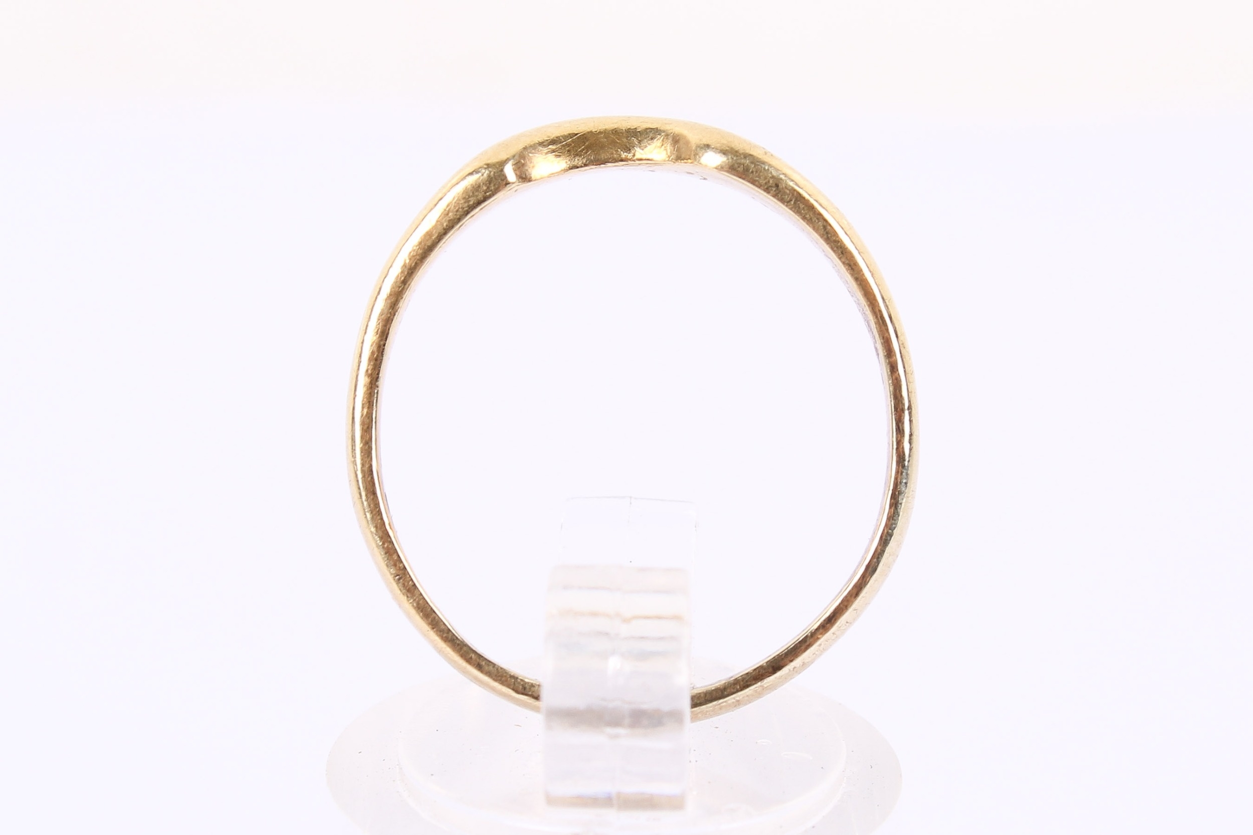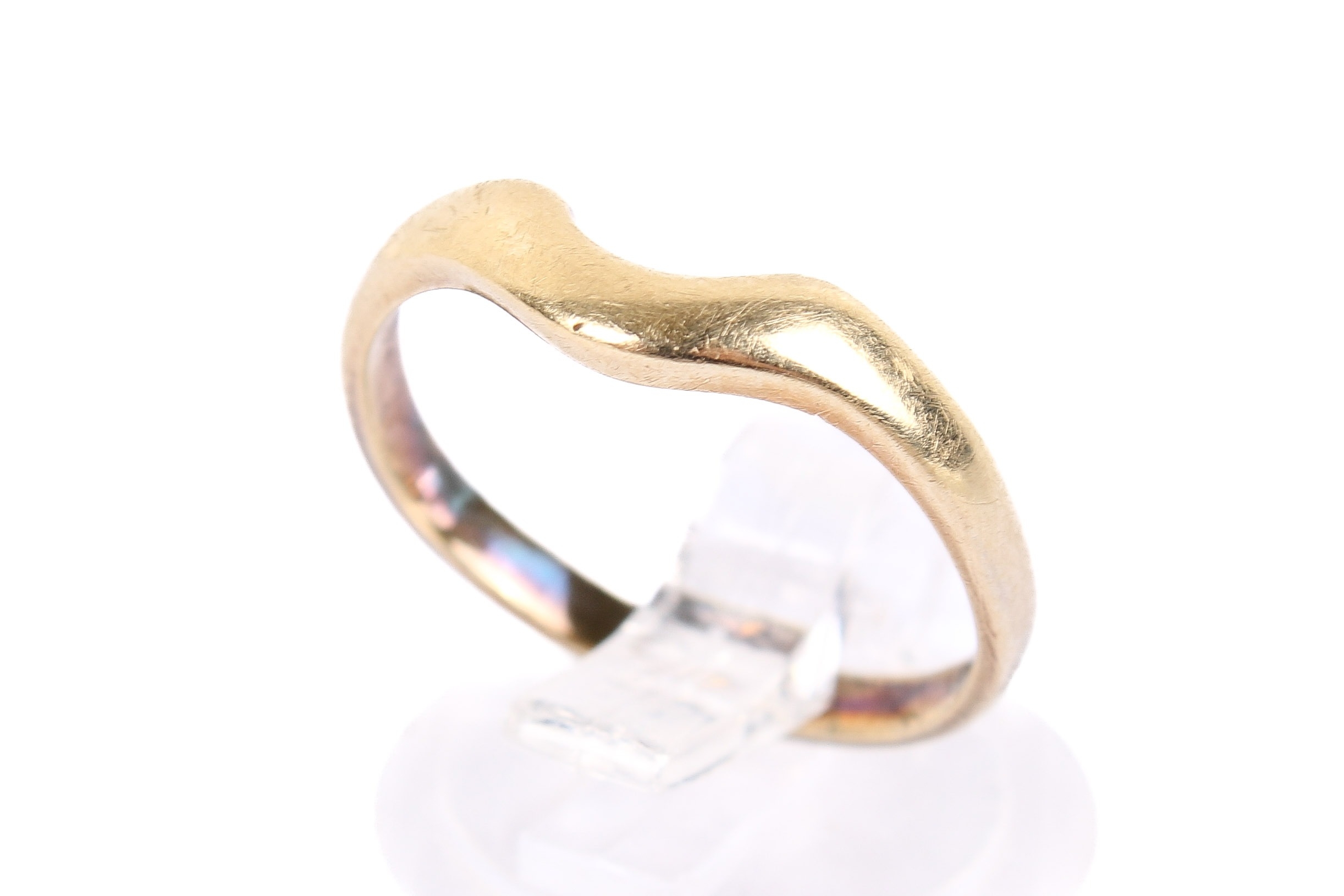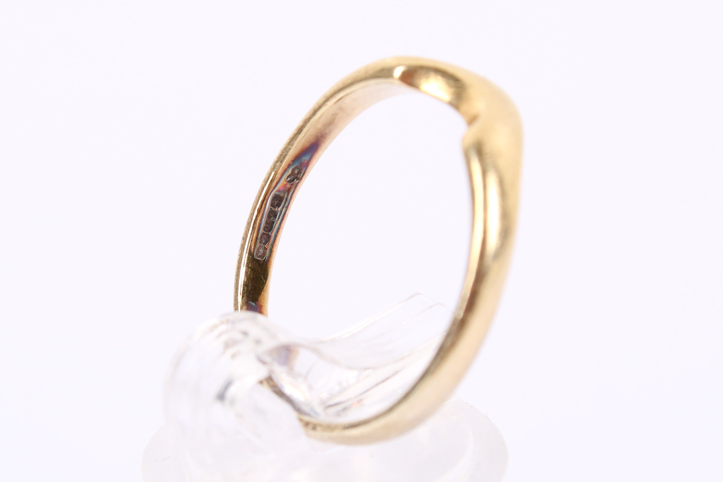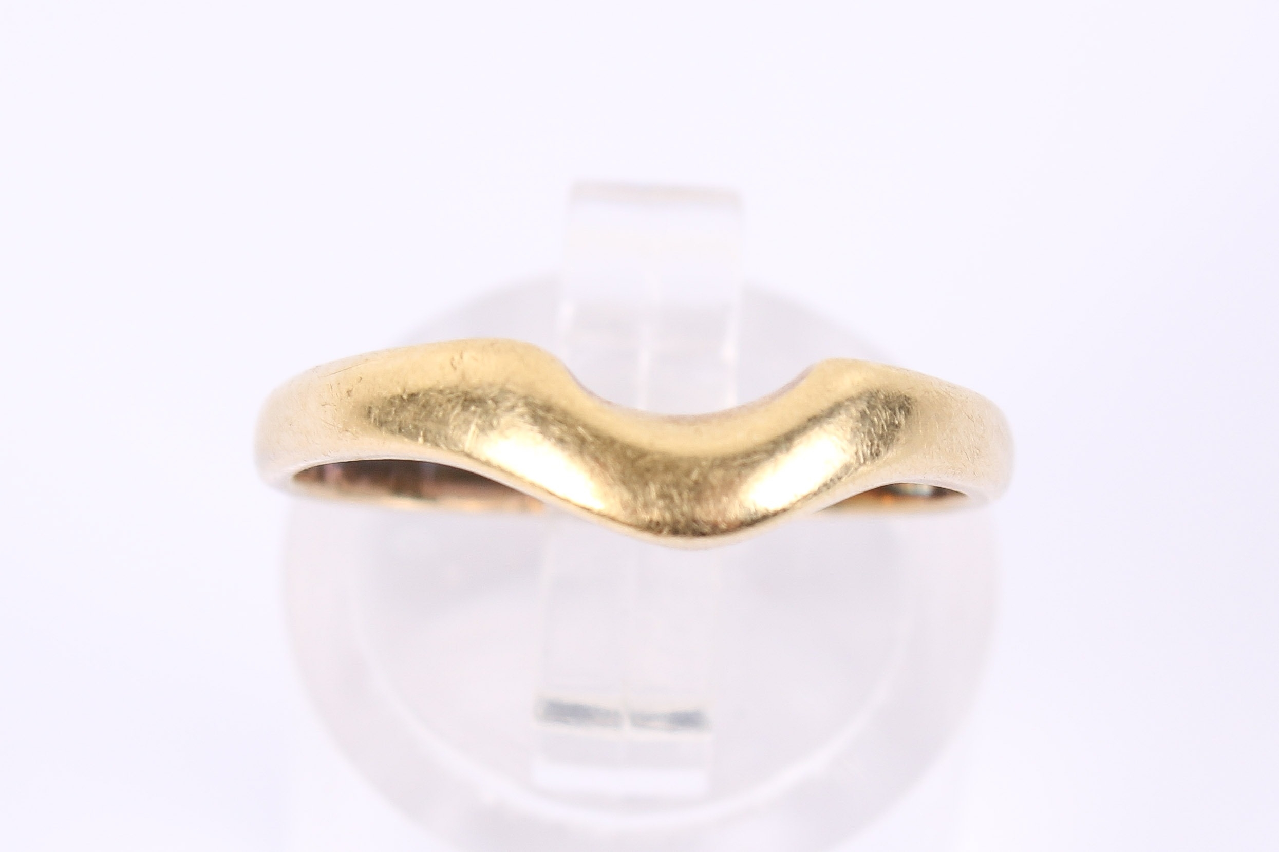 An 18ct gold wedding band. Shaped to fit alongside a stone engagement ring, hallmarked 750, size O, weight 2.9g