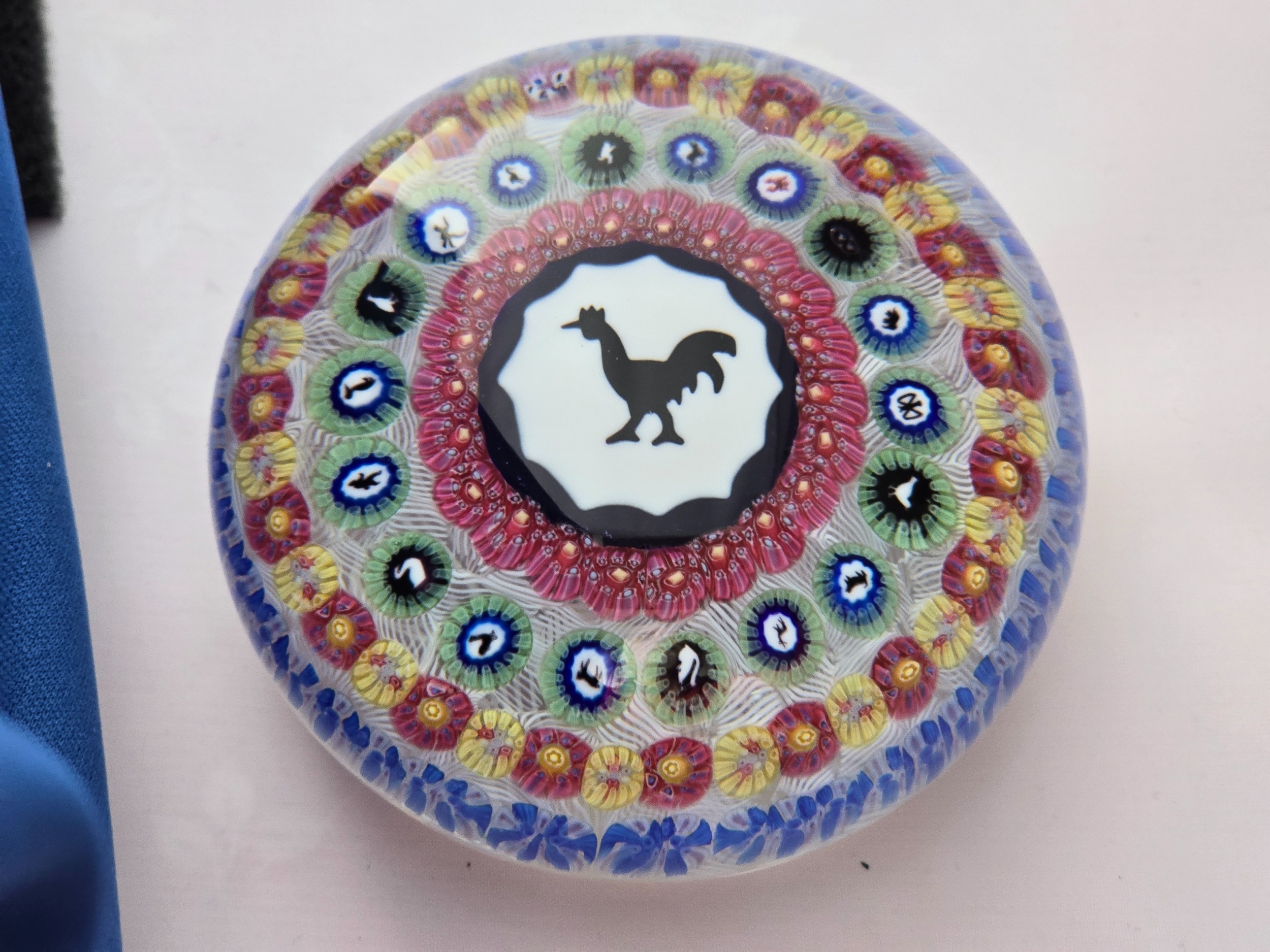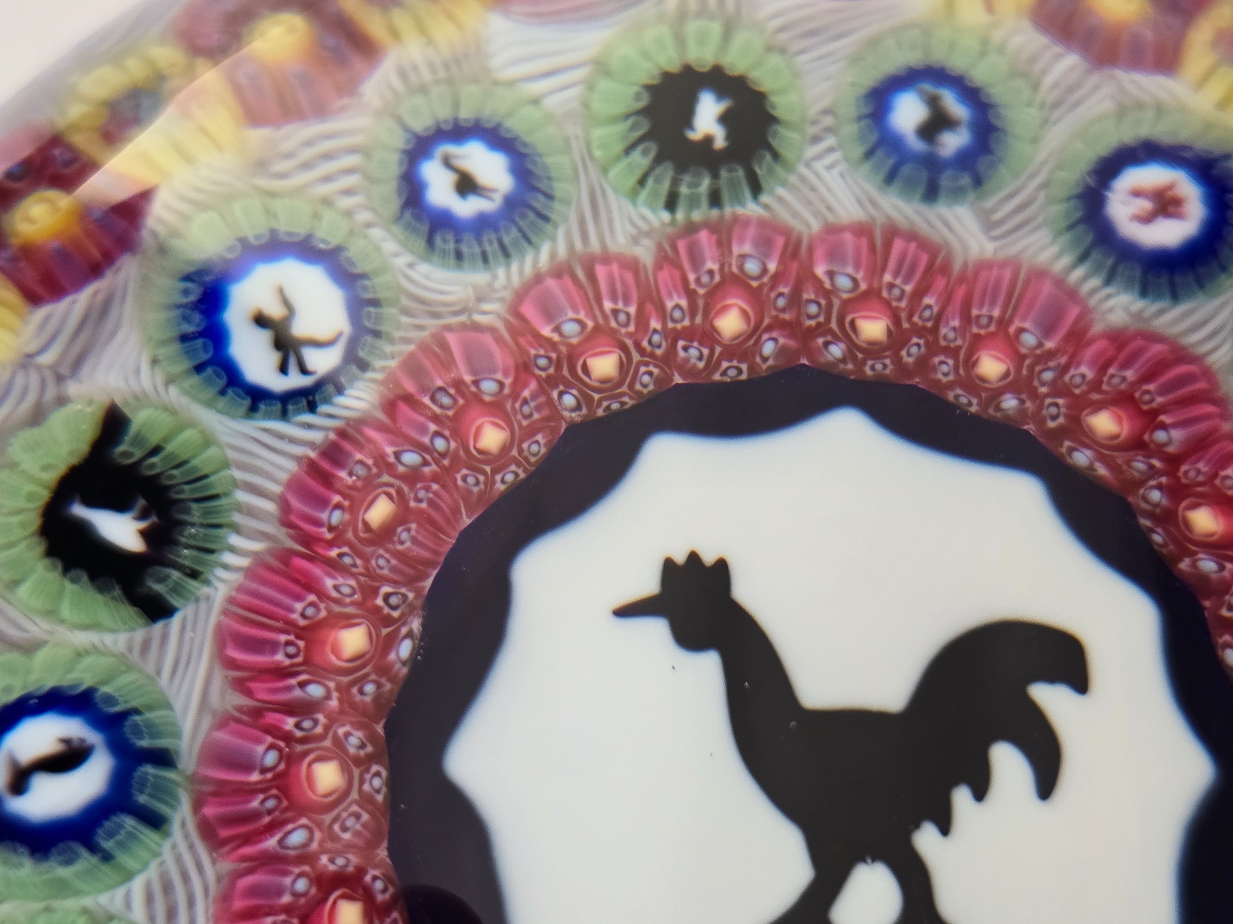 Quality Baccarat paperweight - Rooster/Cockerel centre, plus further ring of 16 gridel canes. Excellent condition. 85mm diam