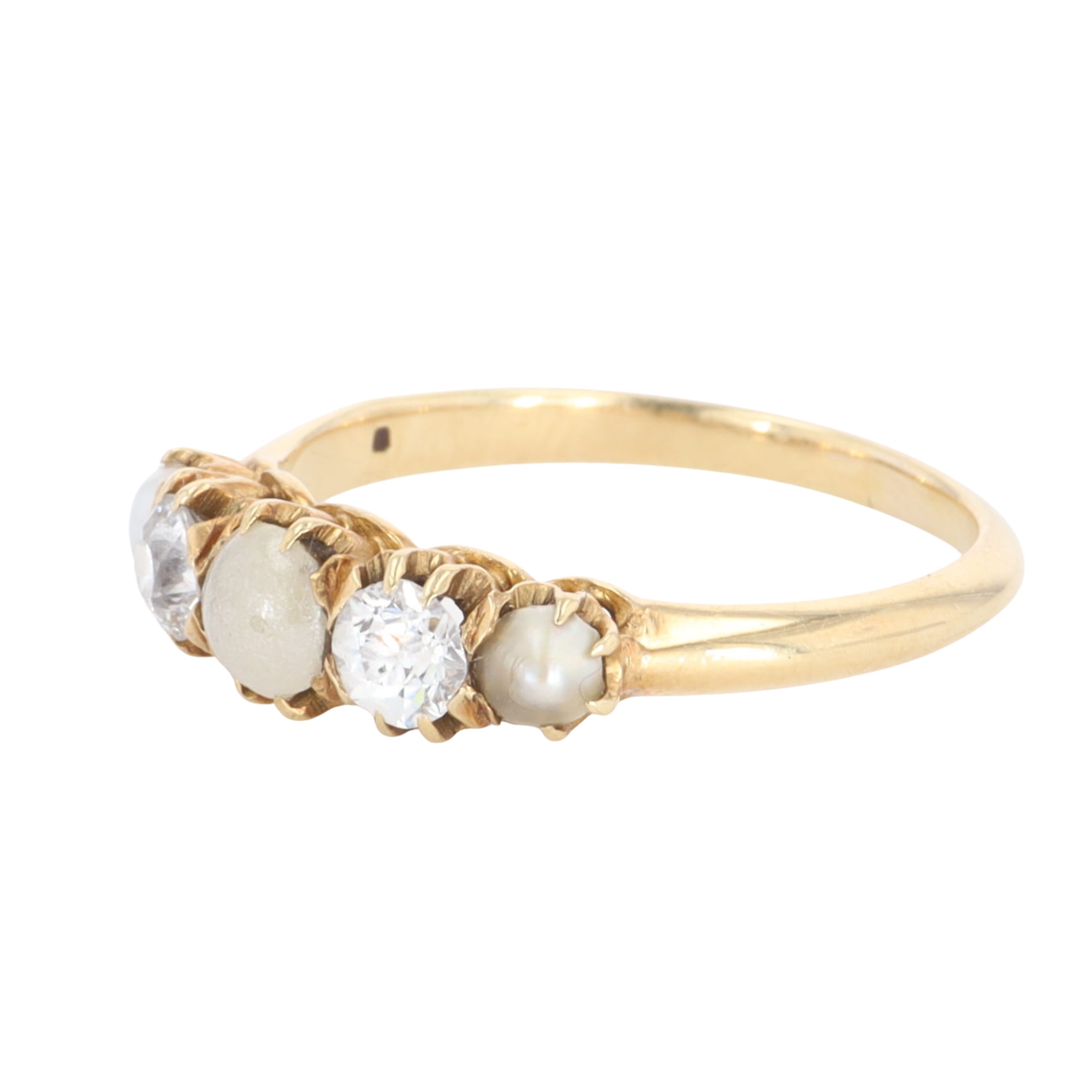 Antique Diamond Split Pearl Five-Stone Gold Ring. This piece has tested as 18ct gold. There is moderate wear and scratches to metal, light to moderate wear and scratches to stones. The central stone has lost its pearl lustre due to age. All stones are secure, with thinning of claws, may benefit from re-tipping. There is thinning of band to reverse. UK ring size M, weighs 2.6g.