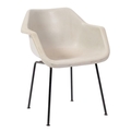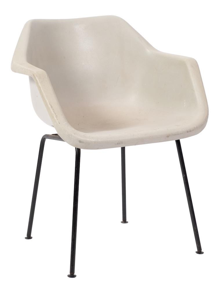 A white plastic tub chair, by Robin Day for Hille, circa 1970s; raised on four chrome plated outswept legs, impressed marks to base; 76cm high, 60cm wide