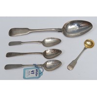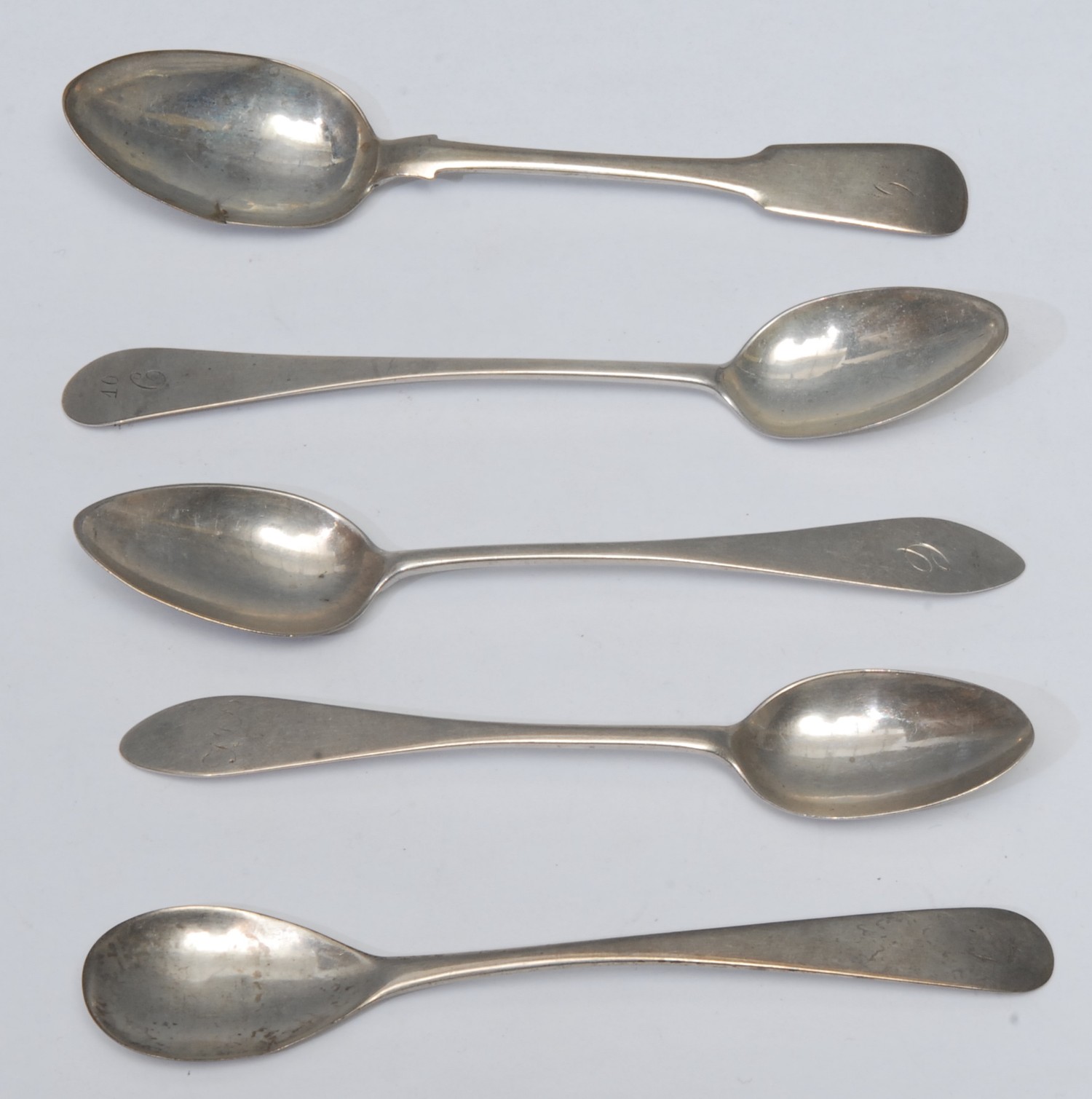 Scottish Provincial Silver - Elgin - a Fiddle pattern teaspoon, Joseph Pozzi & Robert Stewart, c.1840; others various makers (5)