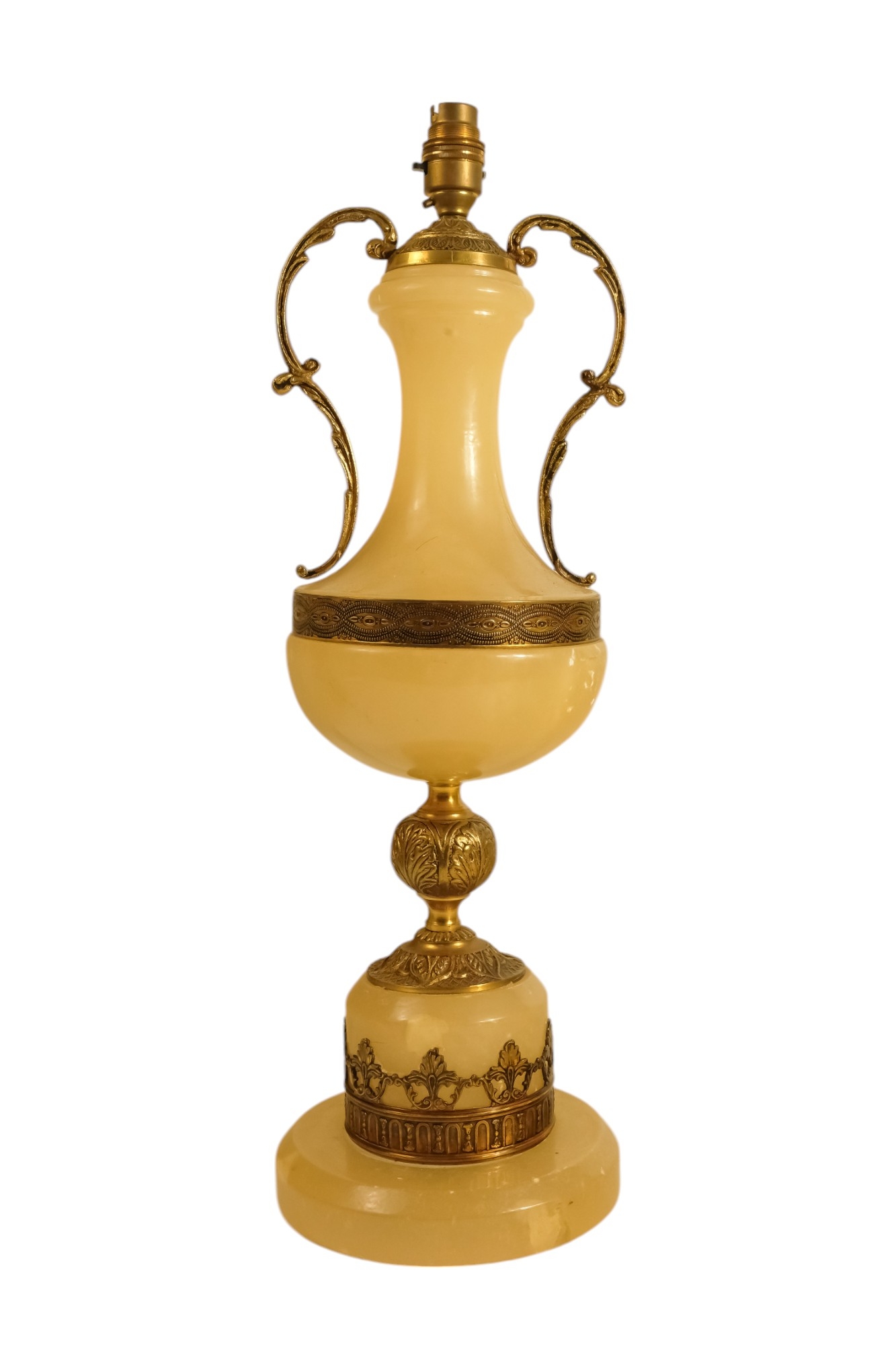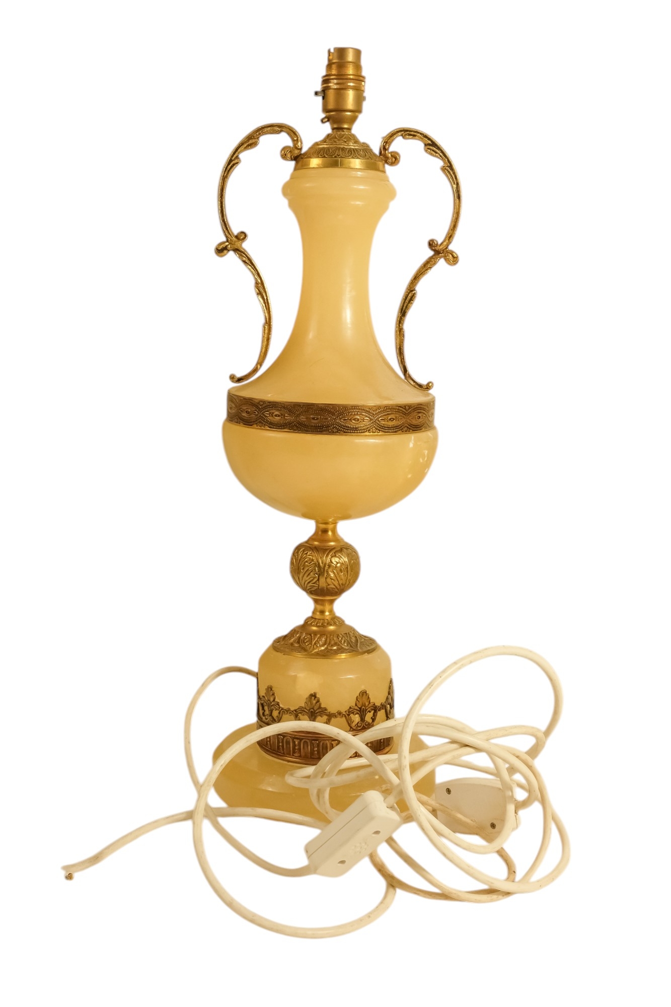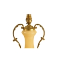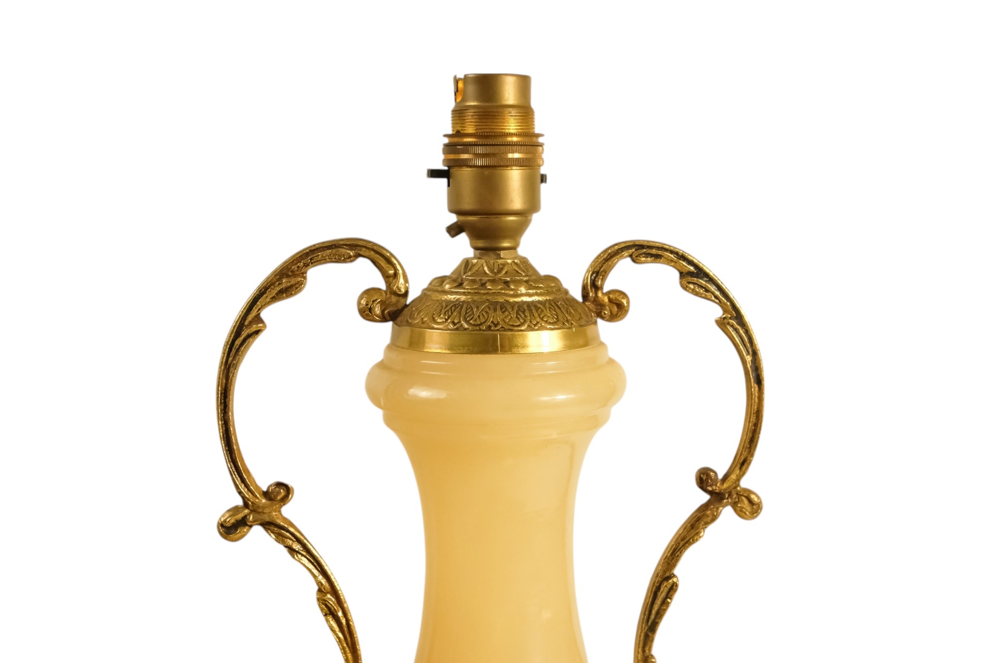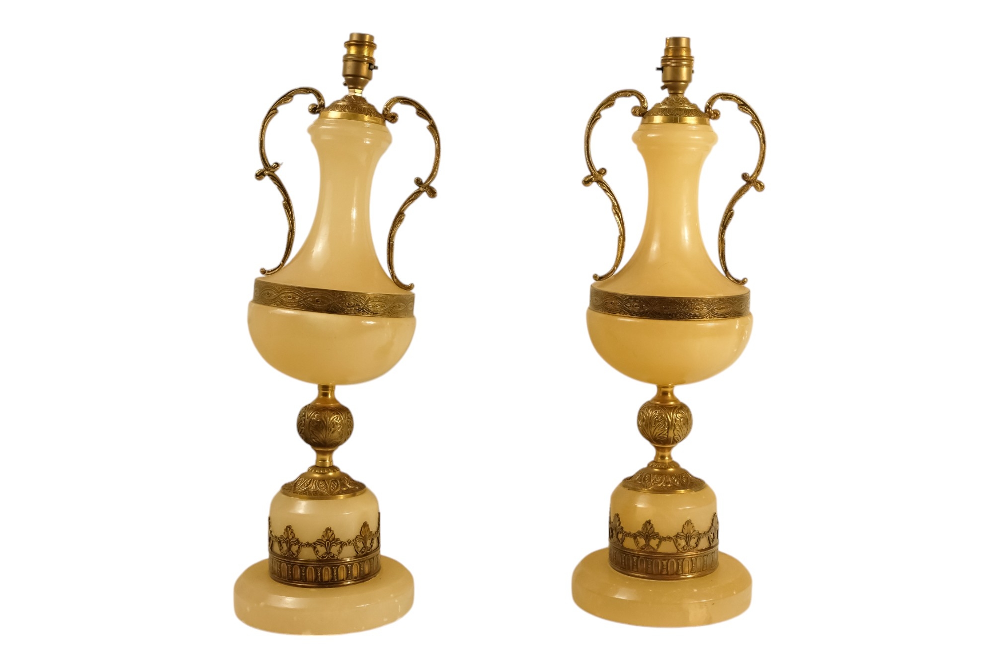 A pair of alabaster and gilt metal table lamps - with twin handles and foliate castings, 58cm high. (2)